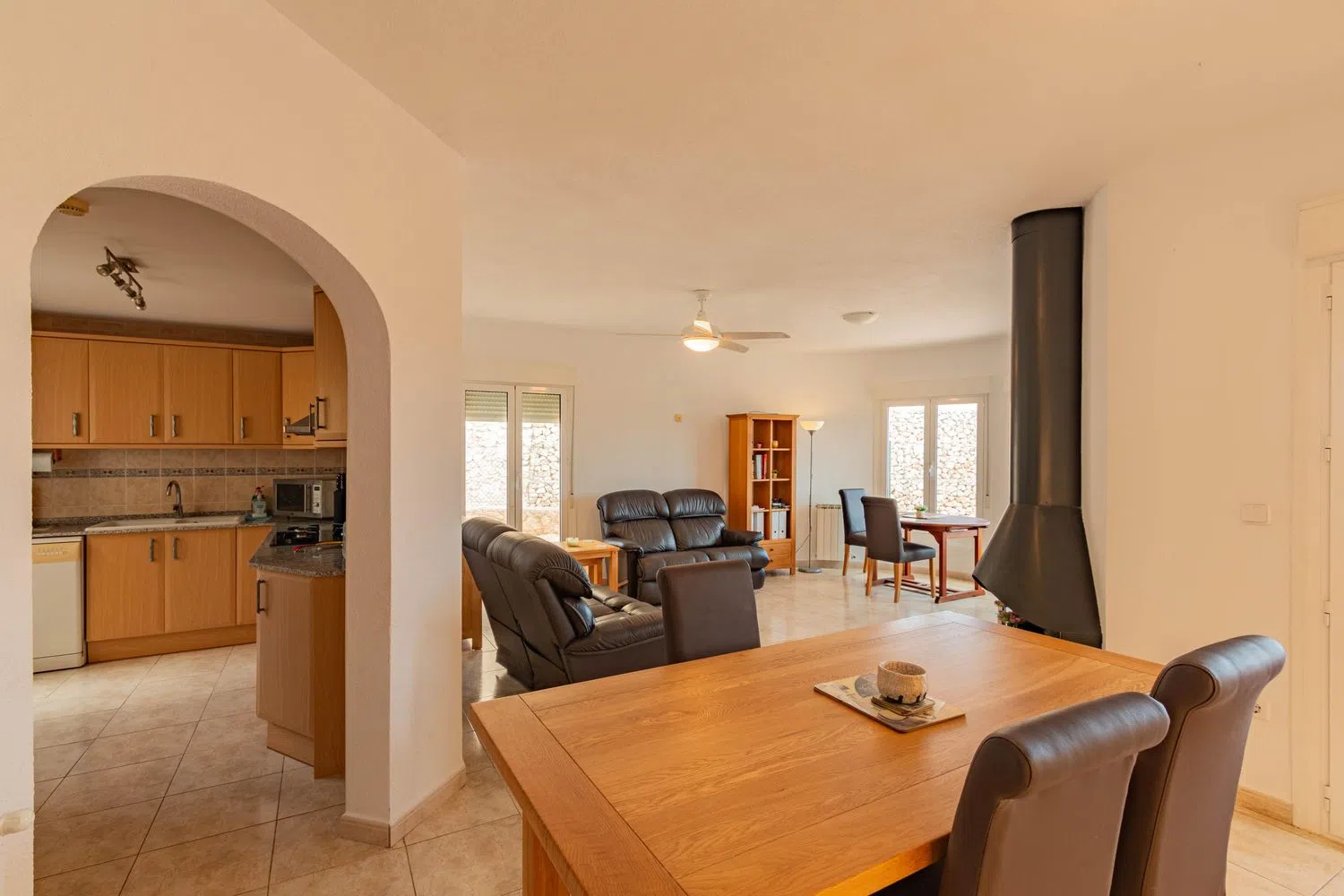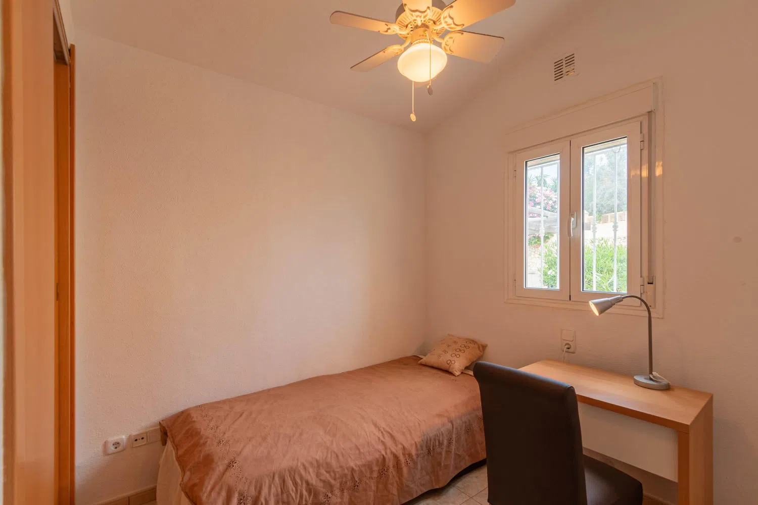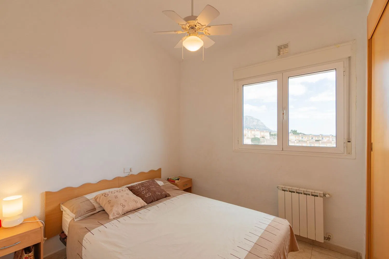 Among its many comforts, the property includes ceiling fans, central heating, and private parking. The added benefits of communal pool access, a spacious private area, and breathtaking vistas highlight this excellent opportunity, perfectly situated between two vibrant coastal towns.