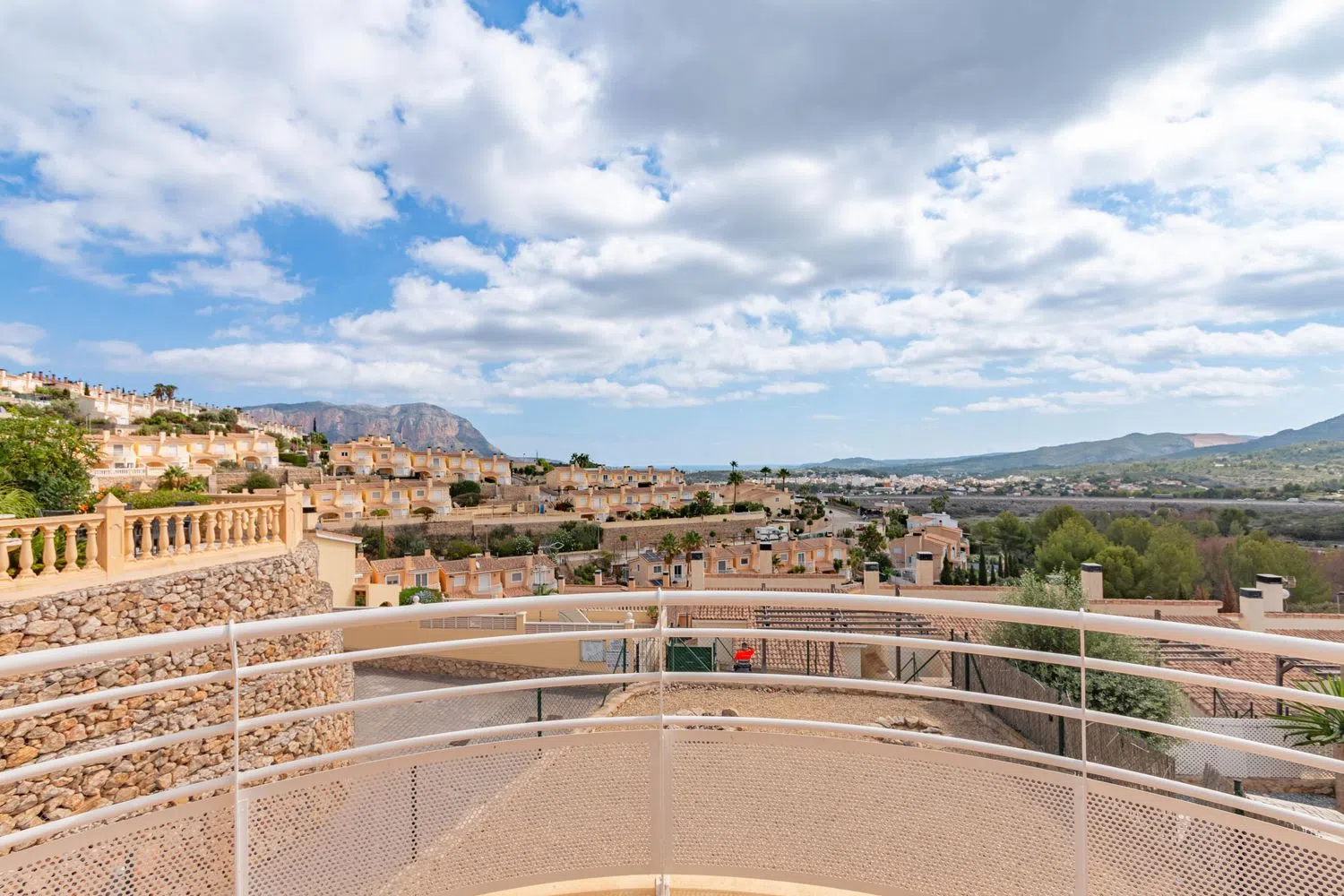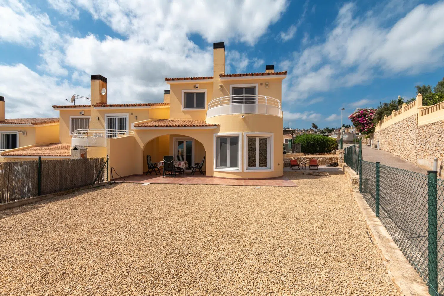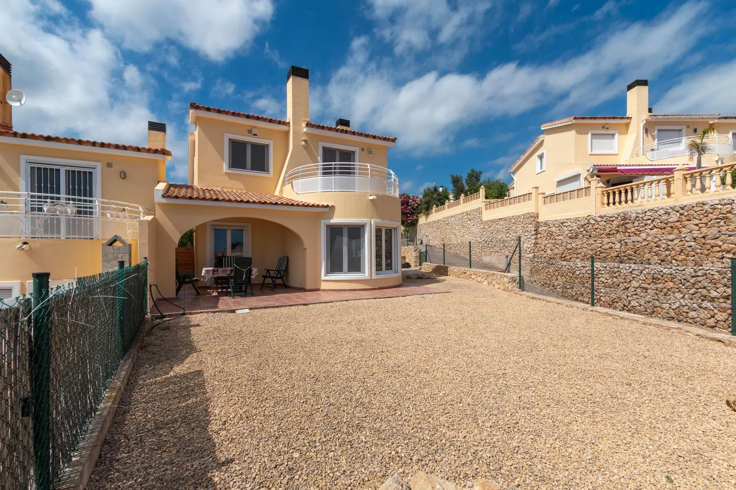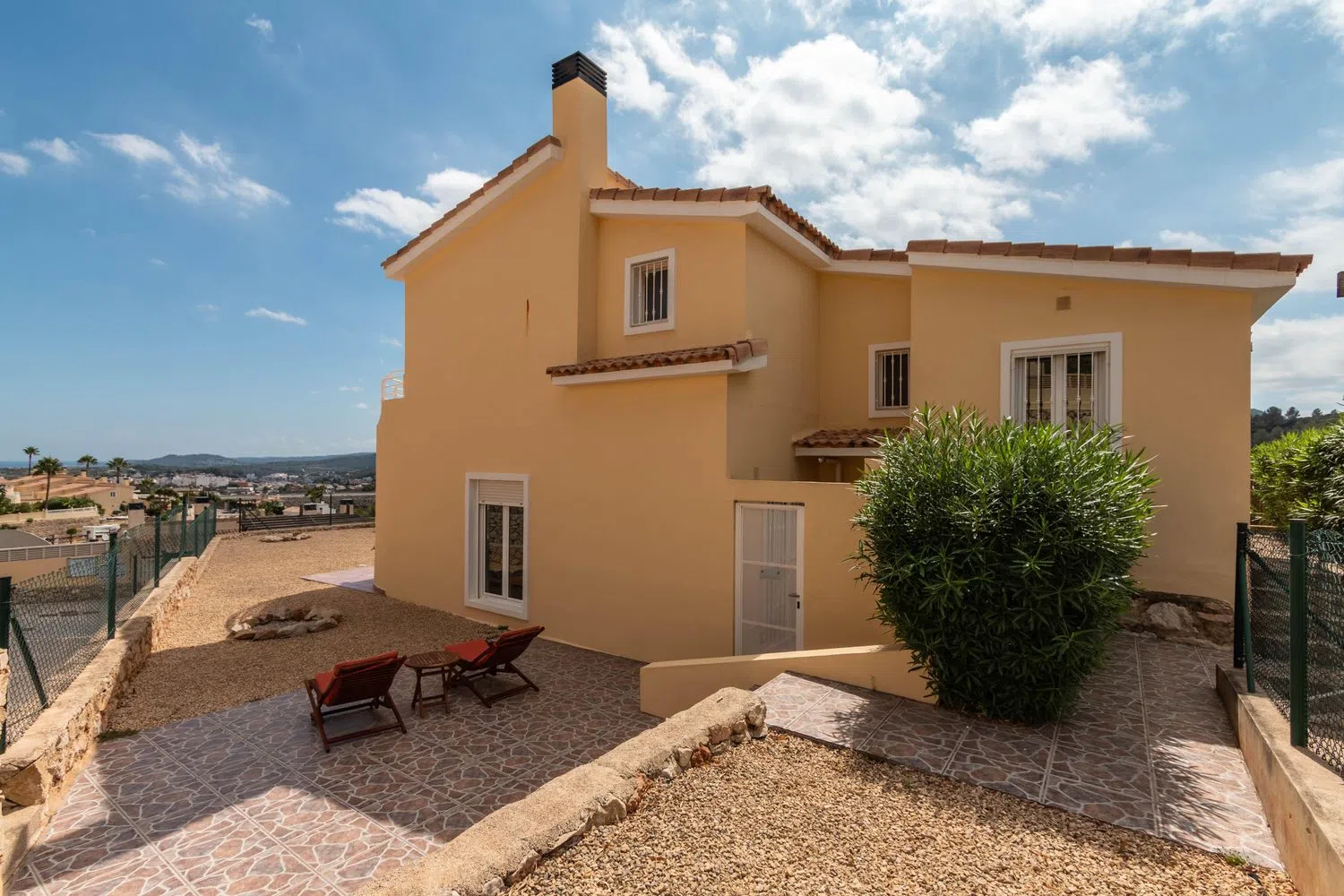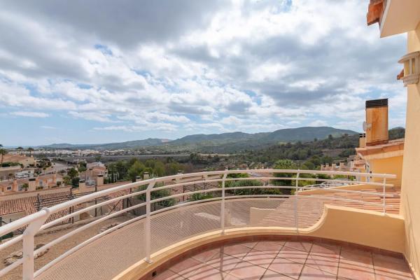 This villa comprises three bedrooms and two bathrooms, with a total built area of 115 square meters, set on a flat, sunlit plot of 319 square meters, presenting delightful views of the surrounding mountains and the sea. The ground floor features an open-plan living and dining area that leads to a covered terrace and a garden, as well as a kitchen and laundry room. The mid-level includes the main entrance, a bedroom, and a bathroom, while the upper floor boasts two additional bedrooms, with the master bedroom offering an en-suite bathroom and a terrace showcasing panoramic views.