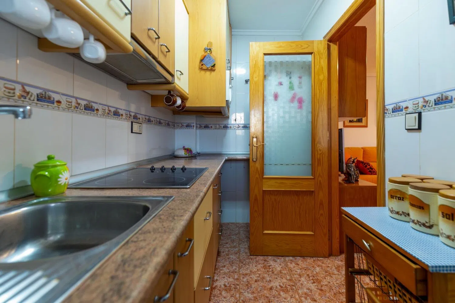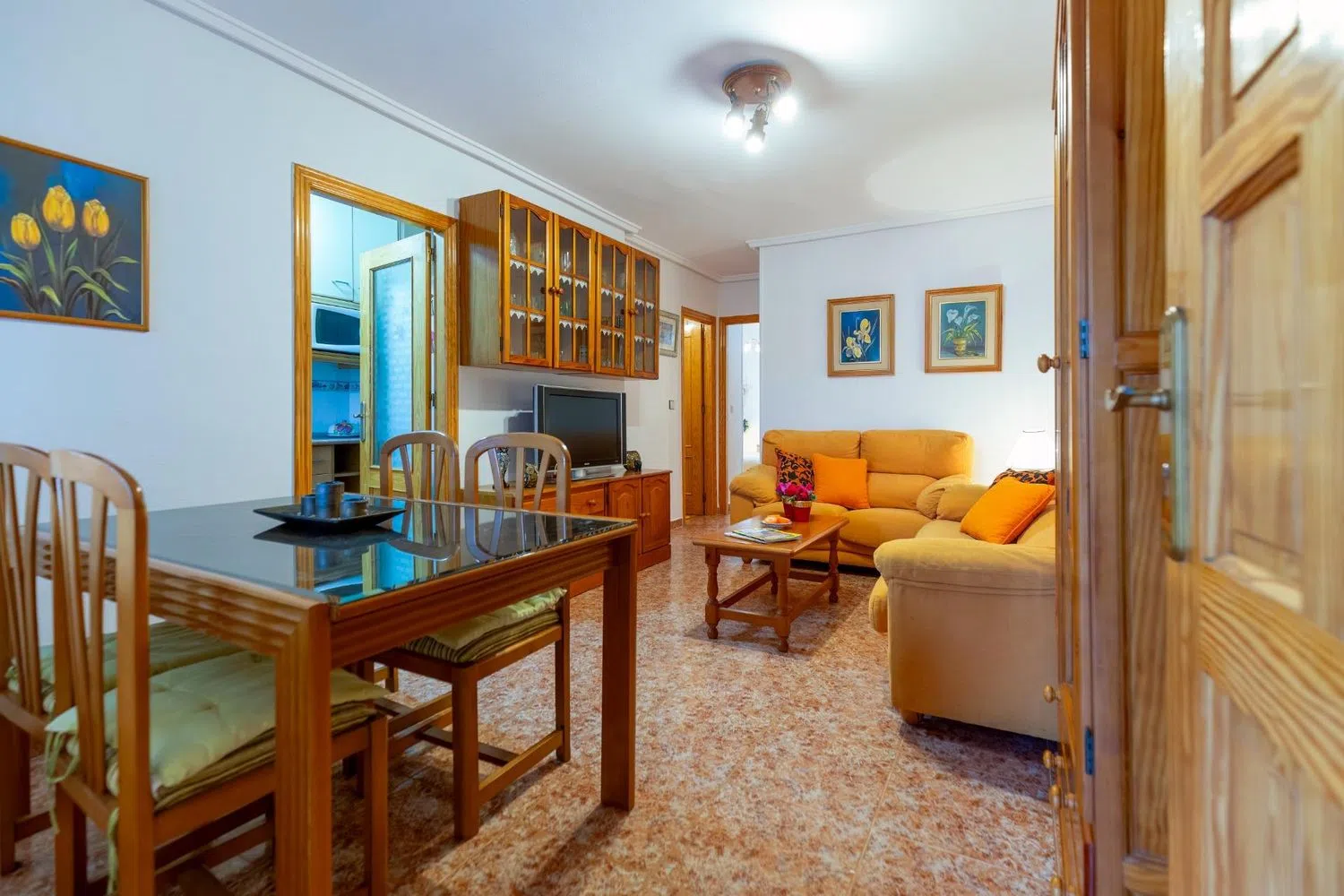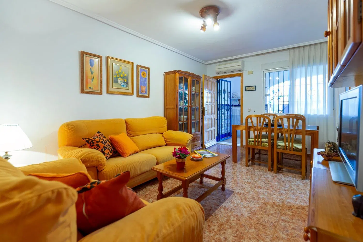 Upon entering the home, you are greeted by a spacious living-dining area accompanied by an independent kitchen, which can be easily converted into an open-plan layout should you prefer. The residence includes two well-proportioned bedrooms, each fitted with built-in sliding wardrobes, a complete bathroom, and a covered patio ideal for laundry use. All windows are made of double-glazed aluminium, ensuring excellent thermal insulation, and additional features such as tiled floors, security grills, and air conditioning enhance comfort and convenience.