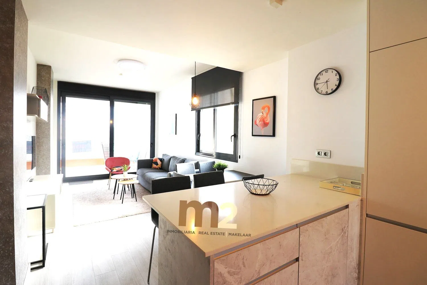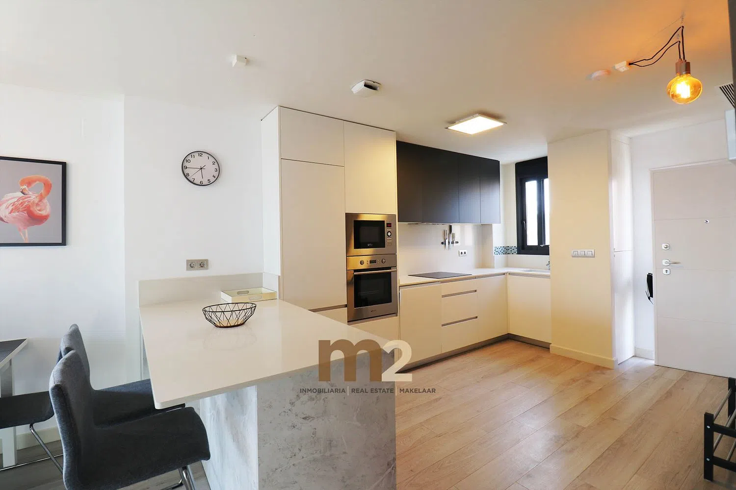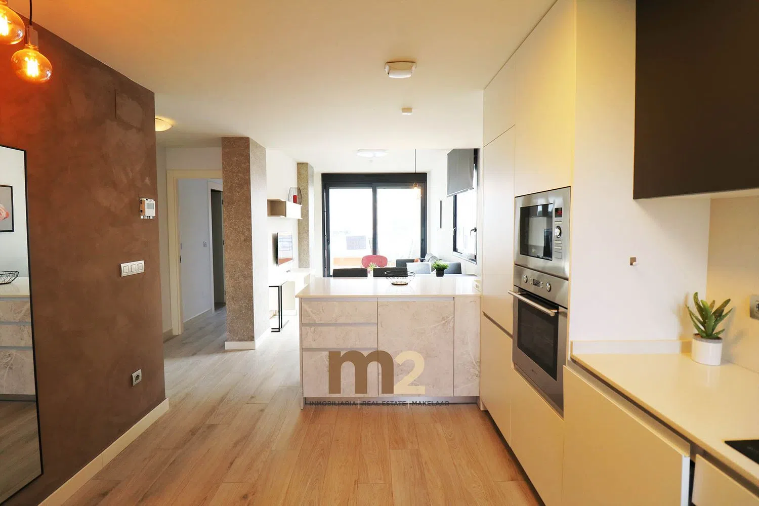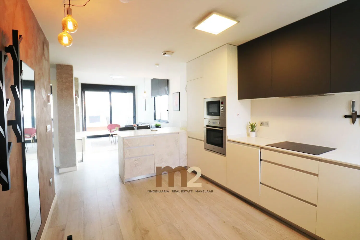 The apartment includes two generous bedrooms, each equipped with built-in wardrobes, and two full bathrooms with modern showers. The kitchen boasts an island and comes fully equipped with integrated appliances, while the expansive living and dining area flows onto a sunny terrace, perfect for enjoying the outdoors.