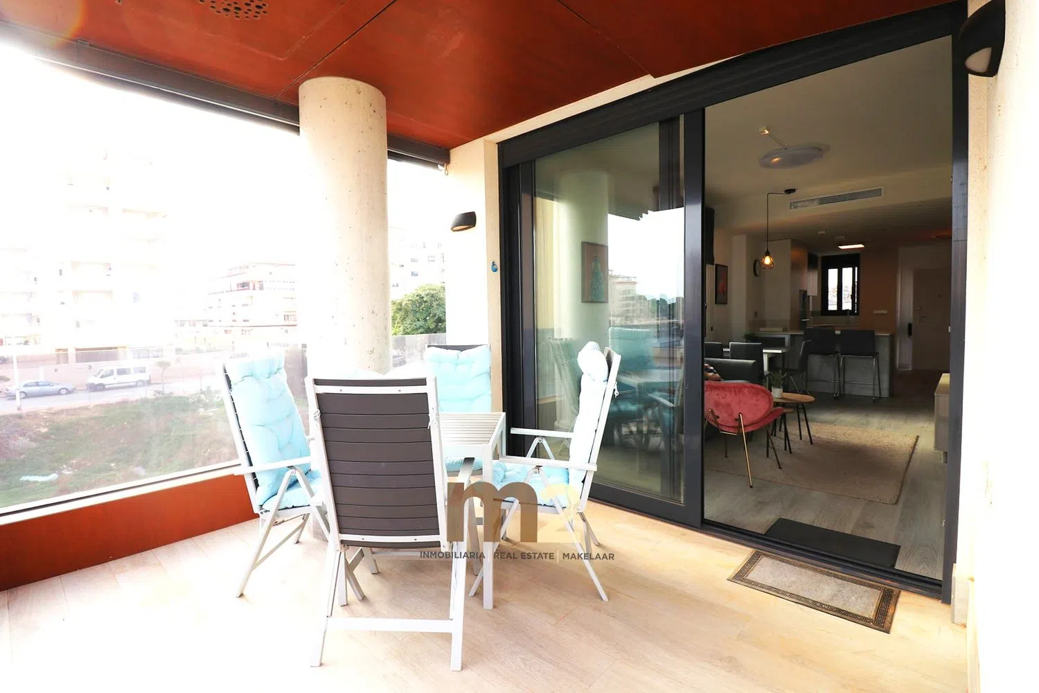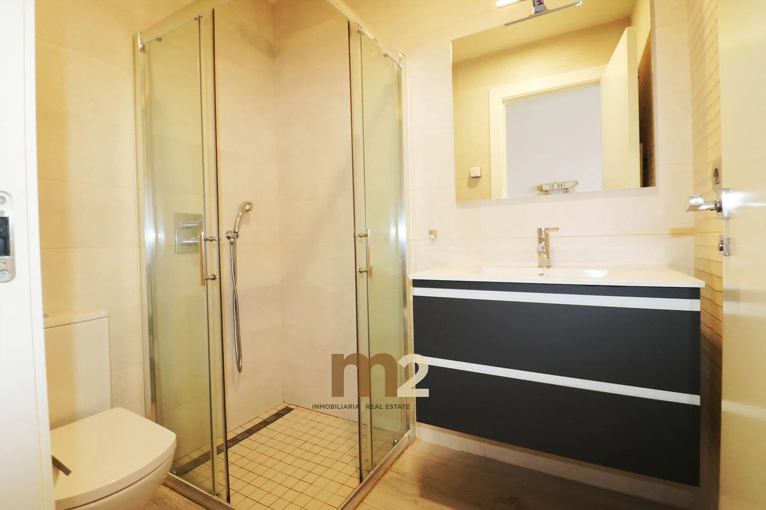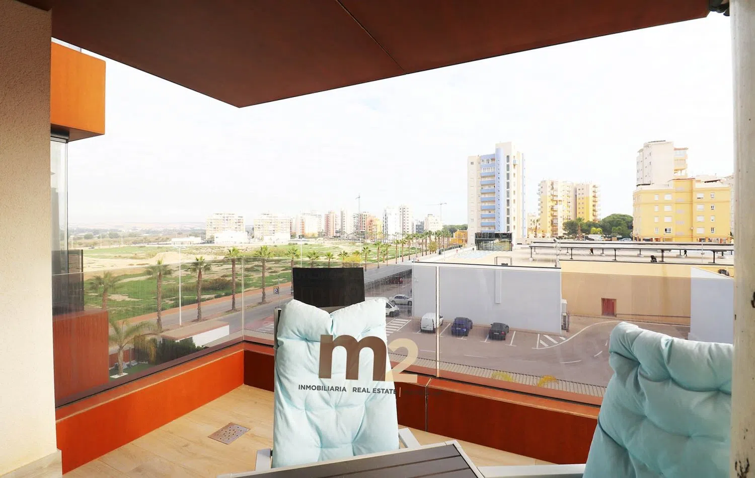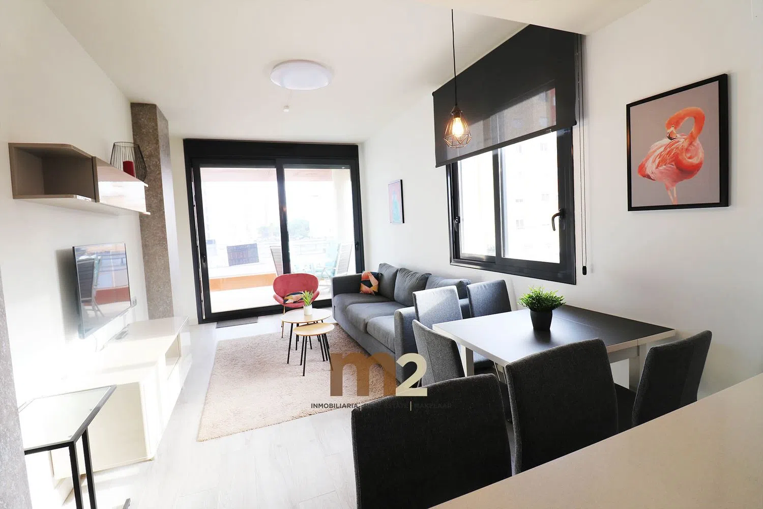The apartment includes two generous bedrooms, each equipped with built-in wardrobes, and two full bathrooms with modern showers. The kitchen boasts an island and comes fully equipped with integrated appliances, while the expansive living and dining area flows onto a sunny terrace, perfect for enjoying the outdoors.