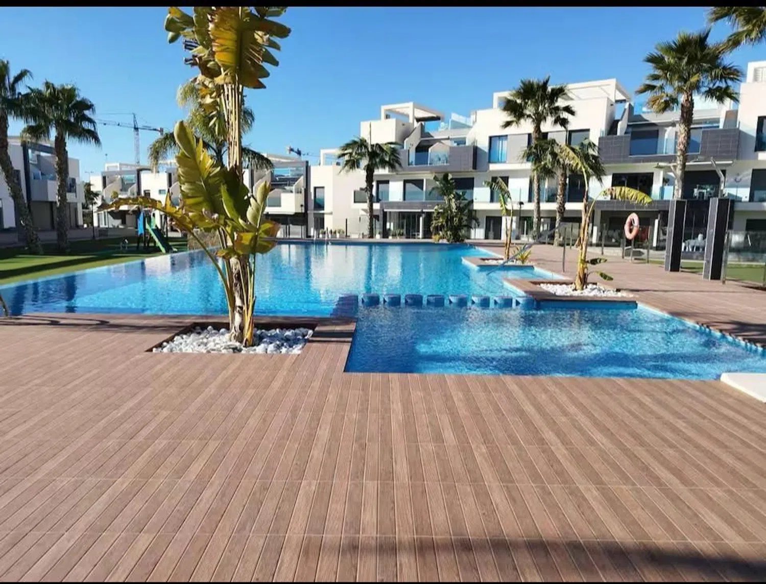 This charming apartment features three spacious double bedrooms and two modern bathrooms, complemented by an open-plan kitchen and living area. A generous terrace overlooks the beautiful communal pool, and there is convenient underground parking.