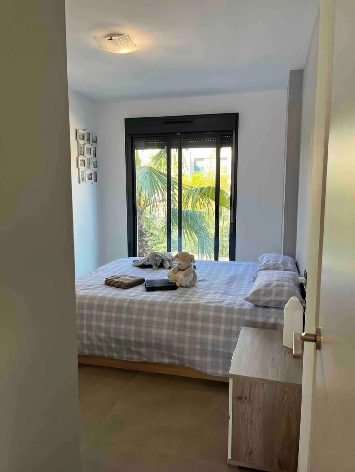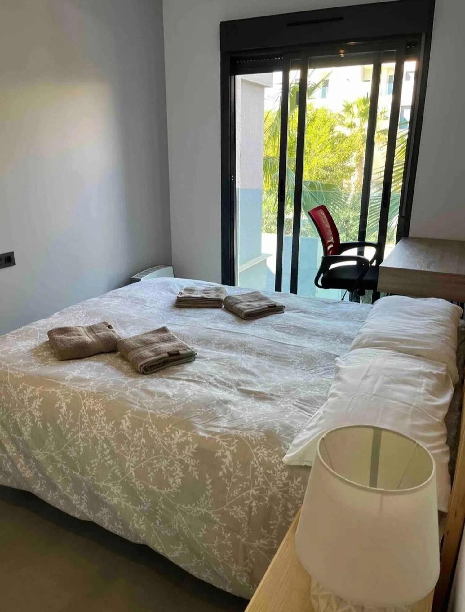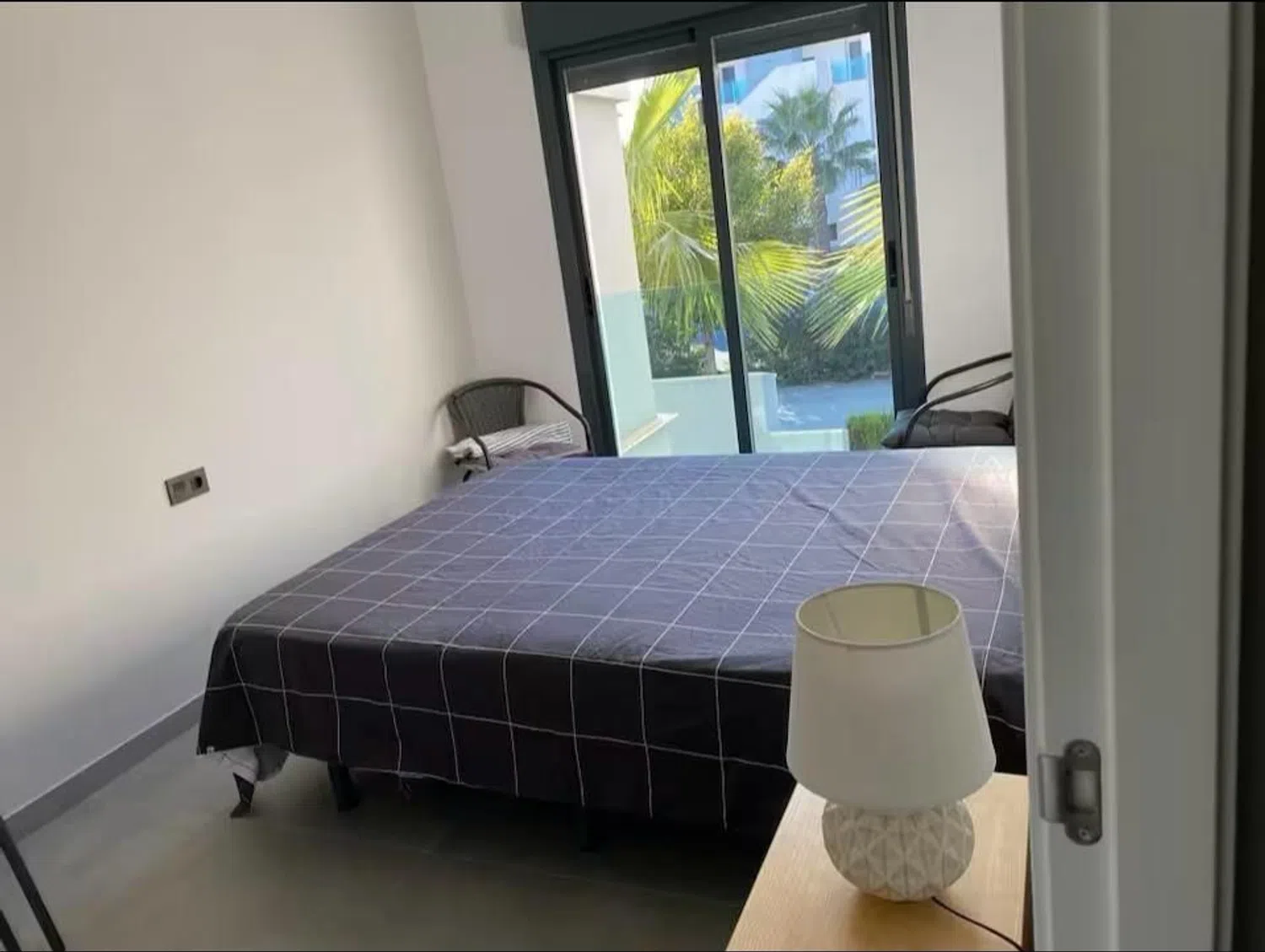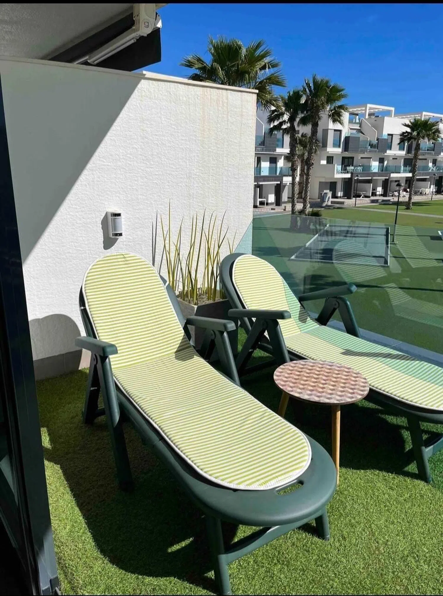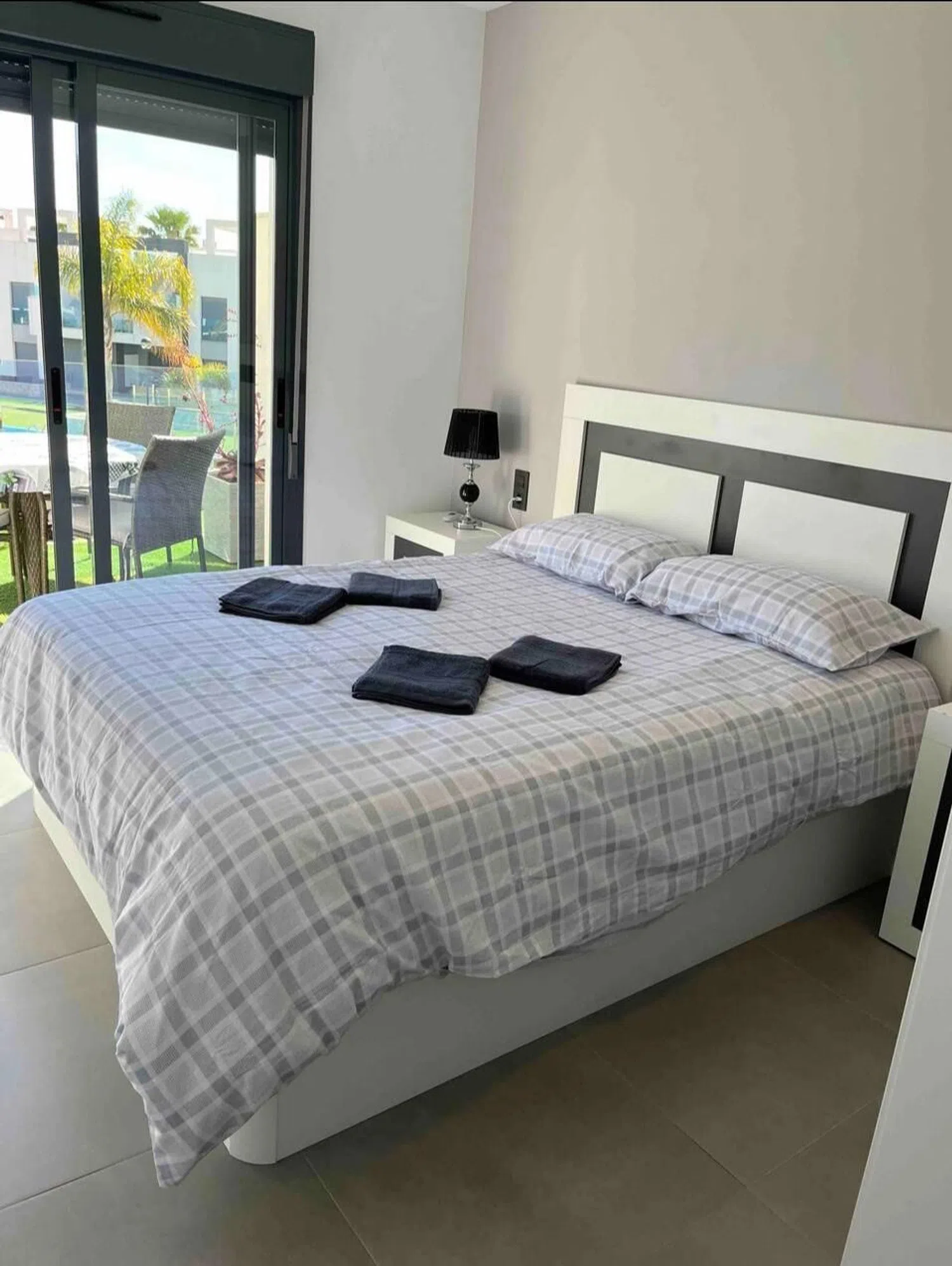 Accessed from the living room, the approximately 17 m² terrace offers pleasant views of the complex, including the pool and communal gardens. To the right, three double bedrooms with fitted wardrobes and air conditioning await. The master bedroom boasts a comfortable double bed and a modern en-suite bathroom featuring a walk-in shower. The second bathroom is equally stylish and equipped with a shower cabin.