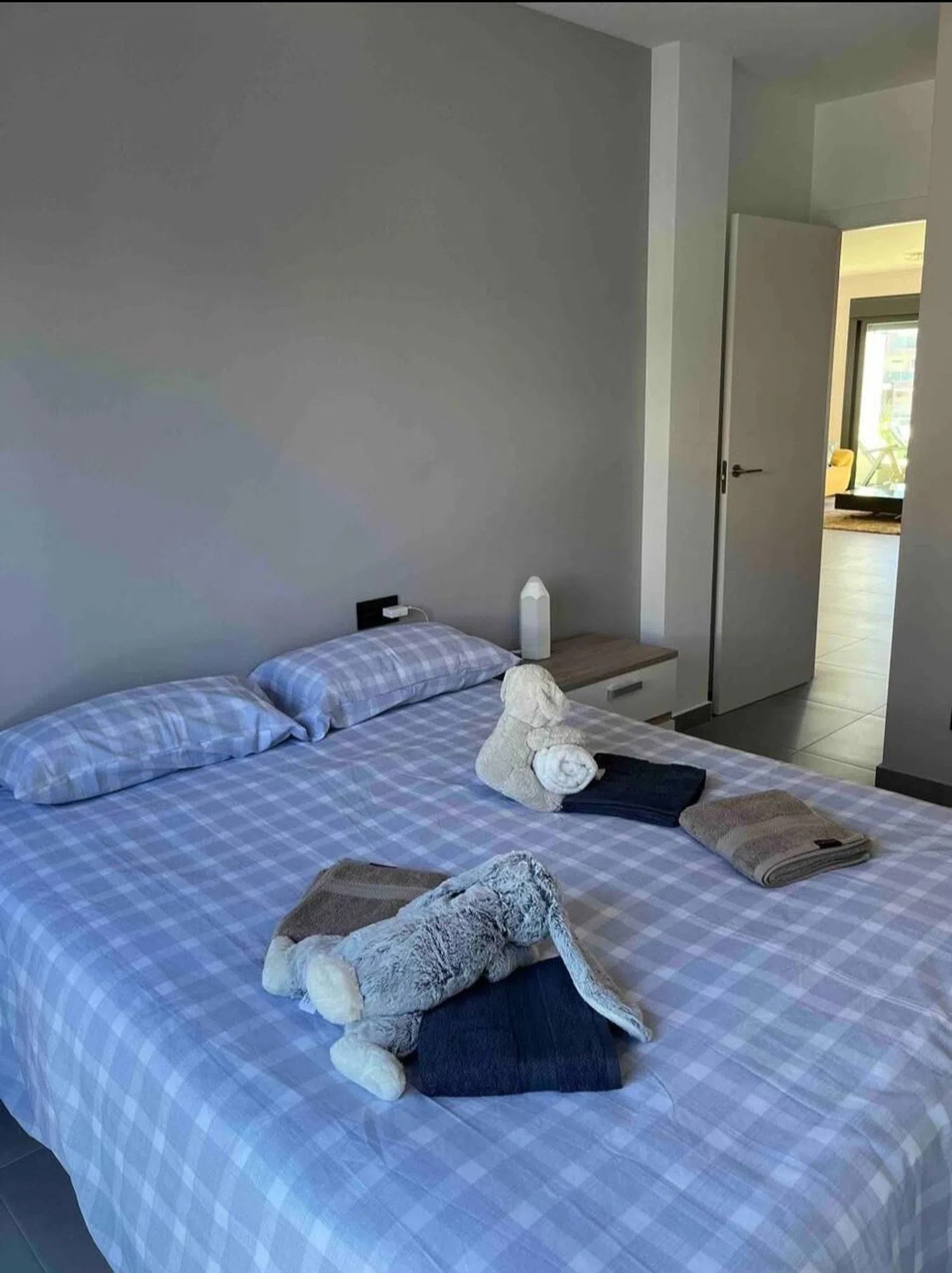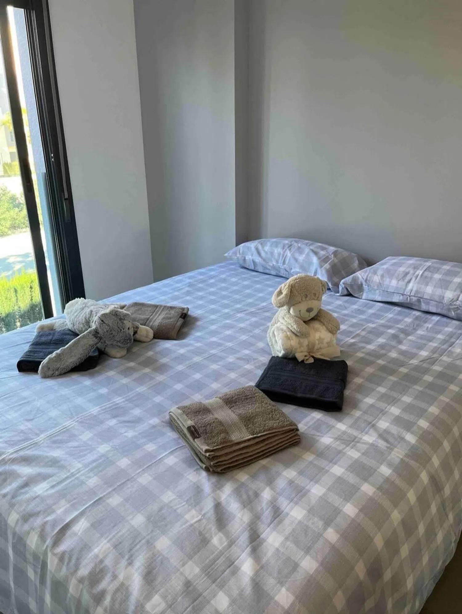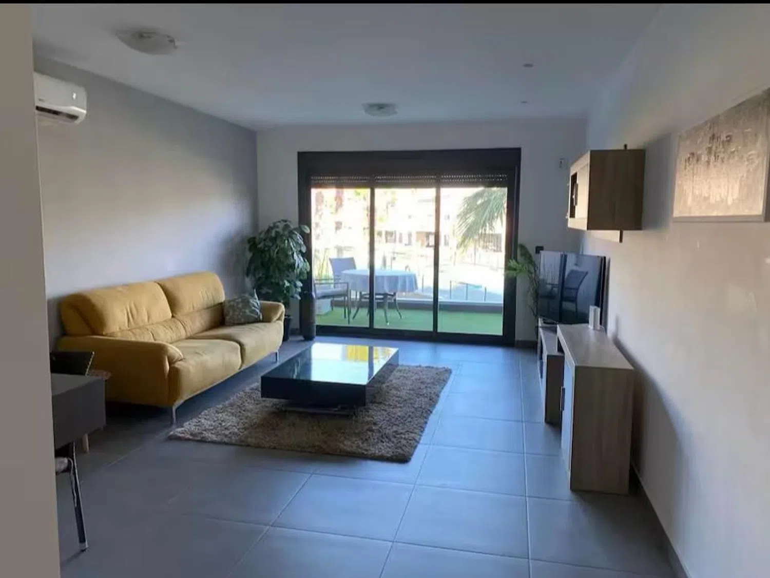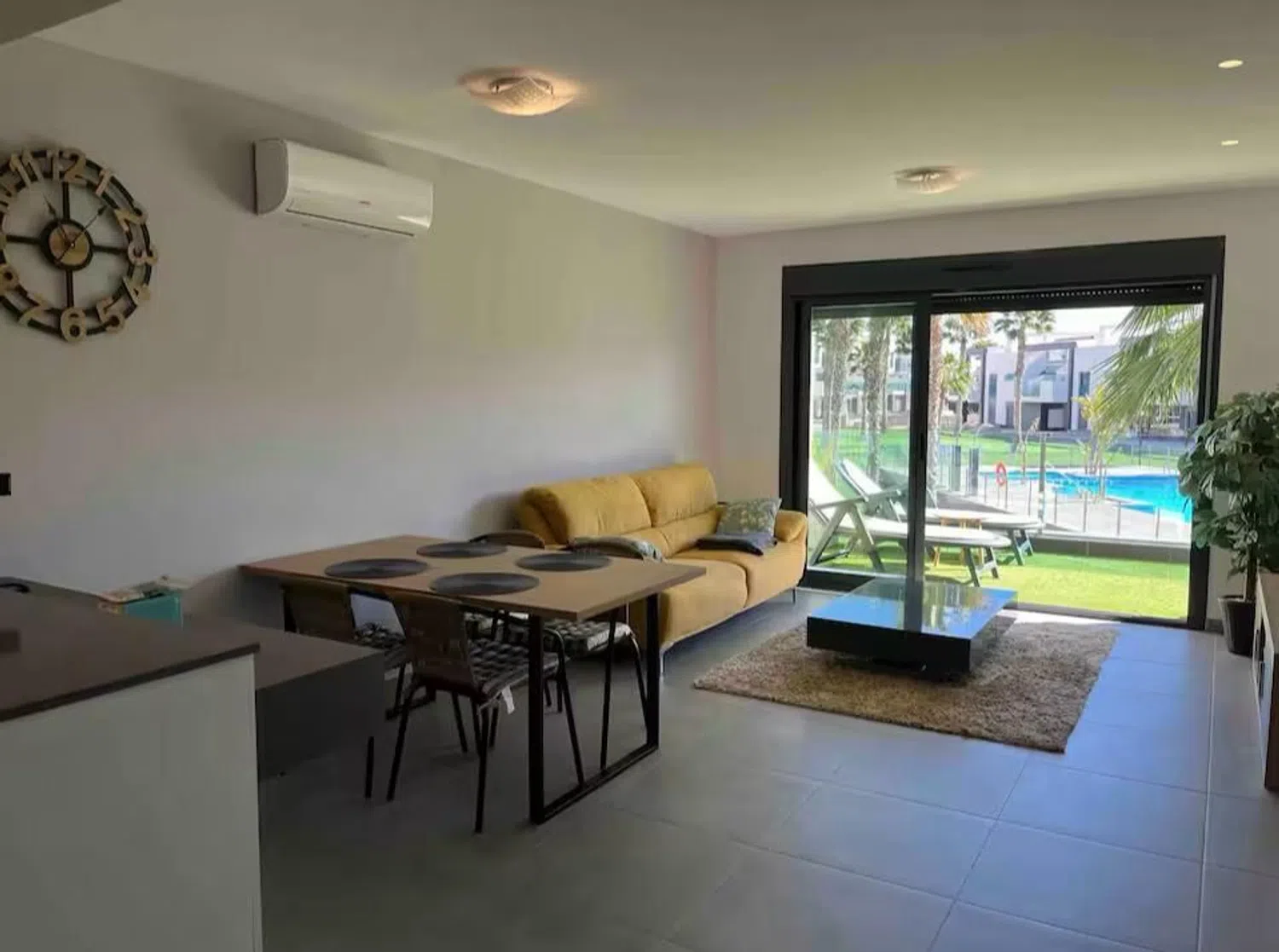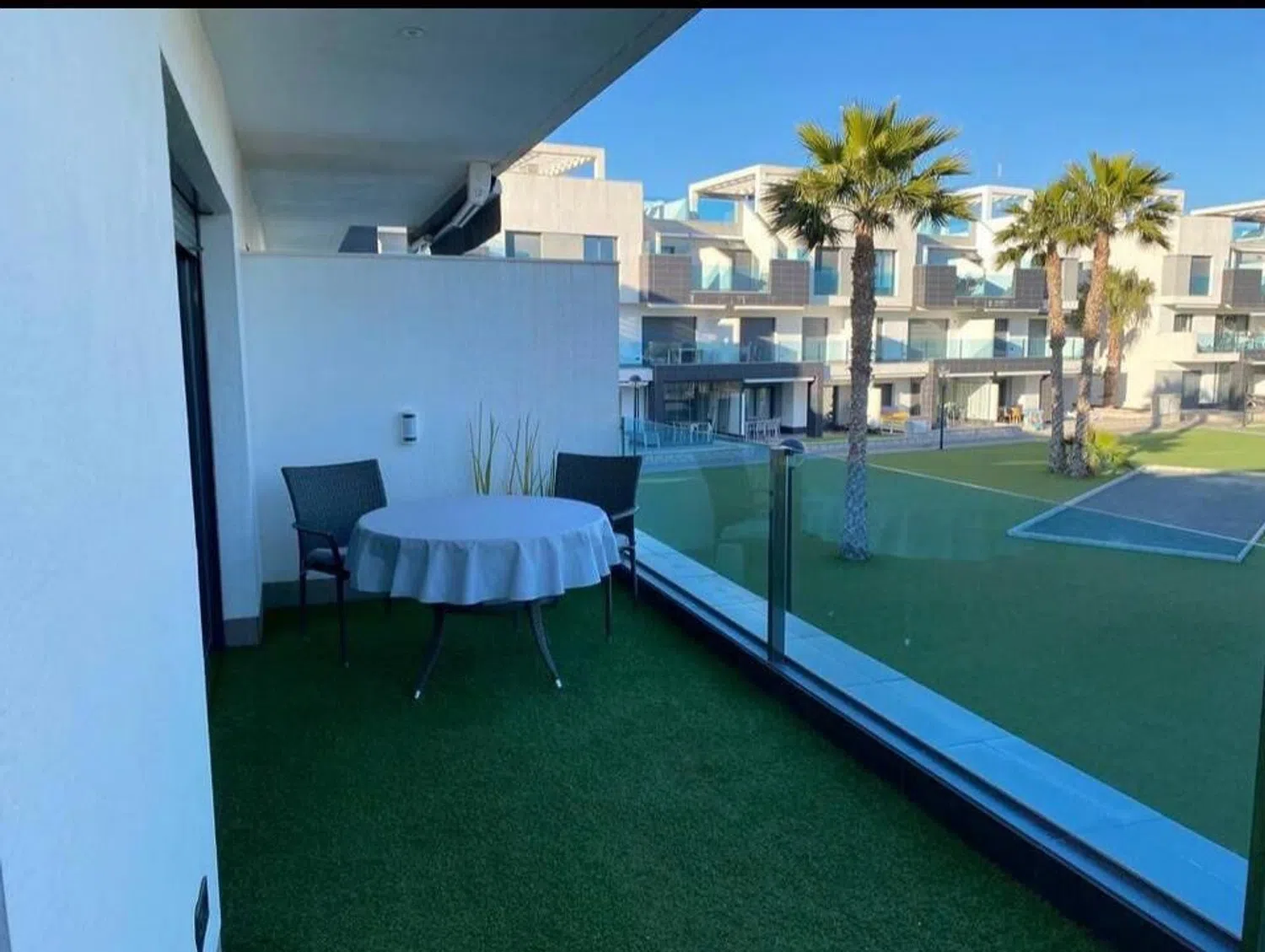 Accessed from the living room, the approximately 17 m² terrace offers pleasant views of the complex, including the pool and communal gardens. To the right, three double bedrooms with fitted wardrobes and air conditioning await. The master bedroom boasts a comfortable double bed and a modern en-suite bathroom featuring a walk-in shower. The second bathroom is equally stylish and equipped with a shower cabin.