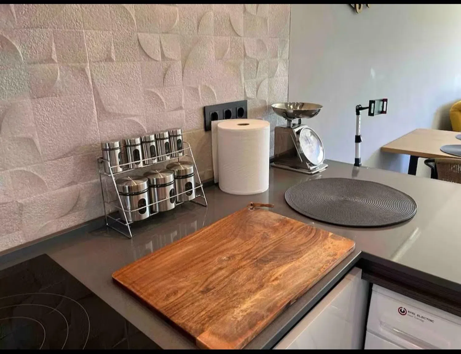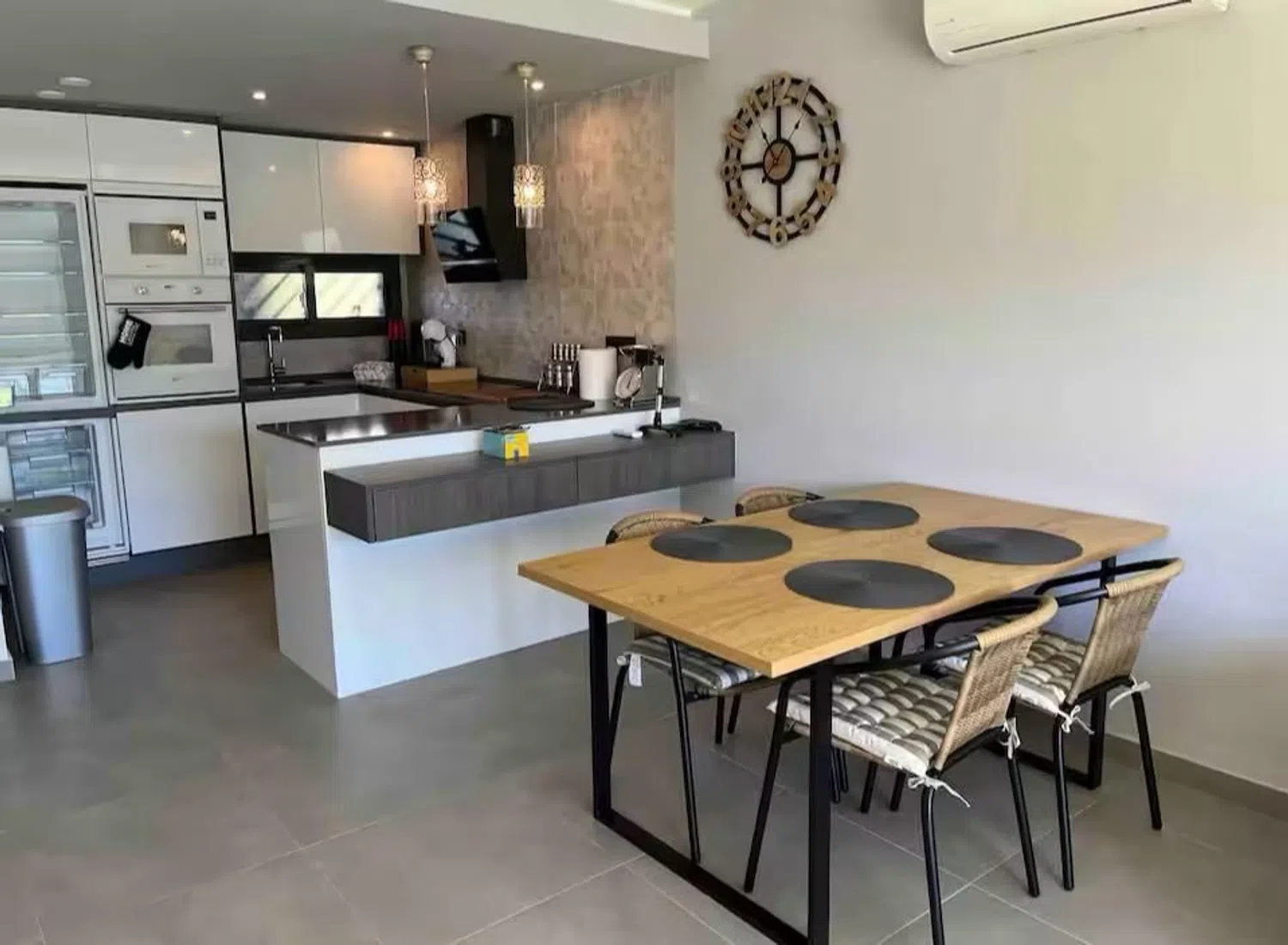 On the left, you’ll find a contemporary kitchen fully equipped with essential appliances, including an induction hob, large fridge and freezer, dishwasher, built-in oven, and microwave. The expansive countertops provide ample space for all your culinary endeavors.