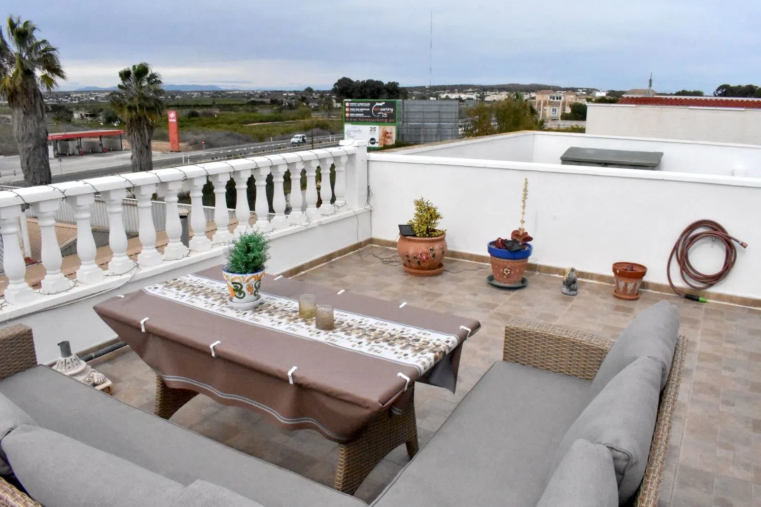 Bienvenido a esta acogedora y funcional casa adosada, perfecta para aquellos que buscan comodidad y vida práctica. En la parte delantera encontrará una terraza de 21 m² con toldo y mucho espacio de almacenamiento, lo que da una primera impresión perfecta de esta casa. En el interior de la casa, será recibido por una cocina abierta y luminosa con comedor que fluye a la perfección hacia la sala de estar. En la primera planta hay un dormitorio, un baño y una habitación que actualmente se utiliza como recibidor/dormitorio adicional. Desde aquí también se puede llegar a un trastero y a las escaleras que conducen a la segunda planta. En la segunda planta se encuentra un amplio dormitorio con armario empotrado y un baño privado en suite. Desde el dormitorio se accede a una preciosa terraza de 18 m², así como a un trastero. Una escalera conduce a la fantástica terraza de la azotea de 25 m², donde se puede disfrutar de una maravillosa vista, junto con otro espacio de almacenamiento. La segunda planta fue construida en 2011 y ofrece detalles modernos como calefacción por suelo radiante en ambos baños, así como aire acondicionado instalado tanto en la primera como en la segunda planta. La propiedad se vende amueblada y con todos los electrodomésticos. Póngase en contacto con nosotros para obtener más información o para reservar una visita.