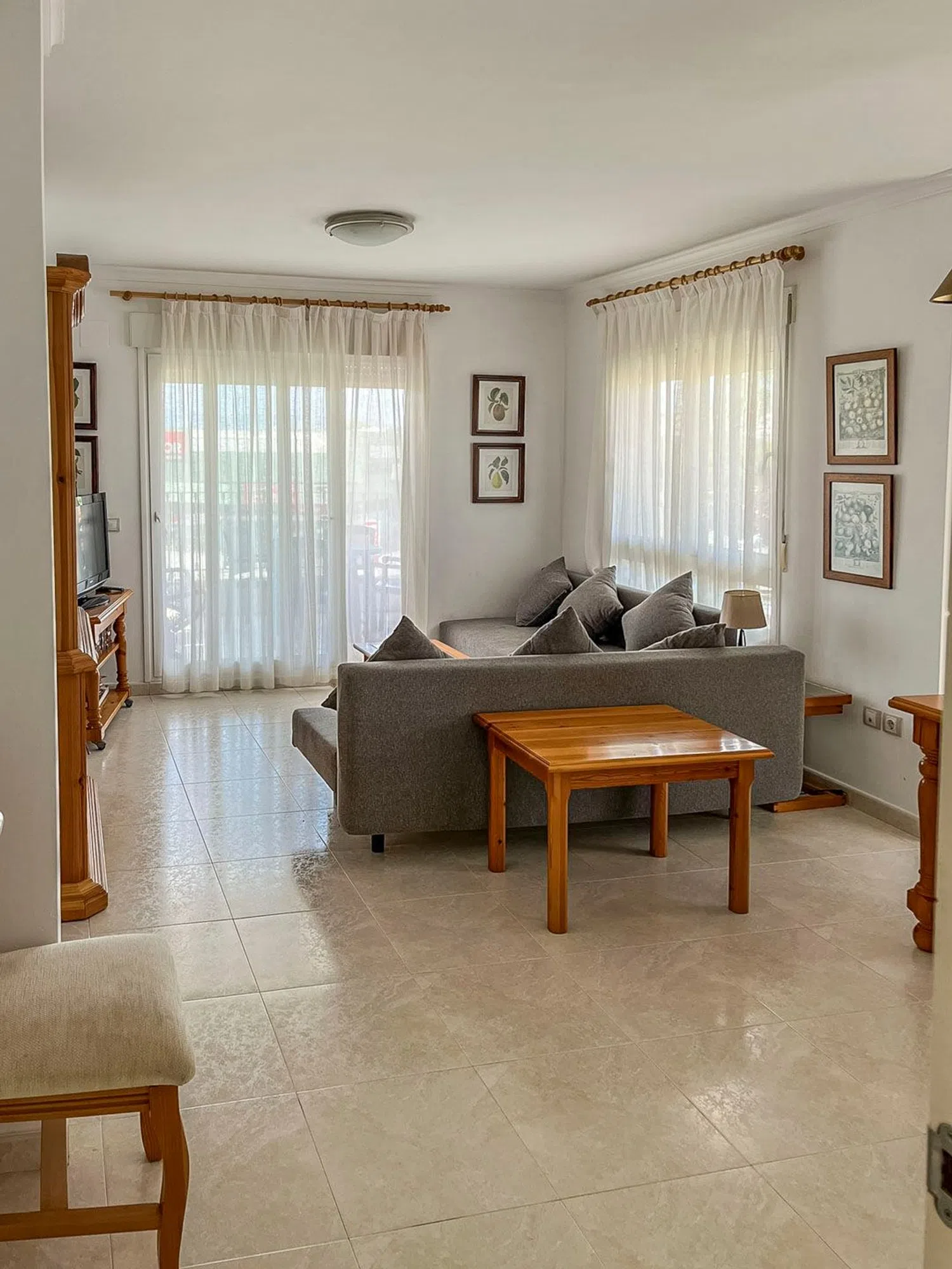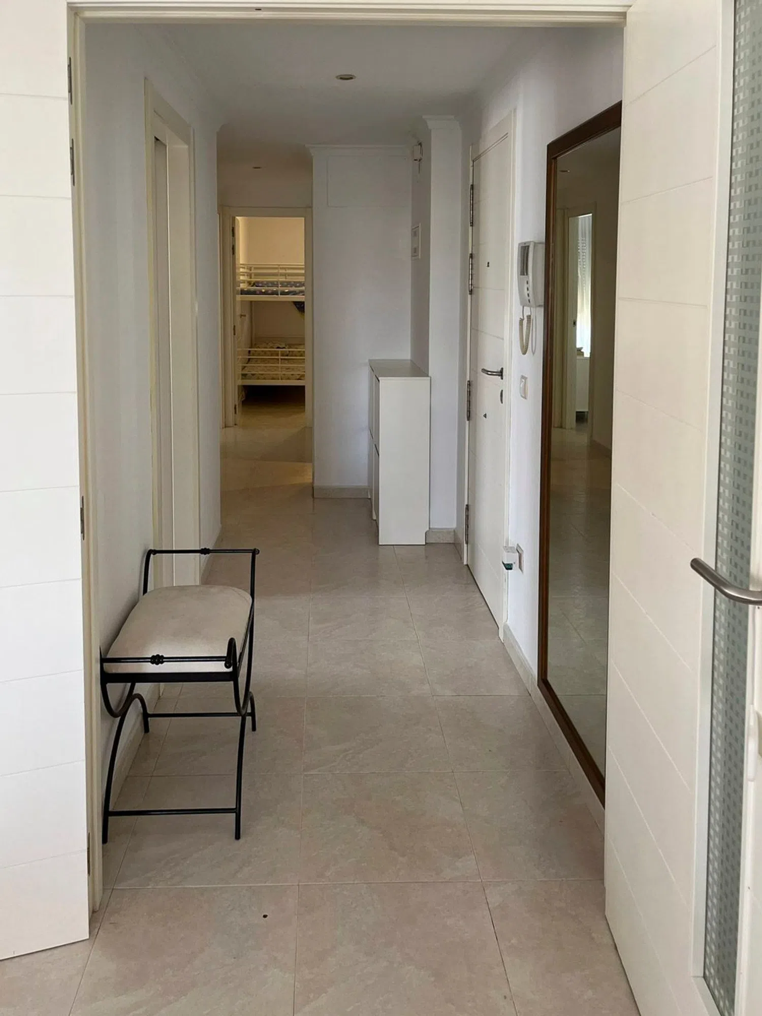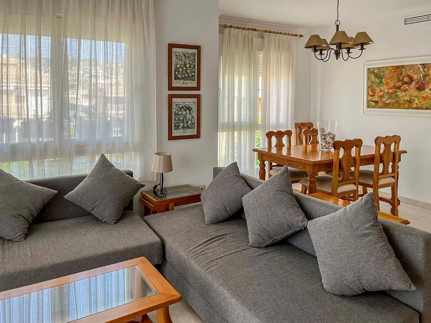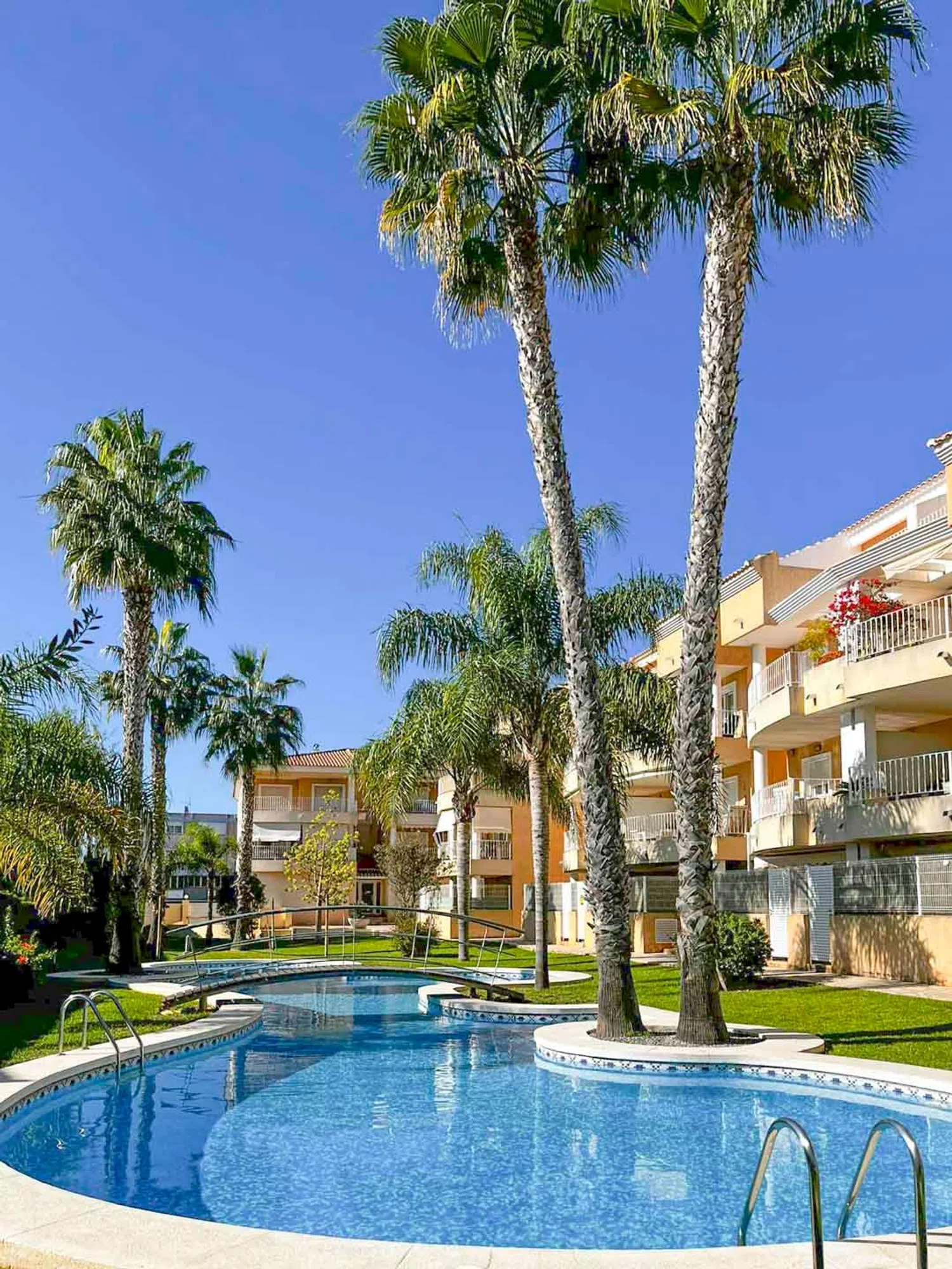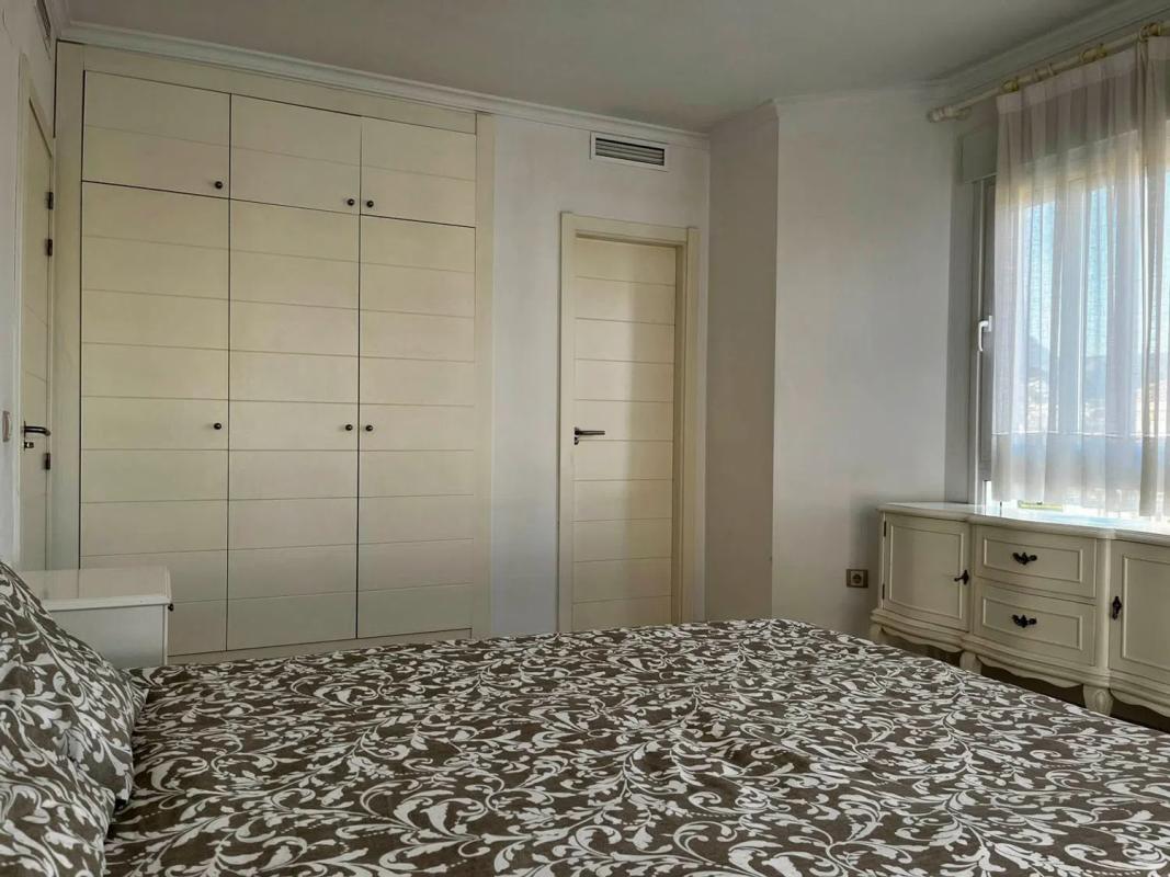 This apartment is located on the second floor of a well-maintained building, close to both the sea and the city center. It features a spacious living and dining area, a kitchen with an adjacent laundry room, a double bedroom with an en-suite bathroom, and another double bedroom with a separate bathroom. Additionally, there is a covered terrace measuring 22 m². The apartment complex boasts a large communal swimming pool surrounded by a landscaped garden with palm trees. The beach is just a five-minute walk away, and both the port and city center are reachable in about 15 minutes.