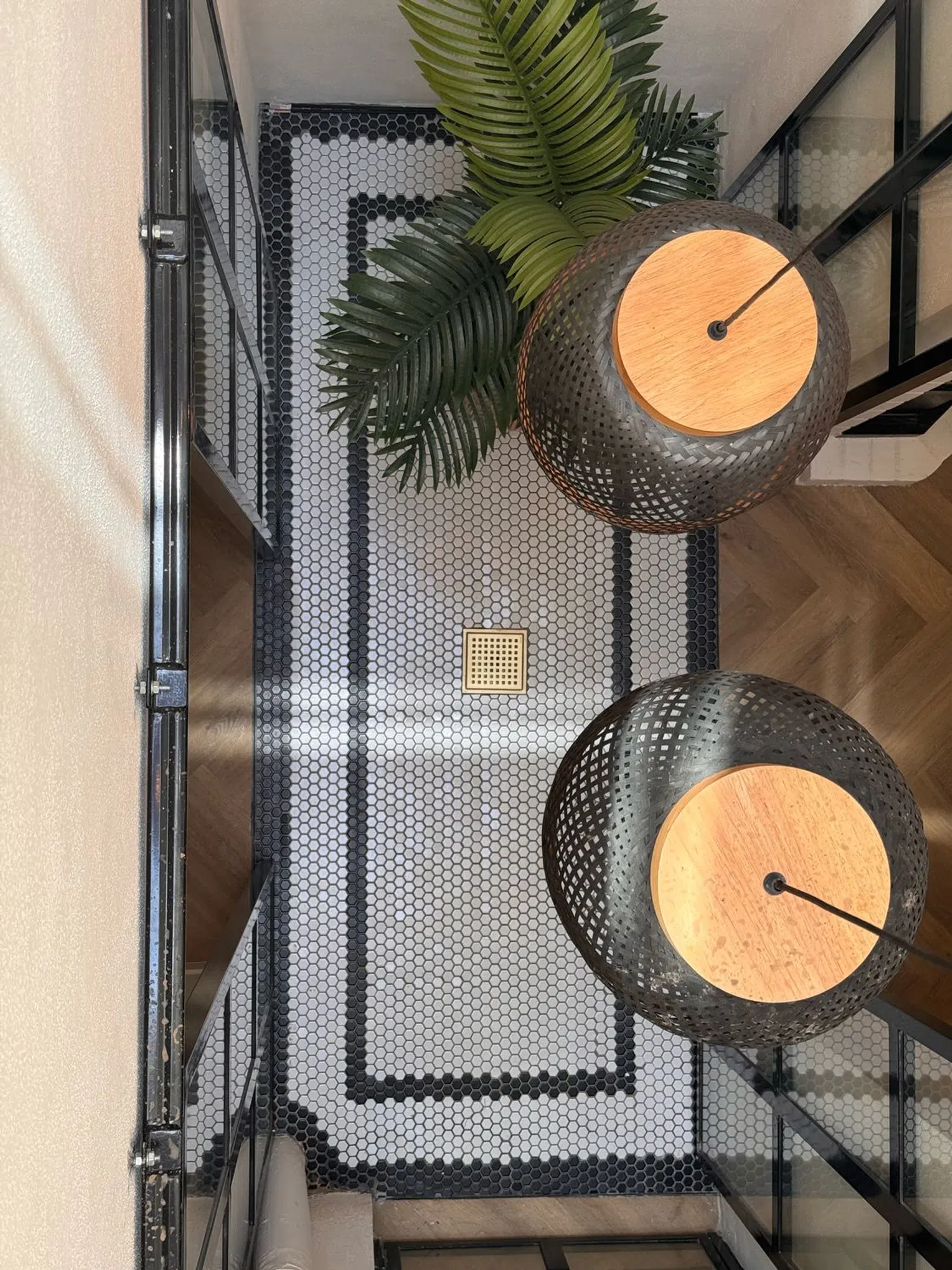 The ground floor boasts a south-facing patio, leading to a spacious and bright entrance hall. The entrance is adorned with sleek glass and steel doors, guiding you into the open-plan living and dining area. Here, you will find a conveniently located bathroom and an exquisite interior courtyard, which serves as a delightful feature connecting the dining area and kitchen.