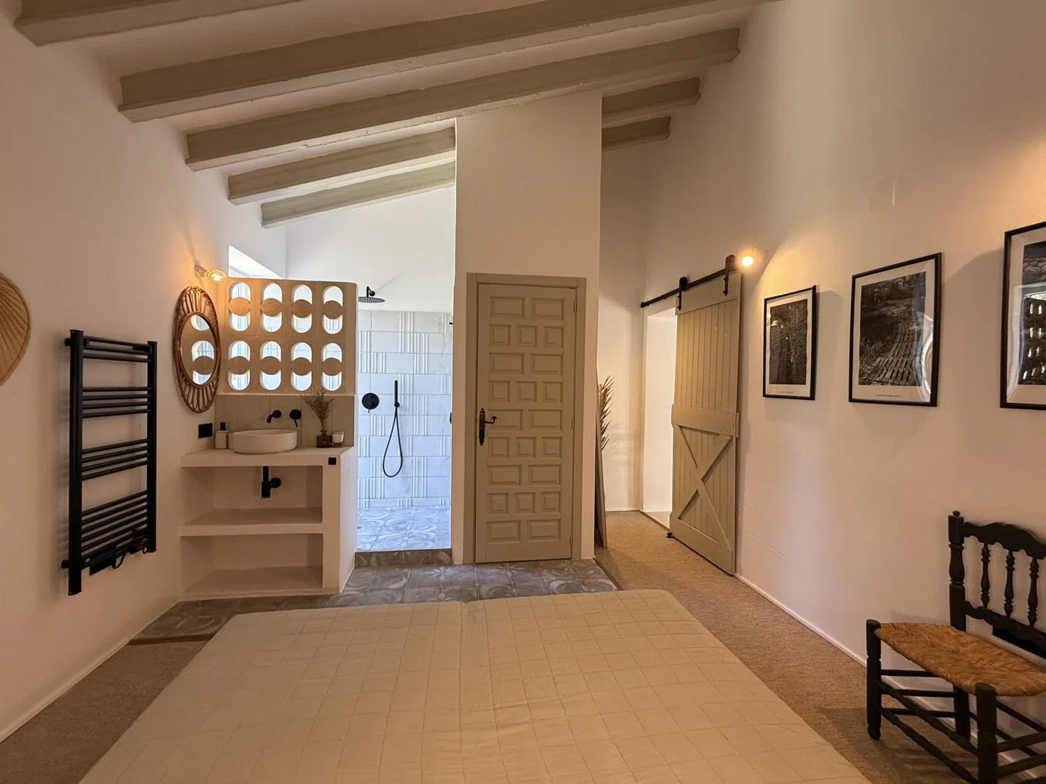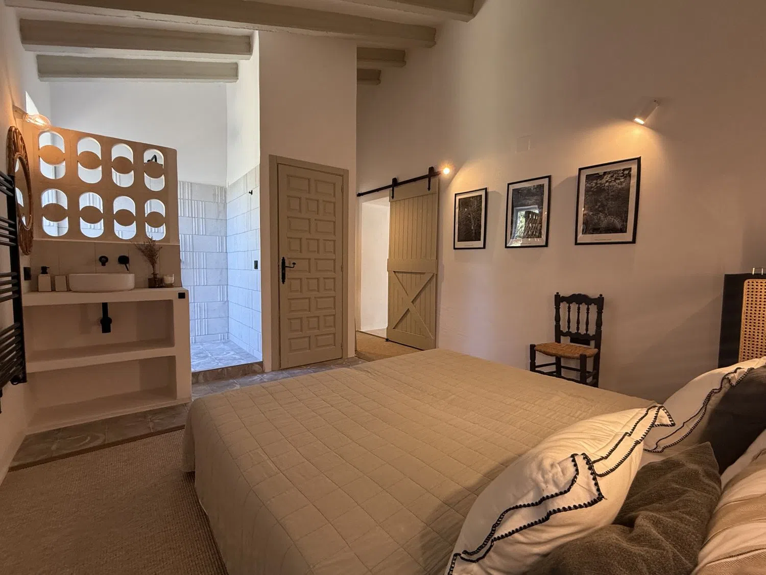 The villa features two elegant ground-floor bedrooms, each equipped with its own en-suite bathroom, ensuring both privacy and comfort. On the upper level, a third bedroom awaits, accompanied by a separate bathroom and a private terrace offering stunning vistas—a perfect spot to bask in the sun and enjoy a moment of tranquility.