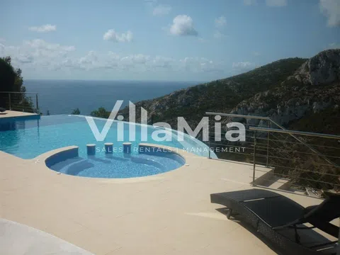 Villa de lujo de primera línea en un entorno de ensueño con impresionantes vistas al mar. Esta villa está ubicada en uno de los entornos más prestigiosos de la Costa Blanca, enclavada entre montañas y mar, en una zona muy privada de Granadella, a las afueras de Jávea, con aparcamiento privado. La villa está a poca distancia en coche de restaurantes, tiendas, playas y puertos deportivos. Los espacios exteriores de la villa se distribuyen en diferentes niveles e incluyen varias terrazas, zonas de estar al aire libre, un comedor al aire libre y una zona de barbacoa. La villa cuenta con jacuzzi y una gran piscina infinita climatizada equipada con reproductor de música, luces y espectaculares ventanales, todo ello ofreciendo el ambiente perfecto para disfrutar de las impresionantes vistas al Mediterráneo. La villa cuenta con 4 dormitorios con baño propio y 2 espectaculares salas de estar con impresionantes vistas a la bahía. La villa está equipada con electrodomésticos, aire acondicionado, calefacción por suelo radiante y 2 chimeneas. Hay un sistema de sonido integrado y conectado en todo el interior y exterior de la propiedad, que permite reproducir música de forma independiente en cada zona desde su dispositivo móvil. Esta villa debe ser vista y puede proporcionar una vida de lujo inmediata en el entorno más bello. Contáctenos hoy mismo para obtener más información o para concertar una visita.