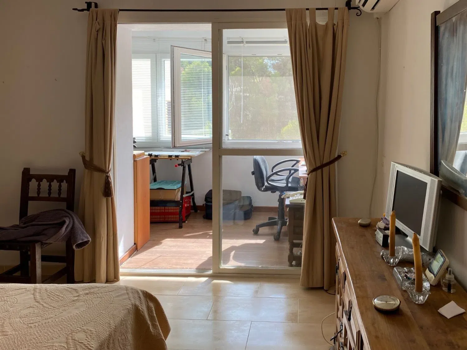 Moving to the first floor, the master bedroom boasts a 150 cm bed, built-in wardrobes, and a dedicated workspace with a bookcase. A second bedroom, accommodating two beds along with an additional pull-out bed, also features built-in storage and has access to a bathroom.