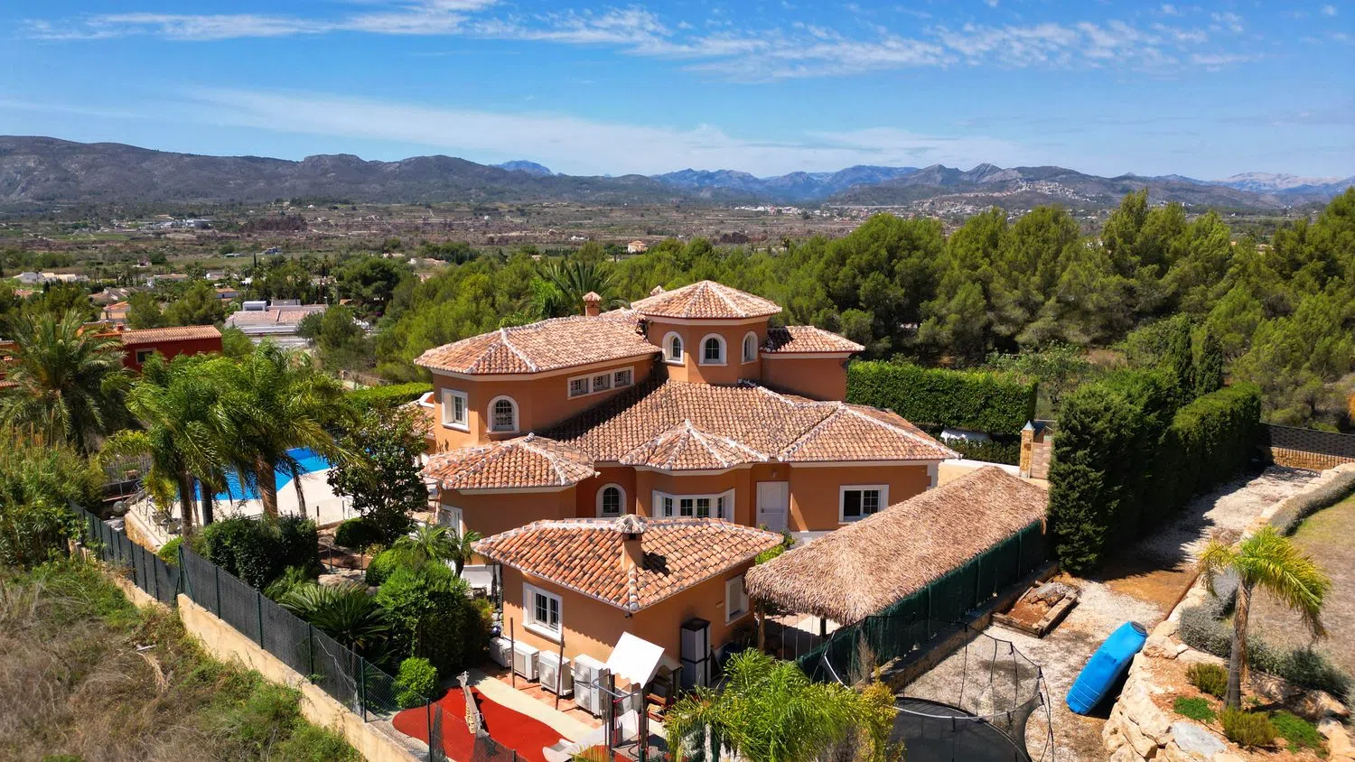 Exclusiva Vivienda Unifamiliar en la Parte Sur del Montgó con Vistas Abiertas al Valle A tan solo 5 minutos del casco antiguo de Jávea, esta impresionante vivienda unifamiliar aislada ofrece una combinación perfecta de comodidad, lujo y vistas panorámicas al valle. Distribución de la Vivienda: Planta Baja: Espacios: Cocina americana abierta al salón, creando un ambiente acogedor y funcional. Dormitorios: 2 amplios dormitorios. Baños: 1 baño con ducha y 1 aseo. Planta Primera: Espacios: Un segundo salón que ofrece un espacio adicional para relajarse o entretenerse. Dormitorios: 2 dormitorios tipo suite, cada uno con baño incorporado (con bañera y ducha) y vestidor. Garaje: Espacioso garaje con capacidad para 2 coches. Estas dos plantas suman aproximadamente 420 m². Sótano: Espacios: Sala de juegos, gimnasio y una bodega, proporcionando un área de entretenimiento y bienestar. Tamaño: Aproximadamente 200 m². Exterior: Piscina: Espectacular infinity pool de 16 x 8 m, perfecta para disfrutar de los días soleados con vistas impresionantes. Jardines: Un jardín japonés y un jardín mediterráneo que ofrecen diferentes ambientes de relajación y belleza. Parque Infantil: Espacio dedicado para el entretenimiento de los más pequeños. Zona de Barbacoa: Ideal para reuniones al aire libre con familia y amigos. Aseo Exterior: Práctico para uso durante las actividades al aire libre. Pérgola: Espacio cubierto para estacionar hasta 3 coches. Características Adicionales: Energía Sostenible: 10 placas solares para eficiencia energética. Climatización: Suelo radiante con aerotermia y aire acondicionado en todas las estancias, asegurando el máximo confort durante todo el año. Esta vivienda destaca no solo por su diseño y distribución, sino también por su ubicación privilegiada con vistas abiertas al valle, ofreciendo un entorno de tranquilidad y belleza a tan solo unos minutos del vibrante centro de Jávea. No pierda la oportunidad de vivir en esta exclusiva residencia que combina lujo, comodidad y un entorno natural inigualable.