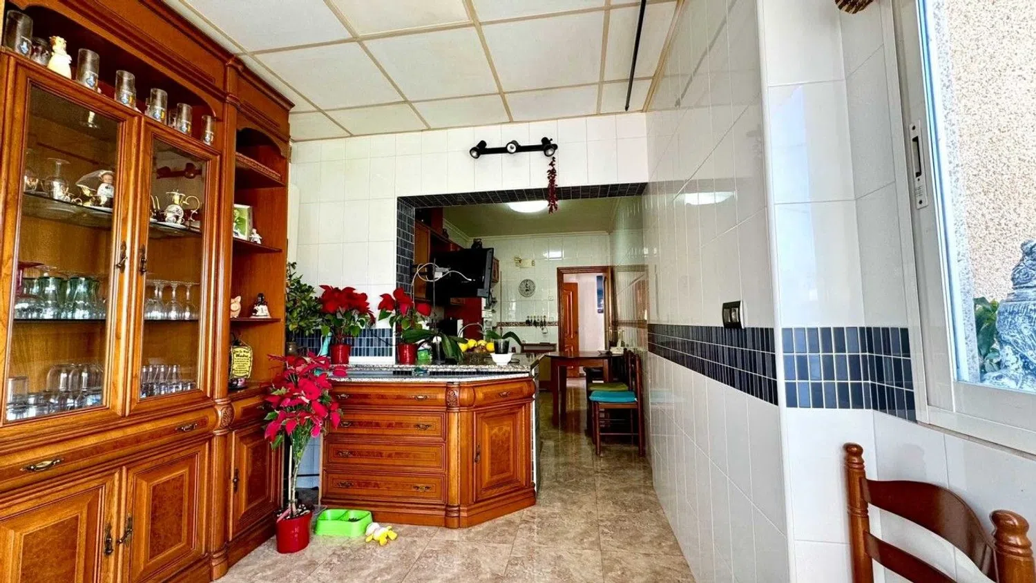 The villa boasts three bedrooms, all fitted with built-in wardrobes, and two bathrooms, one of which is en-suite. The expansive living room leads to a glass-enclosed terrace, ideal for winter relaxation, as well as a lovely covered outdoor terrace. The property features both cold and hot air conditioning, along with city gas for added comfort.