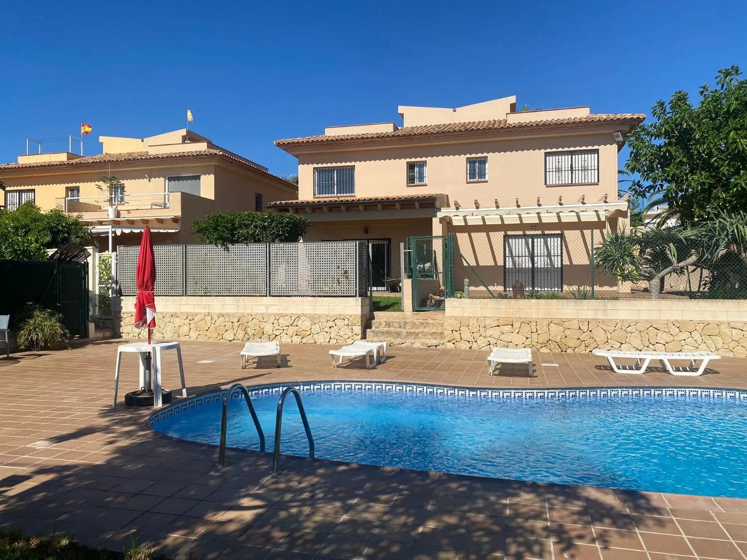 On the upper level, you will find three comfortable bedrooms along with two stylish bathrooms, ensuring ample space for relaxation. Elevate your living experience with a stunning 16 m² solarium on the rooftop, offering breathtaking views of the surroundings. This immaculate residence is equipped with central heating and provides exclusive access to a community pool shared by just four homes. It is move-in ready, promising you a perfect blend of comfort and leisure!