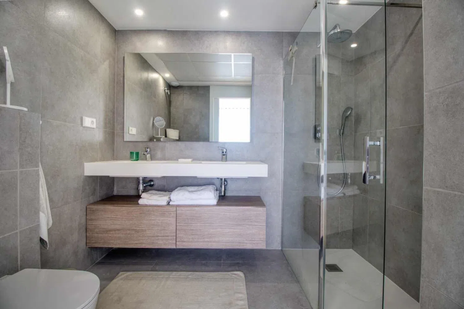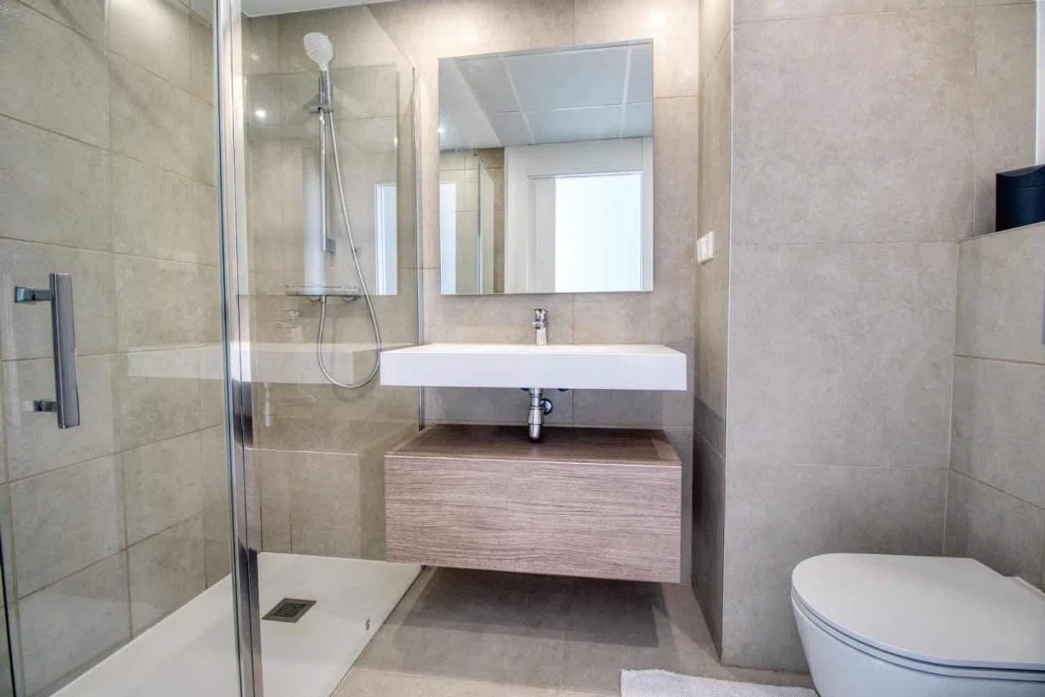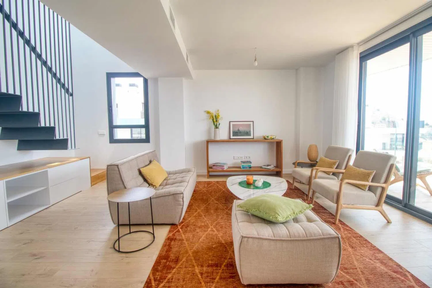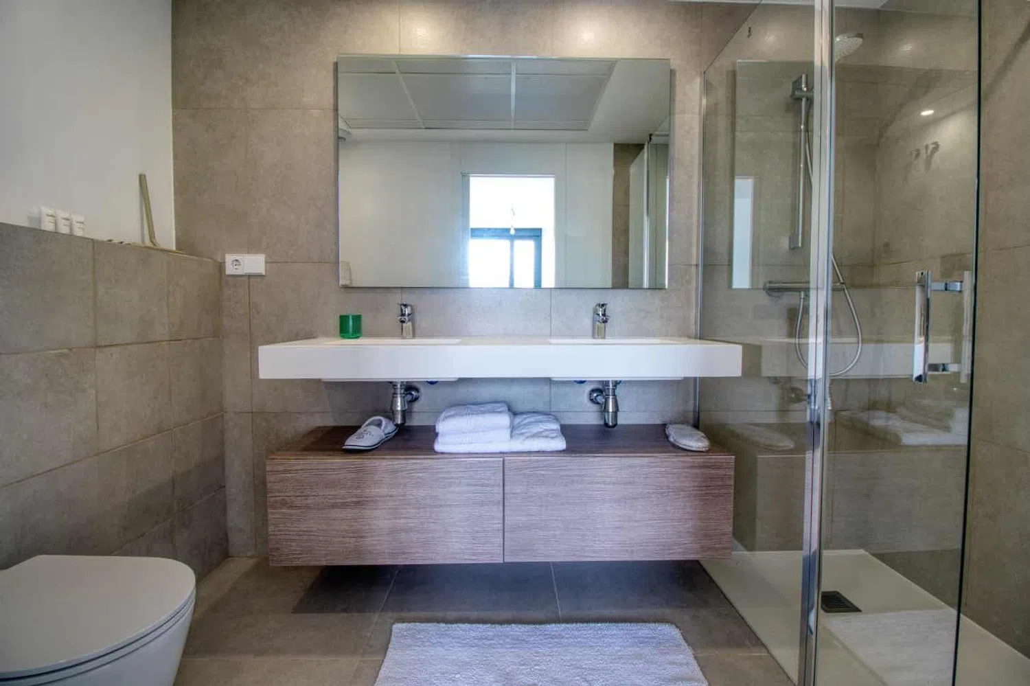 Upon entering, you are greeted by a welcoming foyer with a cloakroom that leads into a fully equipped kitchen. This area opens up to a large living room that seamlessly connects to a terrace, creating an ideal space for relaxation and entertainment. On this level, you will also find two spacious bedrooms with two well-appointed bathrooms.
