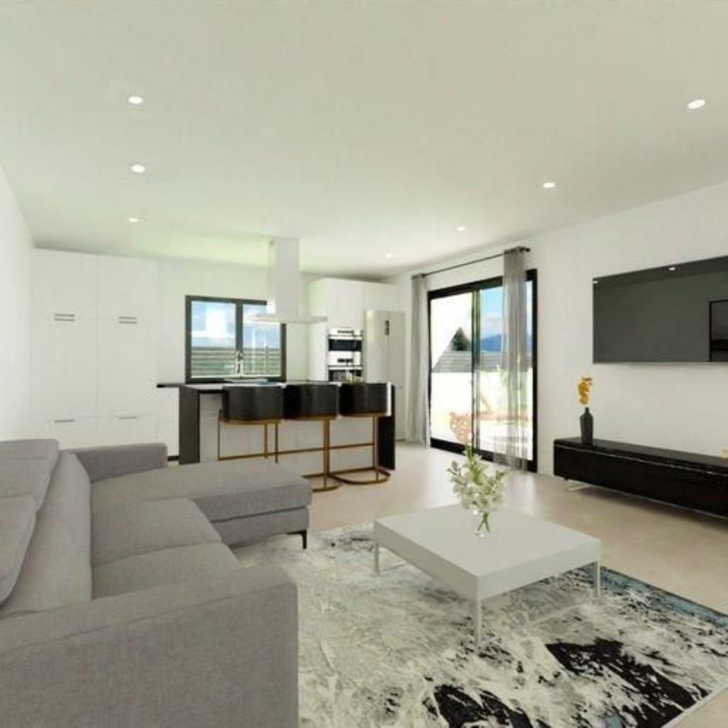 The villa is strategically divided into two main areas: the day zone and the night zone. In the day zone, you'll find a spacious living-dining area accompanied by an open-plan kitchen (with kitchen furnishings included). This space flows seamlessly to a modern porch through large windows, enhancing the connection between indoor and outdoor living and leading out to the garden area – perhaps even to the pool. Abundant natural light fills every corner, thanks to the expansive windows that open up to the porch, an inviting and functional area designed for maximizing outdoor enjoyment. Imagine spending afternoons with family and friends, enveloped in a serene and natural environment. Additionally, there is a conveniently located laundry area, easily accessible from various points within the home.