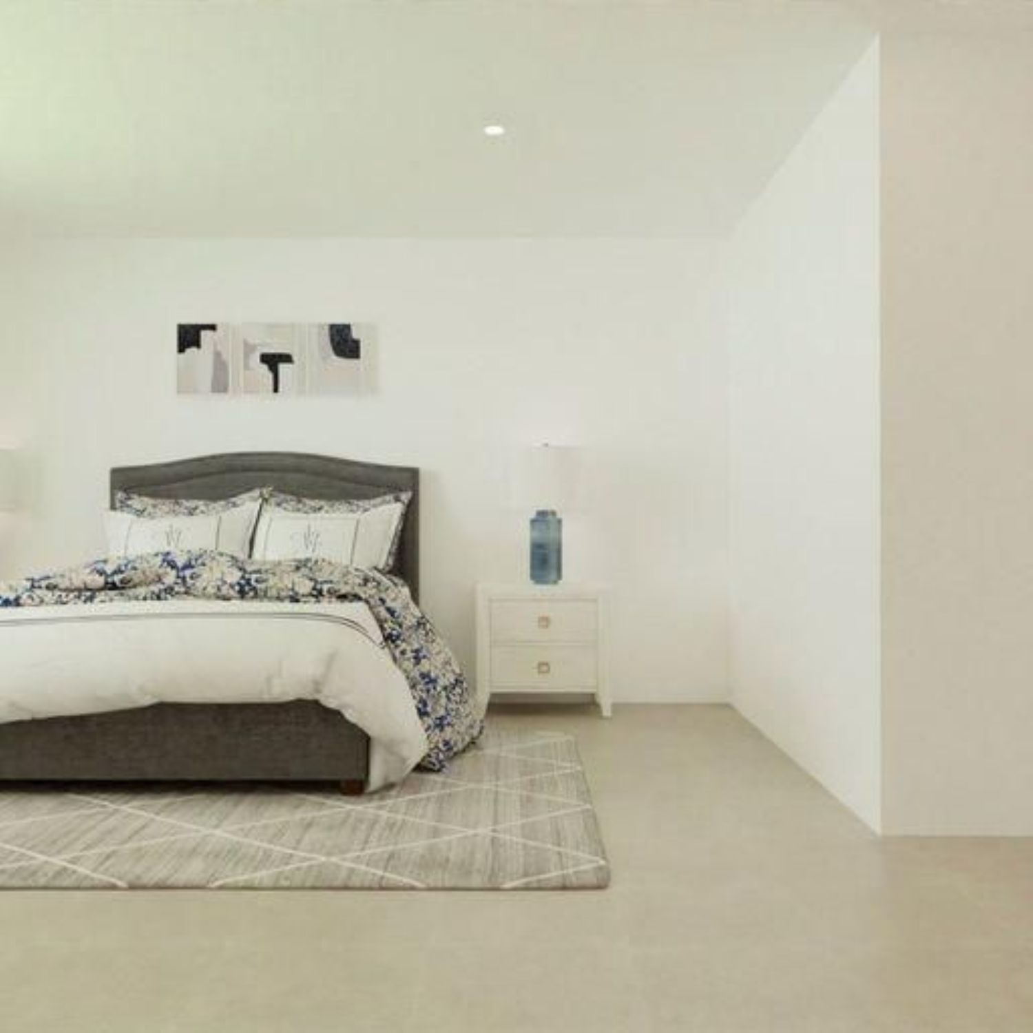 The night zone features three well-appointed bedrooms. The master suite boasts a spacious walk-in closet and an en-suite bathroom, complemented by a second bathroom serving the remaining bedrooms and the villa as a whole.