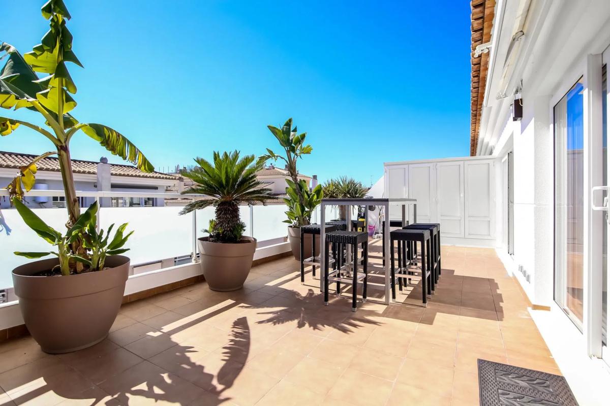 Impecable ático dúplex de tres dormitorios y dos baños en el centro de Moraira. A solo dos minutos a pie de la playa, este moderno apartamento se encuentra en la 4ª planta del edificio, con acceso por ascensor y sistema de videoportero. Se accede a esta fantástica propiedad a través del amplio salón de planta abierta con cocina integrada y dos conjuntos de puertas correderas que dan a la gran terraza en la azotea, que ofrece tanto sol como una zona de comedor a la sombra. La escalera interior le lleva a la planta inferior, donde encontrará el dormitorio principal con baño en suite, otro dormitorio doble y un dormitorio más pequeño que actualmente se utiliza como vestidor. También hay un baño familiar en este nivel y otro aseo en la planta superior. El apartamento cuenta con doble acristalamiento, aire acondicionado por conductos frío/calor, plaza de aparcamiento y trastero. ¡Una propiedad de lujo en la ubicación perfecta!