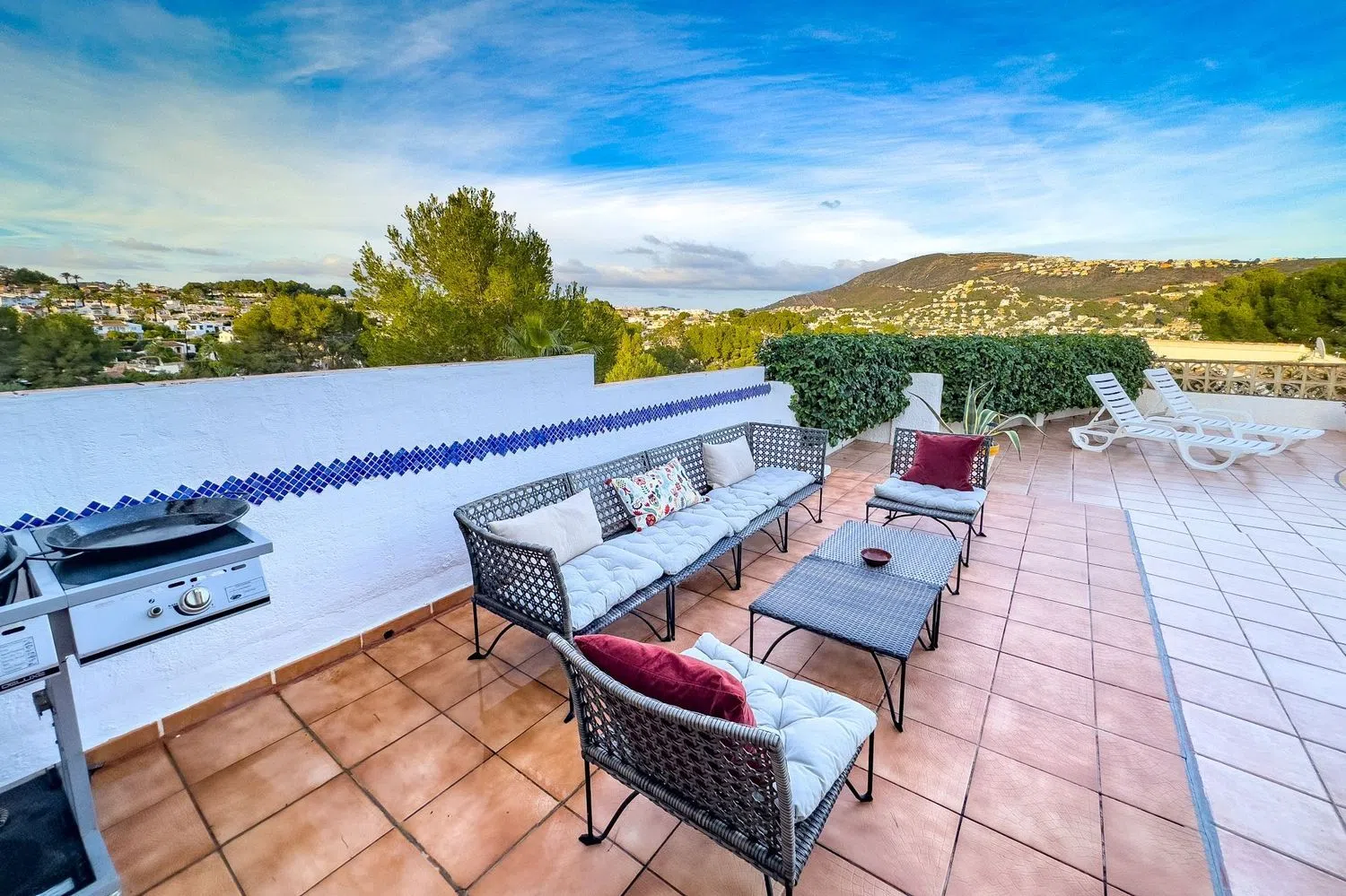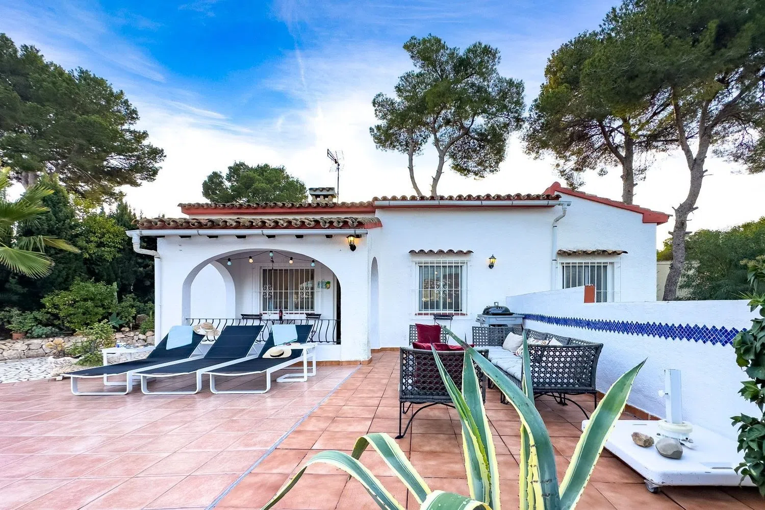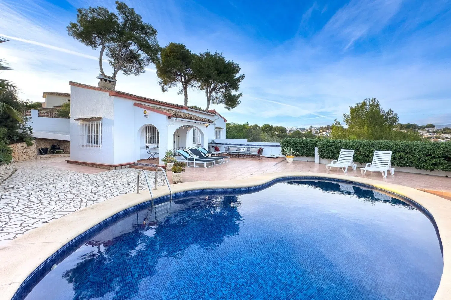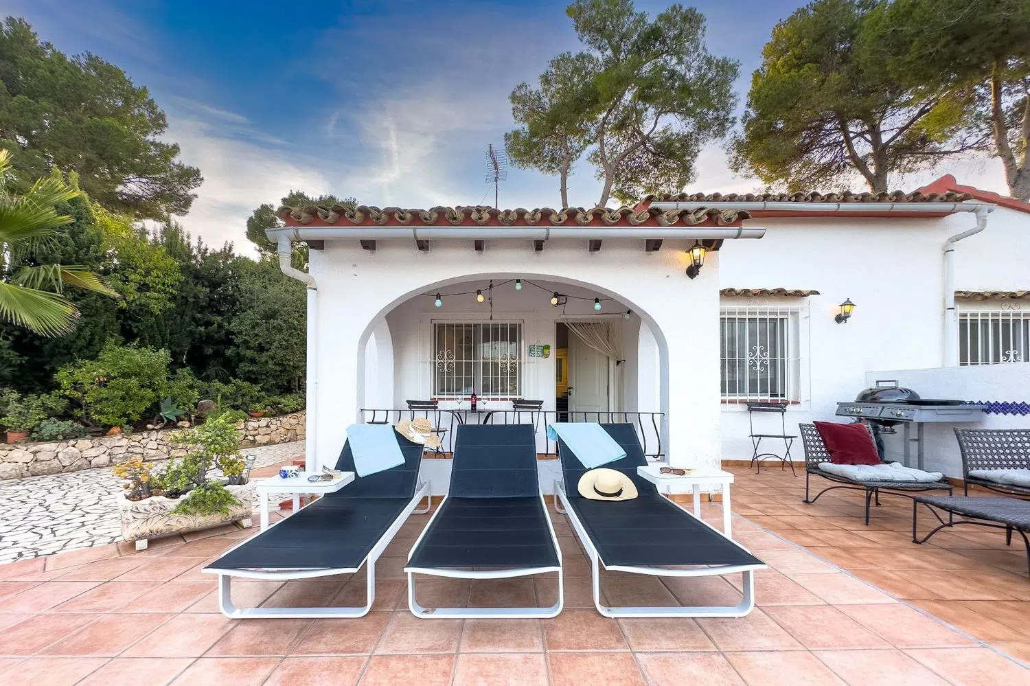 From the living room, you can access an outdoor patio, where a charming porch beckons you to savor the fresh air. The private pool, surrounded by loungers, is the perfect spot to bask in the sun on warm days, while the barbecue area is great for outdoor dining with friends and family.