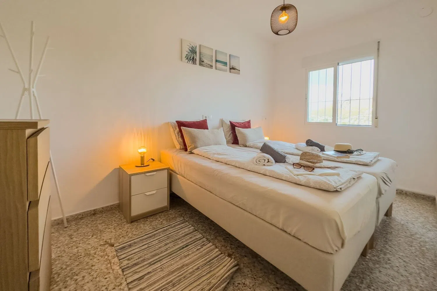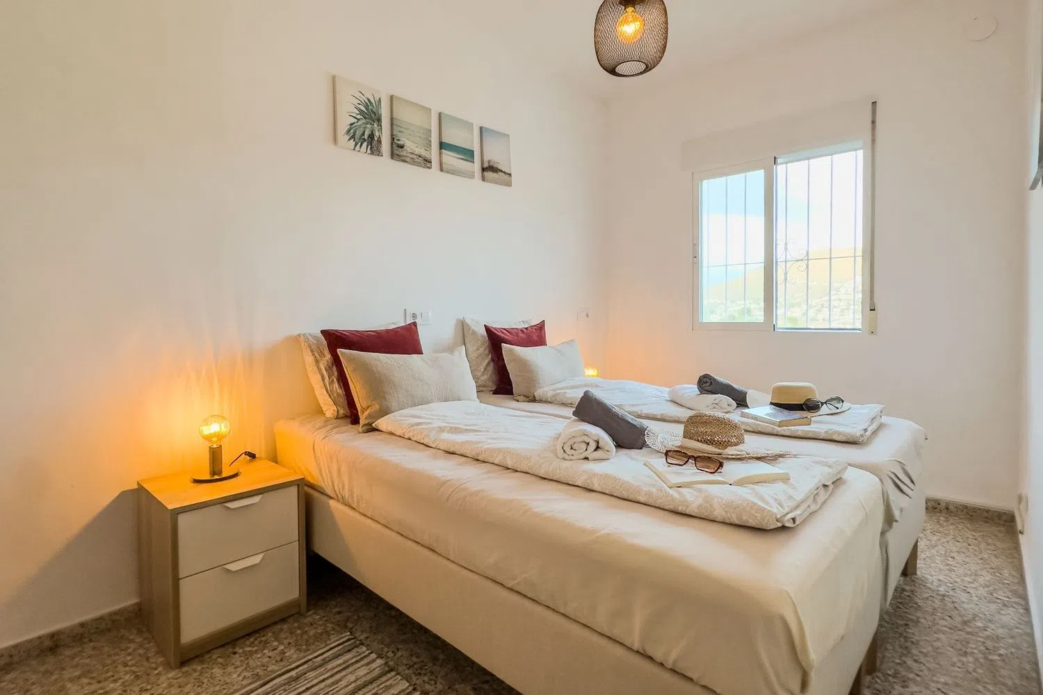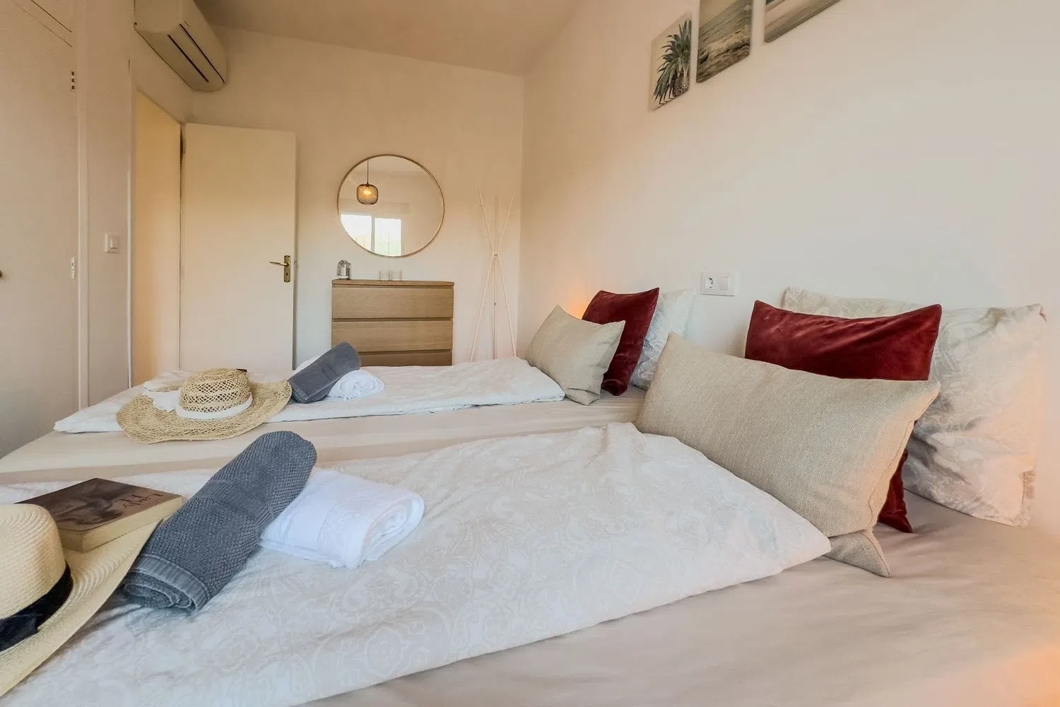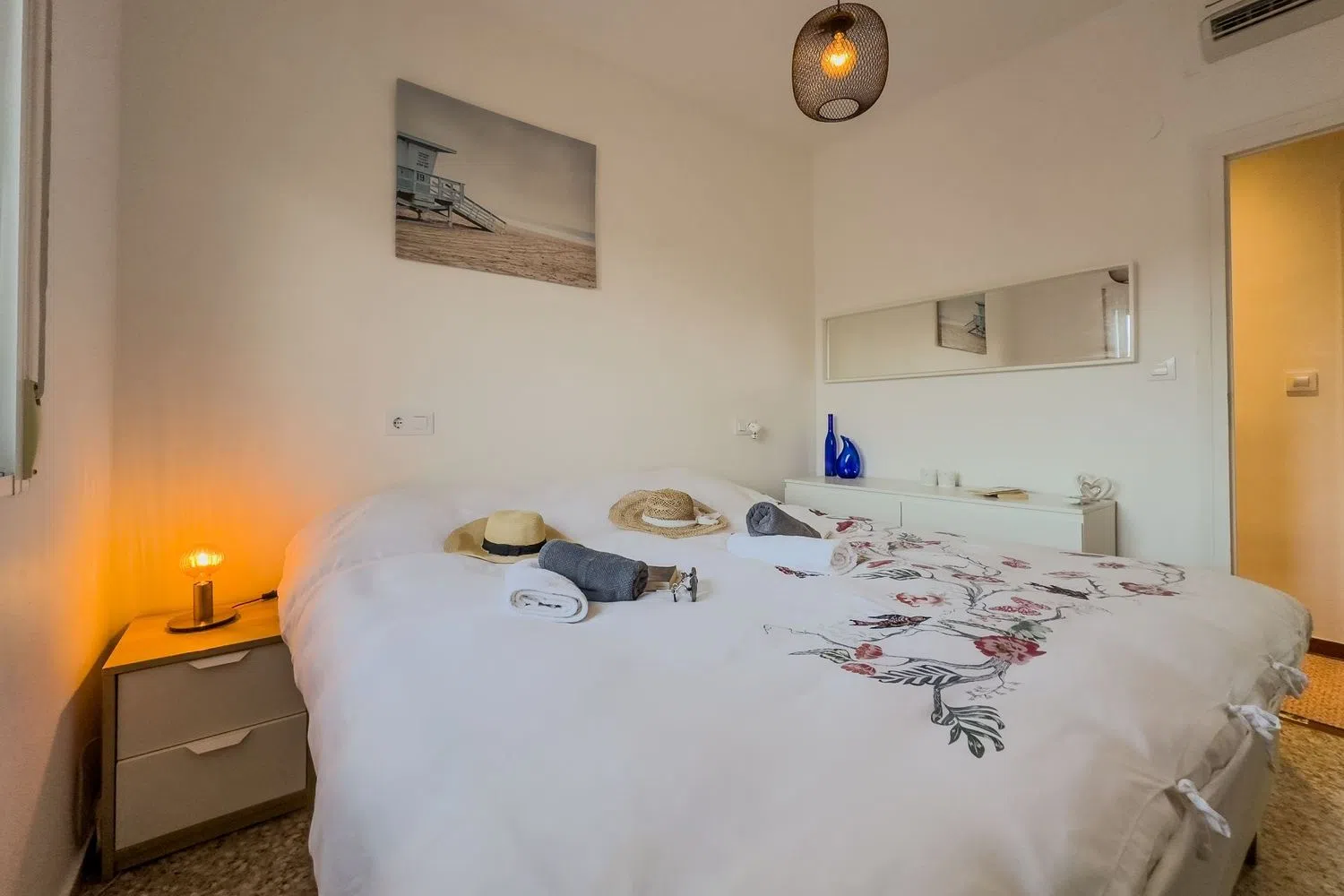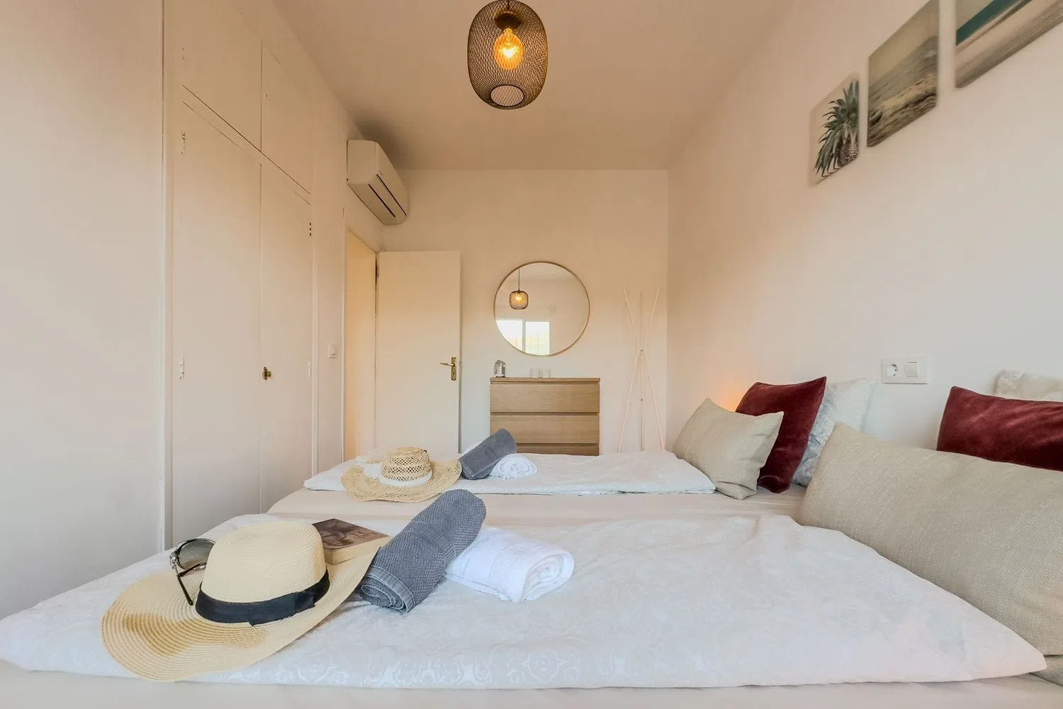 A hallway leads to two well-appointed bedrooms: a master suite and a second room with twin beds. Both bedrooms come with built-in wardrobes and provide tranquil mountain views that enhance the sense of spaciousness. The full bathroom features a comfortable shower for your convenience.
