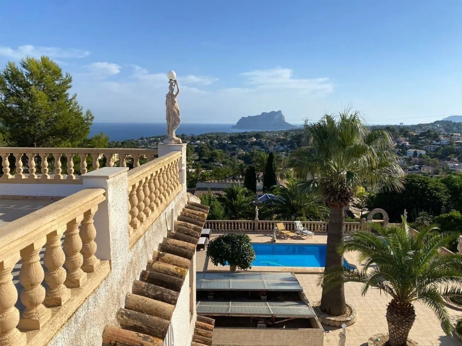Amplia villa en venta en San Jaime con fantásticas vistas al mar y precioso espacio al aire libre La locación Esta villa tradicional en venta está ubicada en la cotizada zona de San Jaime de Benissa. San Jaime es una zona residencial fina, bien cuidada y de larga trayectoria. Convenientemente ubicado ya que está a sólo 5 minutos en coche del supermercado Pepe la Sal, donde se venden muchos productos internacionales. La pequeña playa de Cala Andrago se encuentra a 6 minutos en coche. La gran playa de arena y el bonito centro de Moraira se encuentran a menos de 10 minutos en coche. San Jaime también dispone de un campo de golf: Golf d'Ifach. Este campo está a menos de 1,5 km del establecimiento. La villa Los dos puntos focales más importantes de esta villa son las fantásticas vistas al mar desde todas las habitaciones y el espacio exterior. La propiedad dispone de un amplio y luminoso salón-comedor con chimenea, cocina totalmente equipada, 4 dormitorios dobles y 4 baños, un posible quinto dormitorio actualmente utilizado como sala de juegos y lavadero. Debajo de la piscina hay un gimnasio y una sauna. Afuera La villa está situada en una gran parcela con muchas terrazas y zonas de estar. La piscina y el jacuzzi están rodeados por una gran terraza con espacio suficiente para varias tumbonas y la ducha exterior. La cocina exterior se encuentra en la terraza cubierta. El lugar perfecto para cenar al aire libre. Desde la amplia terraza de la azotea las vistas vuelven a ser impresionantes. El jardín es maduro y mediterráneo. Hay varios árboles frutales. Características Calefacción central, chimenea, placas solares, ducha exterior, garaje, sauna, gimnasio. Si está buscando una villa espaciosa y tradicional con mucho espacio al aire libre, fantásticas vistas al mar y la posibilidad de ponerle su propio sello, esta podría ser su casa. Convénzase y reserve una visita ahora a esta villa en venta en Benissa, Costa Blanca Norte.