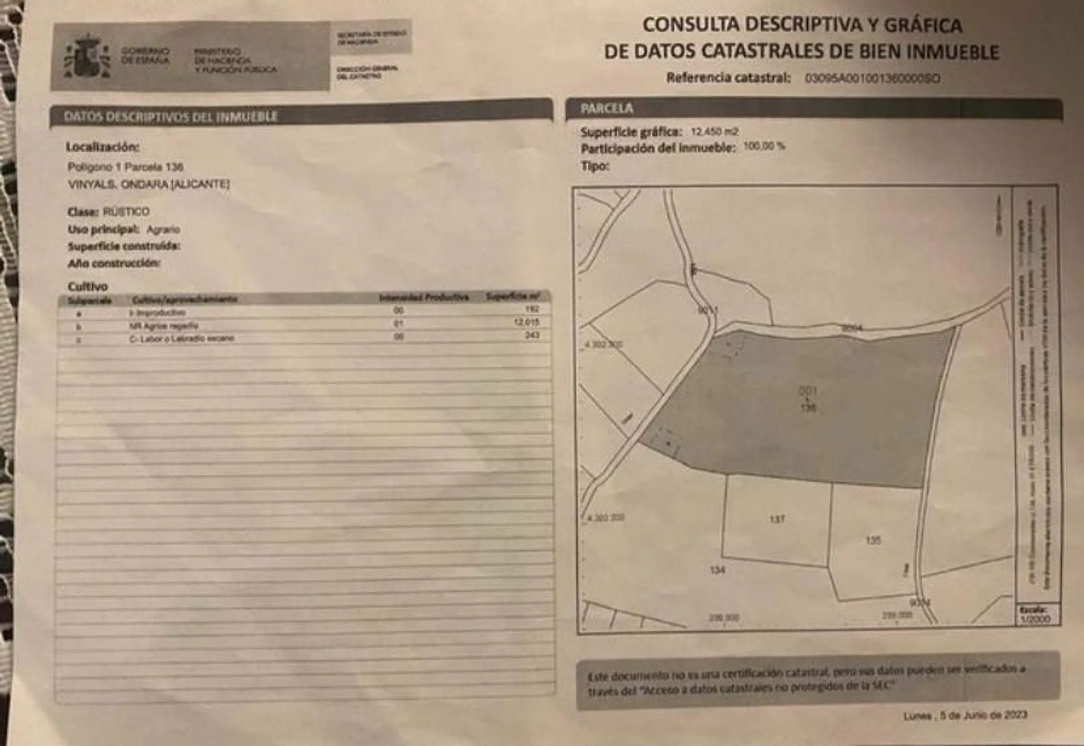 Parcela rústica en Vinyals, Ondara (Alicante) cerca del merendero Segaria. Ideal para cultivo o proyecto agrario. Posibilidad de consttuir una vivienda. - Superficie gráfica: 12.450 m2. - Uso principal: Agrario. - Clasificación: Rústico.