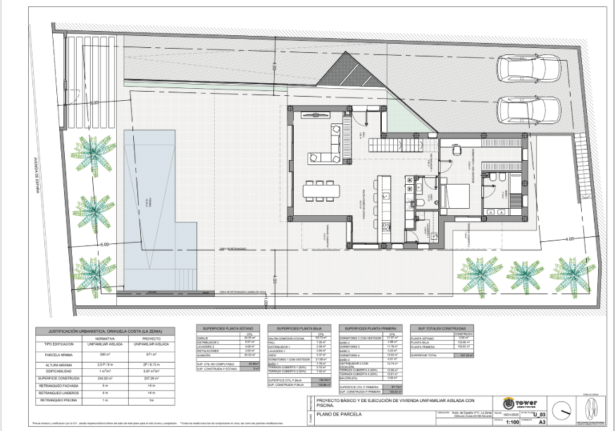 Jardín: césped natural, vallado verde, barbacoa, riego automático, 7 palmeras adultas.