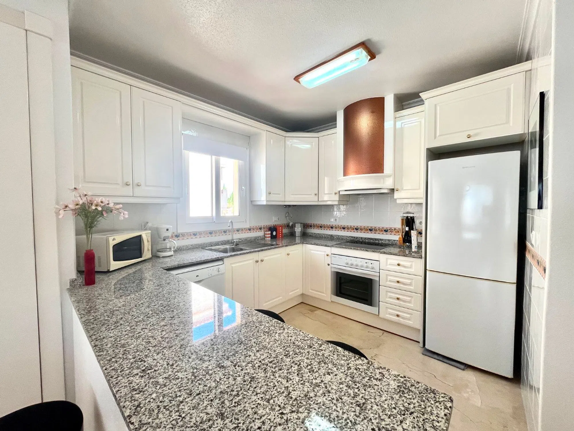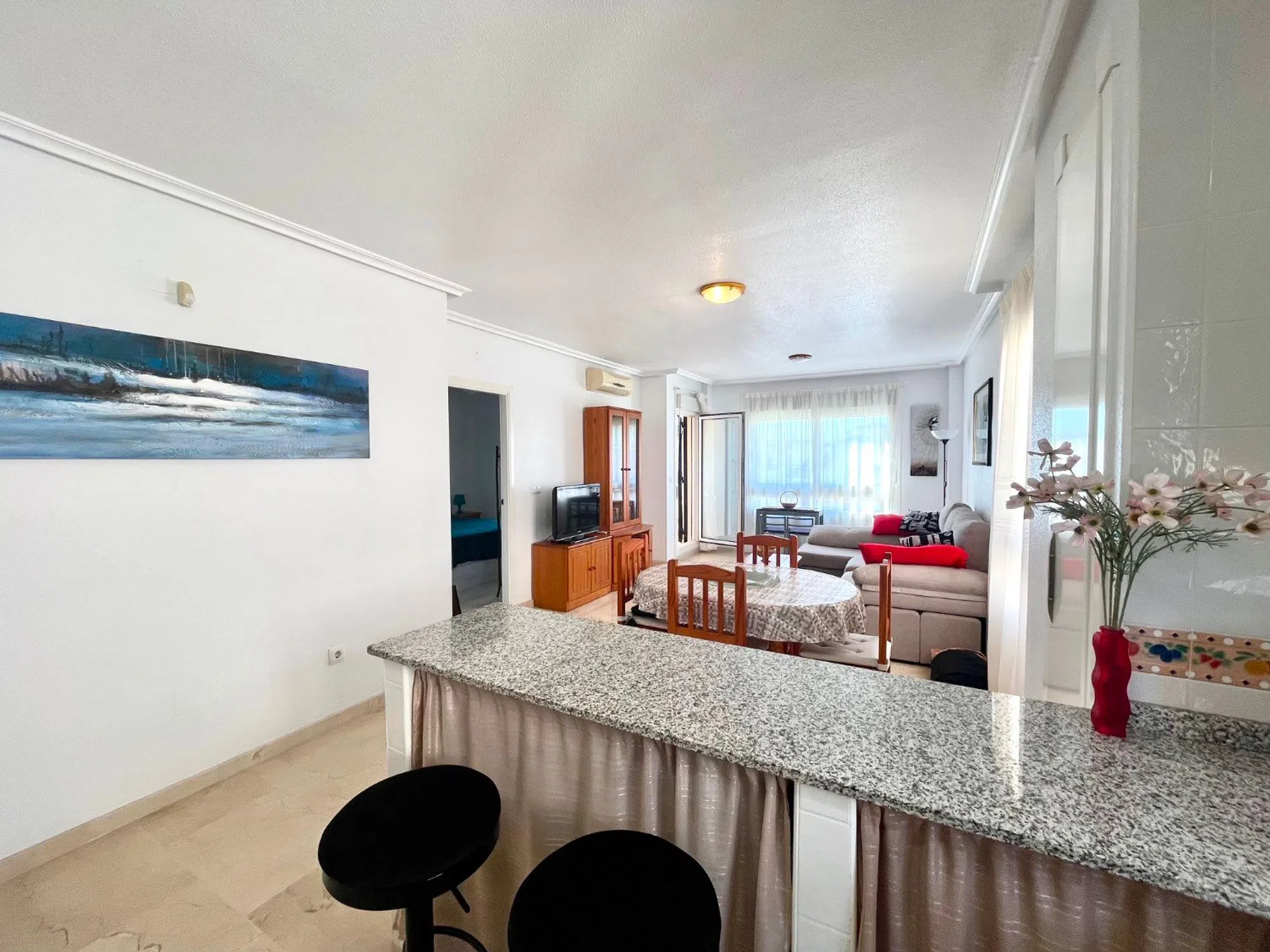 P-1581: Descubra este apartamento bellamente terminado que combina sin esfuerzo comodidad y estilo. El ascensor te lleva a la 2ª planta y allí encontrarás un precioso apartamento con 2 amplios dormitorios, el dormitorio principal está equipado con su propio baño en suite, ideal para mayor privacidad y comodidad. El 2º baño tiene bañera y es perfecto para invitados o familiares. El amplio y luminoso salón es el corazón del apartamento y ofrece acceso directo a la soleada terraza orientada al sur, perfecta para disfrutar del sol durante todo el año. La terraza está equipada con cortinas de cristal ideales para el invierno. La cocina abierta está totalmente equipada y ofrece un espacio agradable para cocinar y socializar. La propiedad se vende con garaje debajo del edificio. Por lo tanto, directamente desde el ascensor al garaje es fácil si tiene muchos comestibles con usted. A poca distancia tienes varios bares con música en vivo y restaurantes. También a poca distancia de los supermercados. Definitivamente vale la pena una visita.