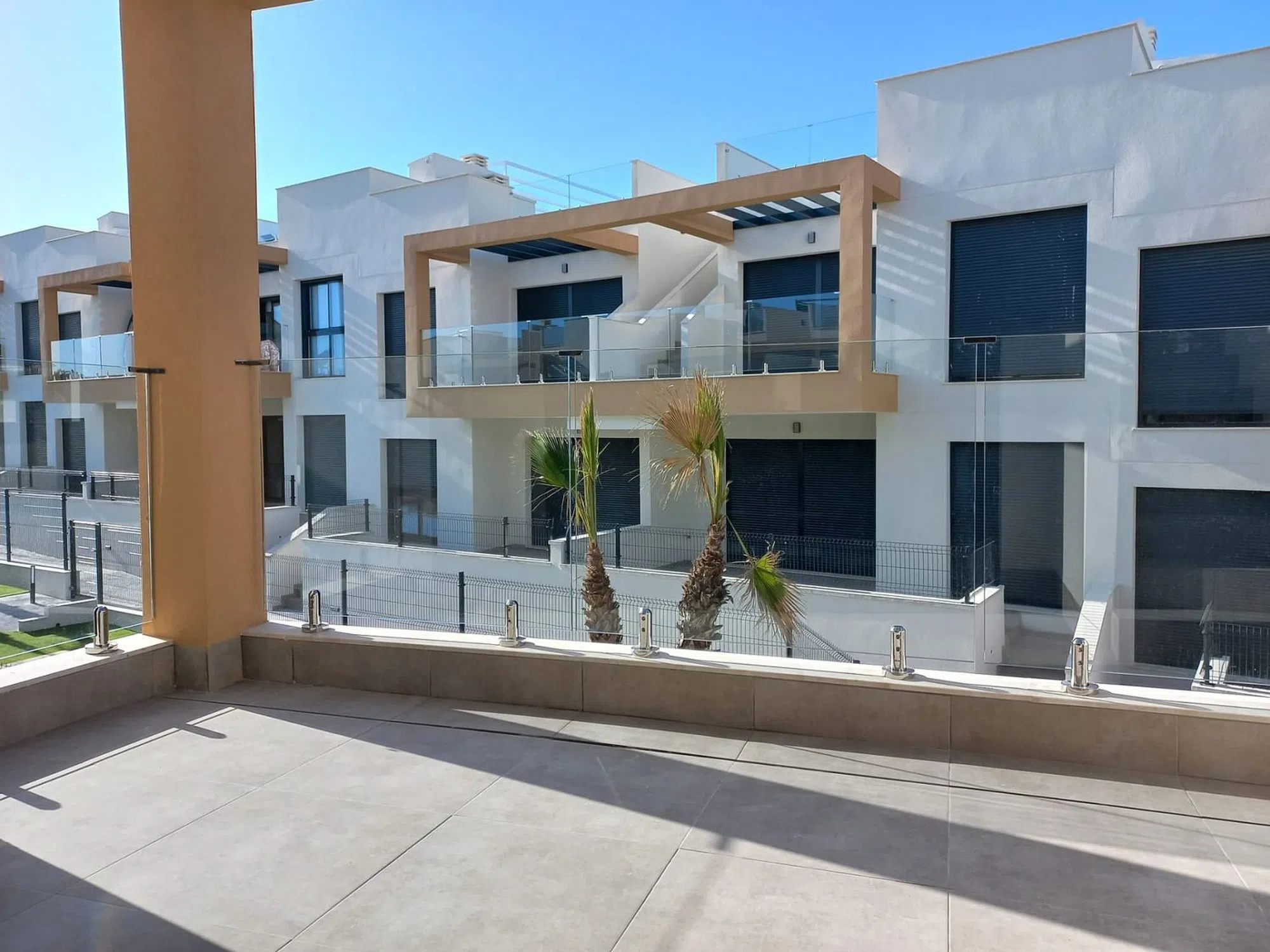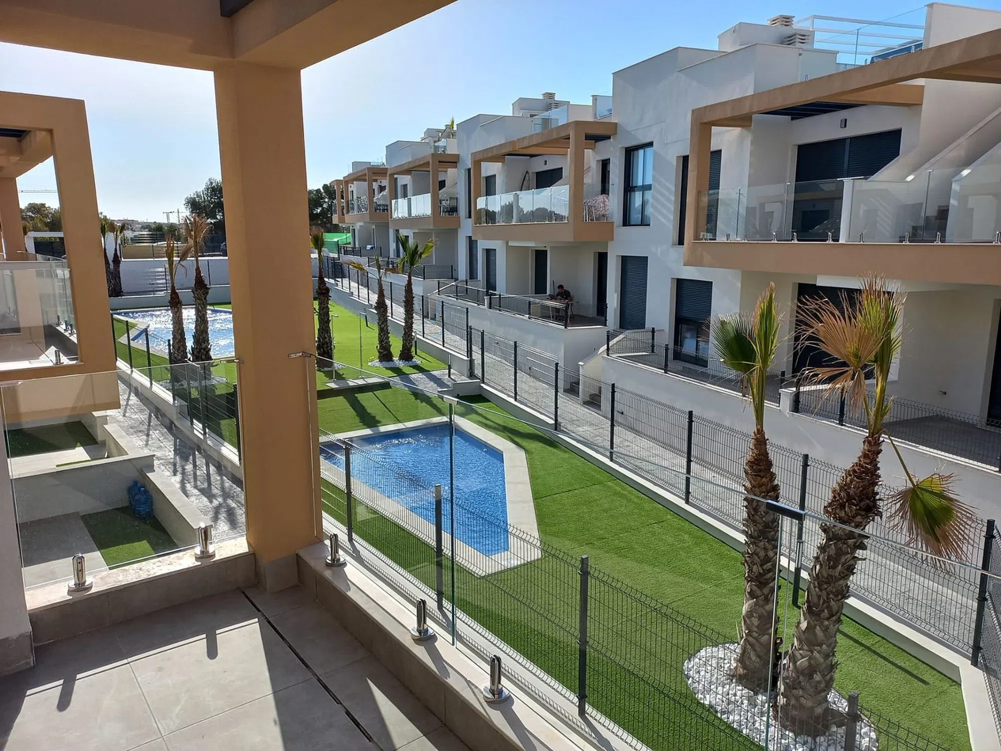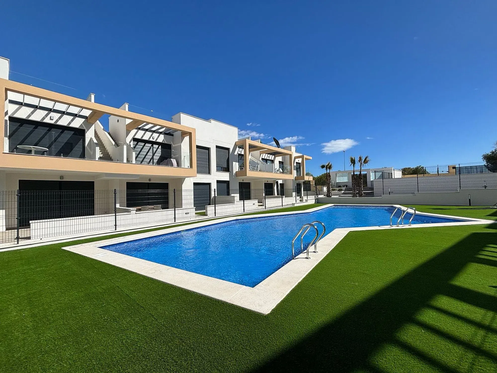 Pequeño y exclusivo complejo residencial moderno con apartamentos tipo bungalow y una fantástica piscina comunitaria. Situado en un hermoso complejo privado, muy céntrico con solo 40 apartamentos bungalow, tiene una superficie 129,43 m² (+ terrazas) con 2 dormitorios, 2 baños (1 de ellos en suite), salón/comedor con modernas cocinas equipadas, gran terraza embaldosada en la planta baja de unos 60 m². Vista a la zona comunitaria y una plaza de garaje incluida en el precio. ¡El apartamento está orientado al sur! El equipamiento de este apartamento incluye, entre otras cosas, ventanas de aluminio con doble acristalamiento, aislamiento acústico y térmico óptimo según las normas de construcción vigentes de la UE, puertas de seguridad en la zona de entrada, preinstalación de aire acondicionado, persianas enrollables, iluminación LED, baños con espejos y mamparas de ducha de cristal, armarios empotrados en los dormitorios y una moderna cocina equipada. Las tiendas, centro médico, centro comercial (La Zenia Boulevard) bares y restaurantes más cercanos están a sólo 2 minutos en coche en la zona de Villamartín y Orihuela Costa. Los numerosos campos de golf de Villamatin, Las Ramblas, Las Colinas y Campoamor hacen que esta zona sea única. Las hermosas calas de playa de Orihuela Costa y el nuevo centro comercial La Zenia Boulevard se encuentran a sólo unos minutos de este complejo. La excelente conexión con la autopista AP-7 asegura una buena comunicación con el resto de la provincia de Alicante y Murcia.