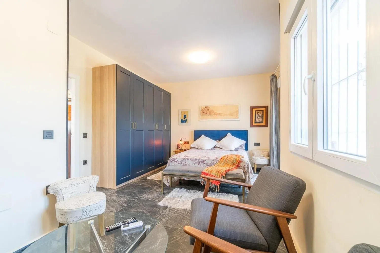 The south-facing property features two spacious bedrooms, previously four, as an extensive renovation combined two rooms to create a more open and comfortable environment. The modernized kitchen on this floor has been completely updated with stylish furnishings and new appliances, adding both value and practicality to the home.
