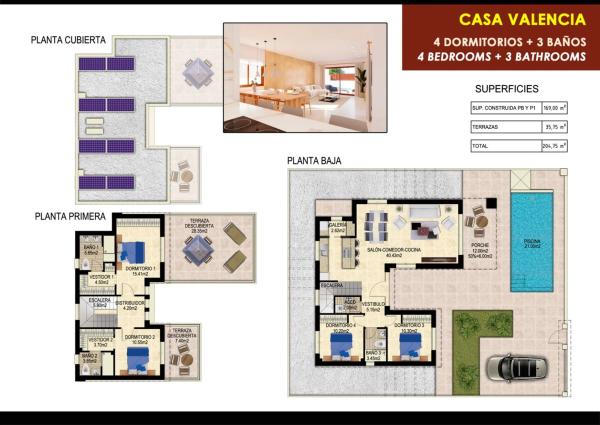 Descubre la lujosa Casa Valencia en el corazón de la vibrante comunidad de Vistabella Golf. Estas casas de nueva construcción, meticulosamente diseñadas, combinan elegancia moderna con funcionalidad, ofreciendo una experiencia de vida espaciosa y cómoda. La propiedad cuenta con 4 dormitorios luminosos y de generosas dimensiones, incluyendo una suite principal con terraza privada, y 3 baños elegantemente terminados. La amplia sala de estar-comedor de planta abierta (40,43 m²) se conecta perfectamente con una cocina moderna, creando un entorno ideal para la vida familiar y el entretenimiento. La planta baja incluye dos dormitorios y un espacio de estar adicional para una máxima flexibilidad. Salga al exterior para disfrutar de los hermosos espacios al aire libre. Una gran piscina privada (21 m²) es perfecta para refrescarse en los días cálidos, mientras que las terrazas, con un total de 35,75 m², ofrecen un amplio espacio para cenar al aire libre, relajarse o recibir invitados. La terraza del primer piso (28,35 m²) y el solárium en la azotea ofrecen impresionantes vistas, lo que las convierte en lugares ideales para relajarse bajo el sol mediterráneo. Con una superficie total de 204,75 m², esta casa ofrece mucho espacio para familias, turistas o aquellos que buscan mudarse. Convenientemente ubicada dentro de la comunidad de Vistabella Golf, la propiedad está rodeada de servicios locales, opciones gastronómicas y actividades de ocio, todo ello cerca de la naturaleza y de la impresionante costa de la Costa Blanca. No pierda esta oportunidad de asegurar su casa de ensueño en una ubicación exclusiva. ¡Contáctenos hoy mismo para obtener más información o para concertar una visita! Detalles de la propiedad Superficie total: 204,75 m²Superficie construida: 169 m²Terrazas: 35,75 m²Piscina privada: 21 m².