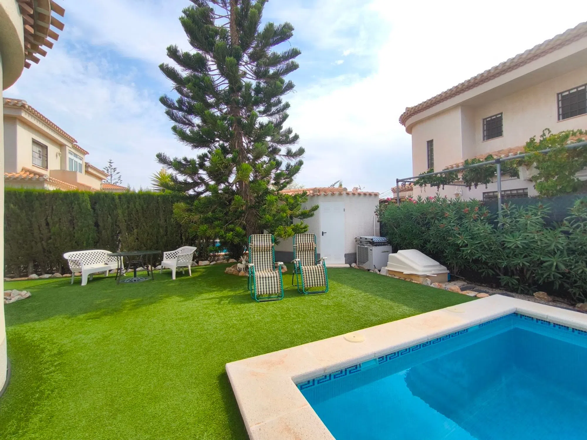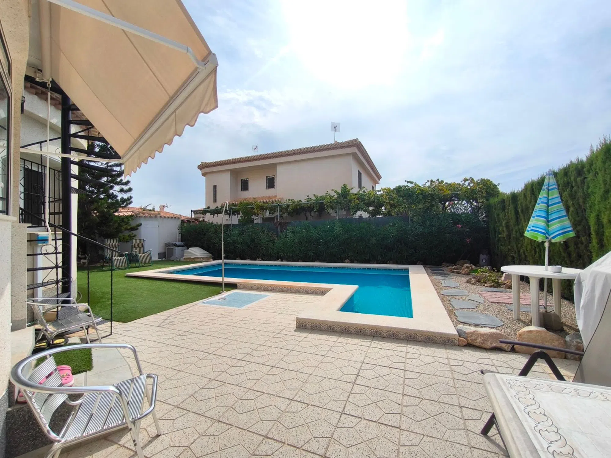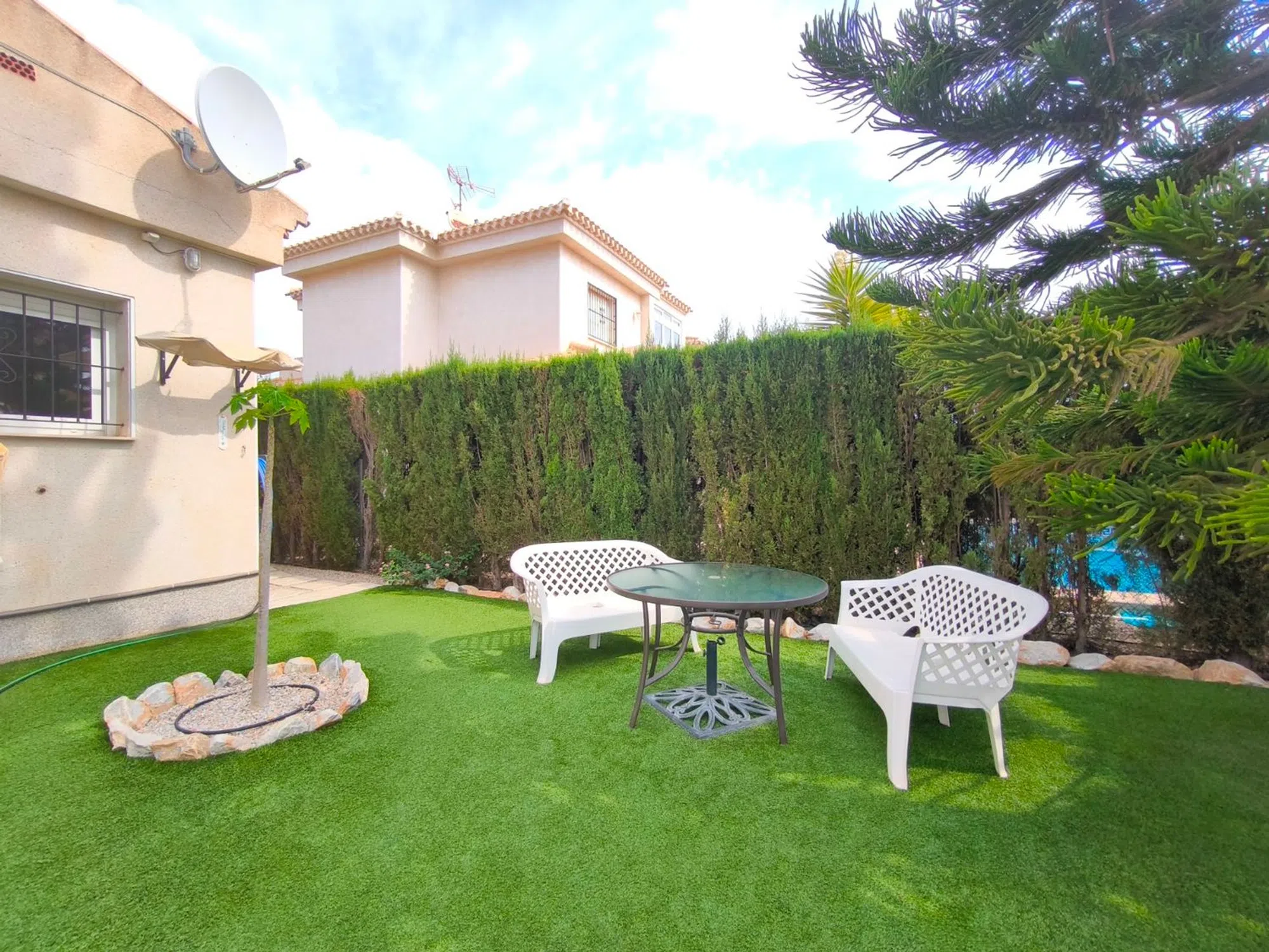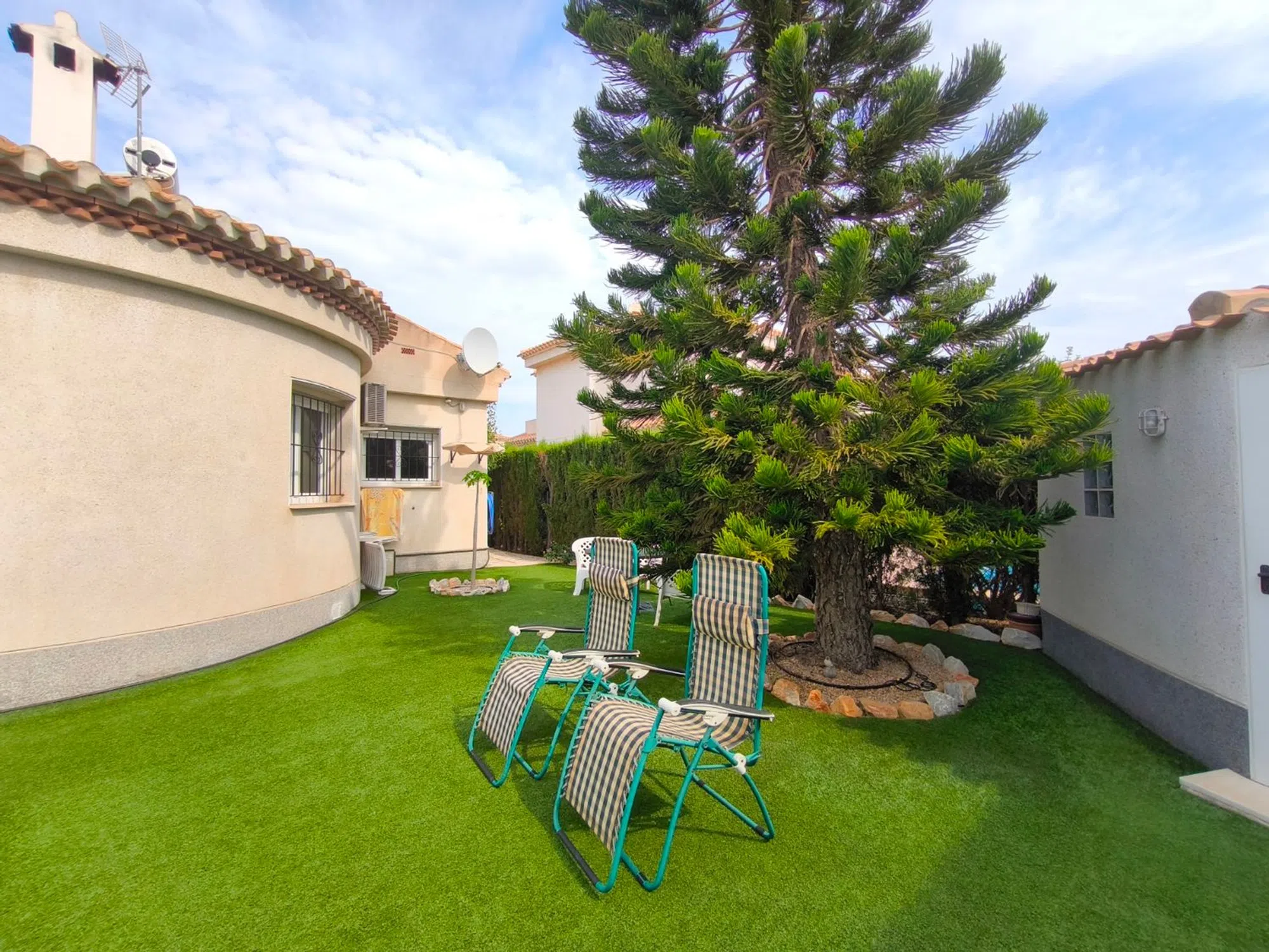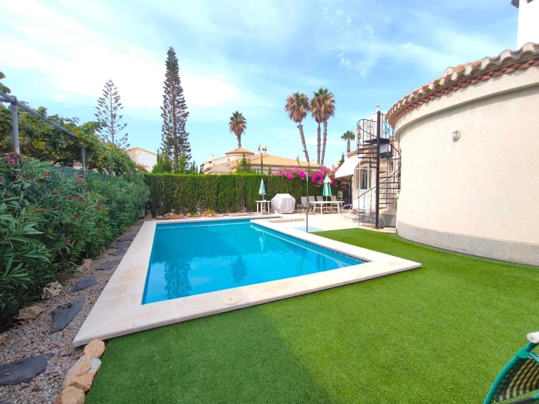Ocasión única: a la venta Villa de una sola planta de 150 metros cuadrados, ubicada en la mejor zona de la ciudad y completamente amueblada. Dispone de 3 dormitorios y 2 baños, uno de ellos en suite, un salón comedor luminoso y de gran amplitud para no tener problemas de espacio, cocina independiente, galería, terraza acristalada transformada como un salón de invierno, un pequeño vestidor y Solarium. La chimenea en el salón comedor proporciona un punto de encuentro familiar y ofrece esa sensación de hogar que buscas. Aire acondicionado en cada dormitorio así como en el salón y en la terraza acristalada, consiguiendo así el efecto deseado en cada unos de las cinco dependencias. Suelo radiante por electricidad en toda la planta (excepto en la terraza acristalada) con un mando independiente en cada habitación/baño para sacar el máximo provecho de su funcionalidad. Gracias a sus paneles solares de 10kWh, el gasto de electricidad se reduce a un máximo de 10 euros al mes aunando así la energía sostenible con un gran ahorro económico sin perder comodidad. Ademas hay una instalacion de gas. Cuenta además con 2 trasteros con acceso desde el jardín, con mucho espacio extra para almacenaje y facilidad de colocación de armarios de fácil acceso: sótano 25 m2. Piscina climatizada 4x8, recién reformado. Alrededor de 47 m3. Con vistas al mar. Jardín con arboles frutales y sistema de auto-riego, con mucho espacio para que disfrutes de su parcela de 500 metros cuadrados. Zona de Playa Flamenca al lado del mercadillo que se celebra cada sábado y que te permitirá disfrutar del dinamismo de esta área de la localidad.