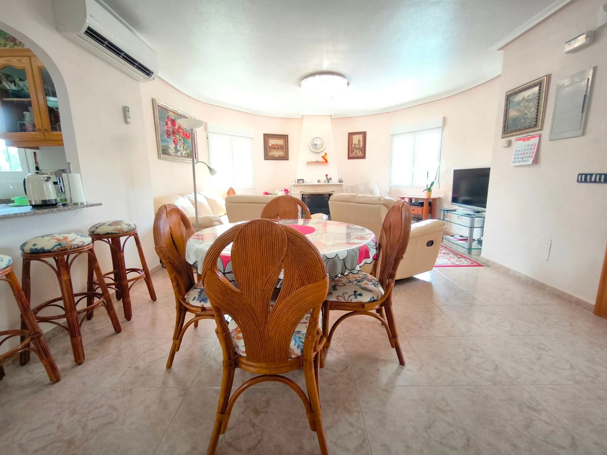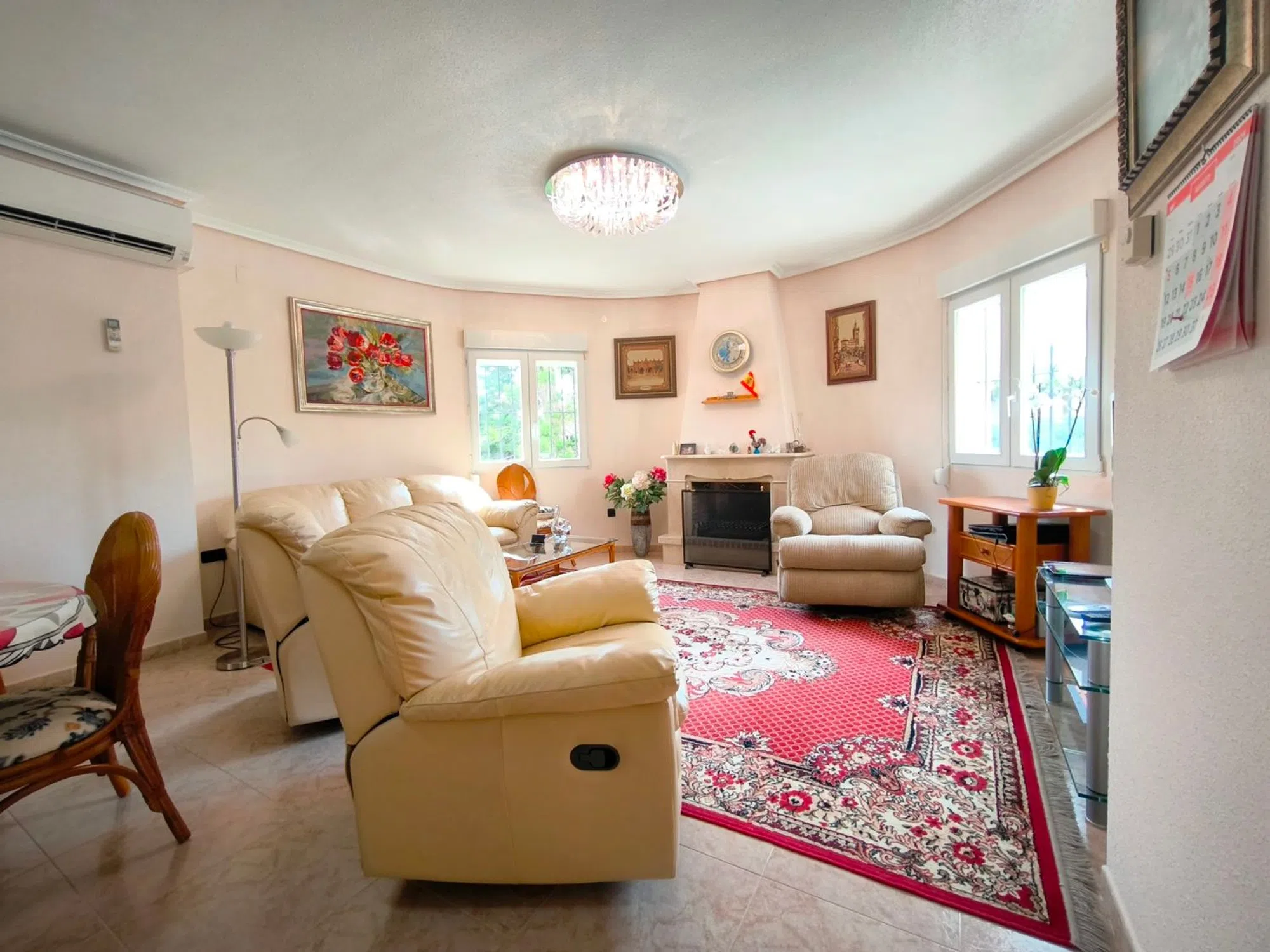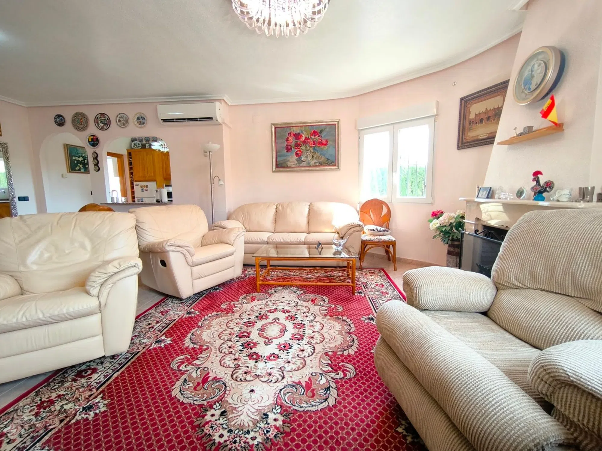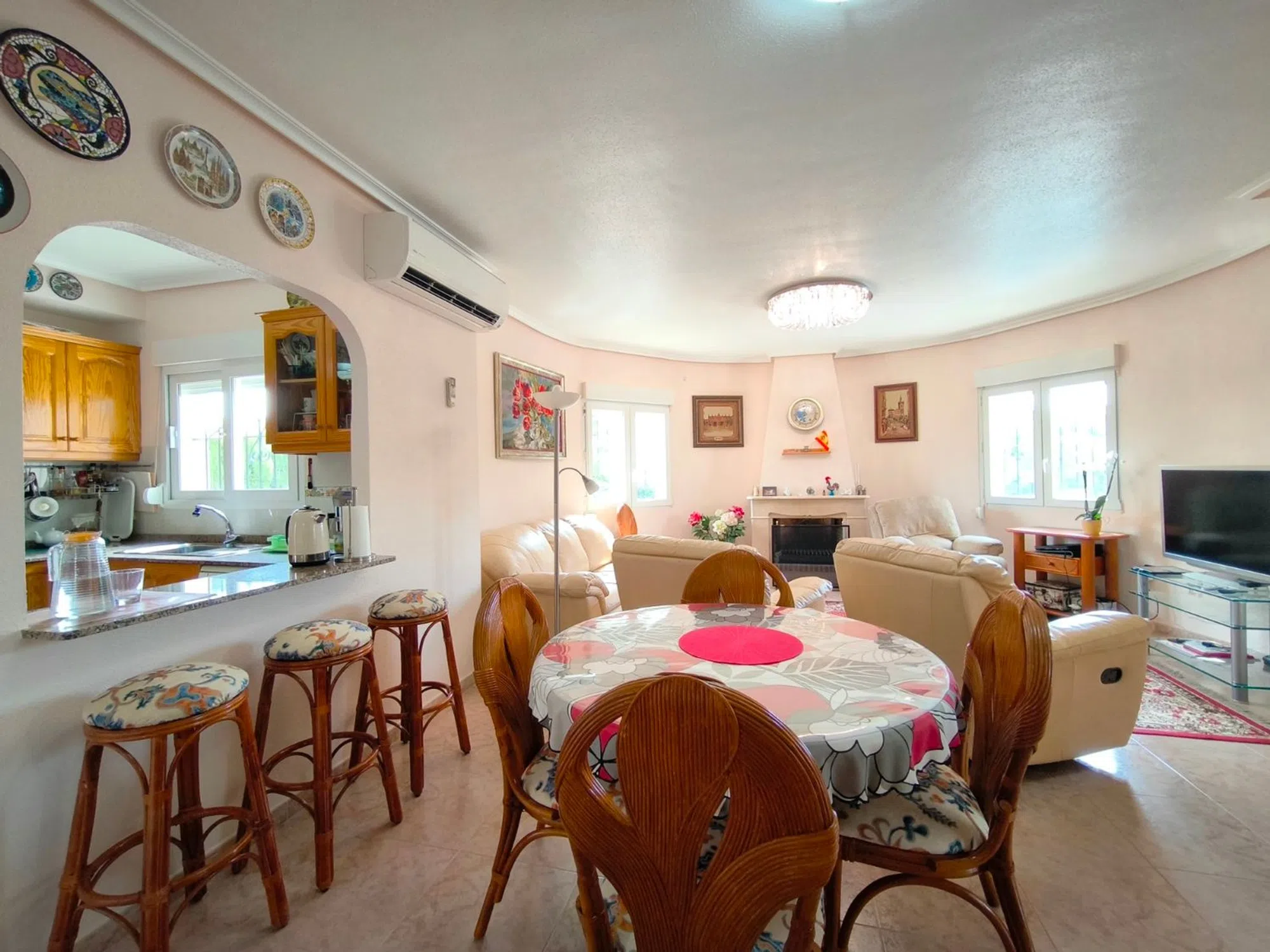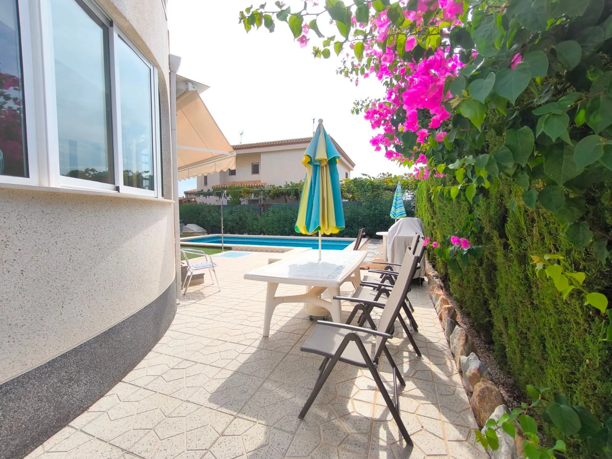 Ocasión única: a la venta Villa de una sola planta de 150 metros cuadrados, ubicada en la mejor zona de la ciudad y completamente amueblada. Dispone de 3 dormitorios y 2 baños, uno de ellos en suite, un salón comedor luminoso y de gran amplitud para no tener problemas de espacio, cocina independiente, galería, terraza acristalada transformada como un salón de invierno, un pequeño vestidor y Solarium. La chimenea en el salón comedor proporciona un punto de encuentro familiar y ofrece esa sensación de hogar que buscas. Aire acondicionado en cada dormitorio así como en el salón y en la terraza acristalada, consiguiendo así el efecto deseado en cada unos de las cinco dependencias. Suelo radiante por electricidad en toda la planta (excepto en la terraza acristalada) con un mando independiente en cada habitación/baño para sacar el máximo provecho de su funcionalidad. Gracias a sus paneles solares de 10kWh, el gasto de electricidad se reduce a un máximo de 10 euros al mes aunando así la energía sostenible con un gran ahorro económico sin perder comodidad. Ademas hay una instalacion de gas. Cuenta además con 2 trasteros con acceso desde el jardín, con mucho espacio extra para almacenaje y facilidad de colocación de armarios de fácil acceso: sótano 25 m2. Piscina climatizada 4x8, recién reformado. Alrededor de 47 m3. Con vistas al mar. Jardín con arboles frutales y sistema de auto-riego, con mucho espacio para que disfrutes de su parcela de 500 metros cuadrados. Zona de Playa Flamenca al lado del mercadillo que se celebra cada sábado y que te permitirá disfrutar del dinamismo de esta área de la localidad.