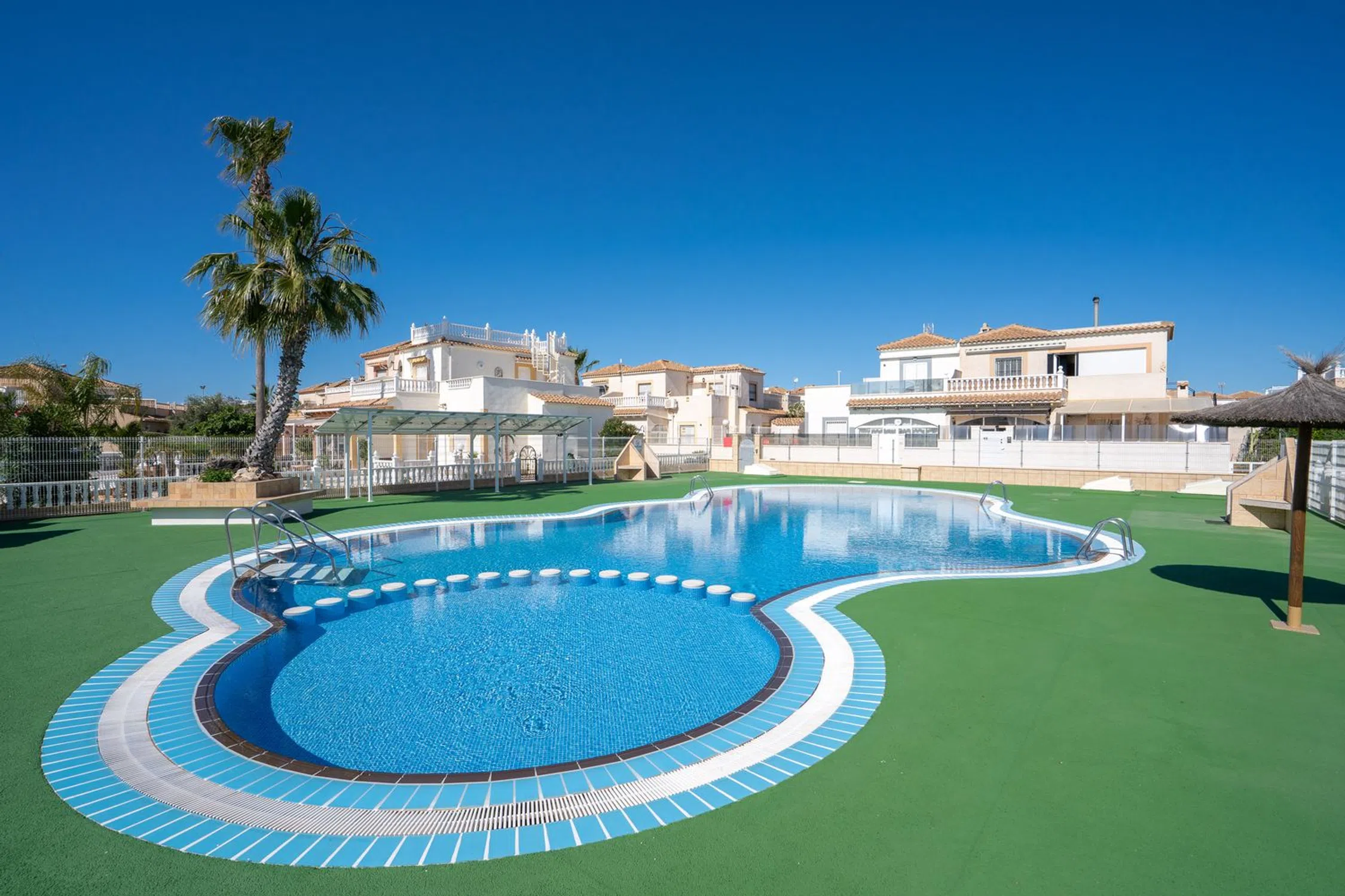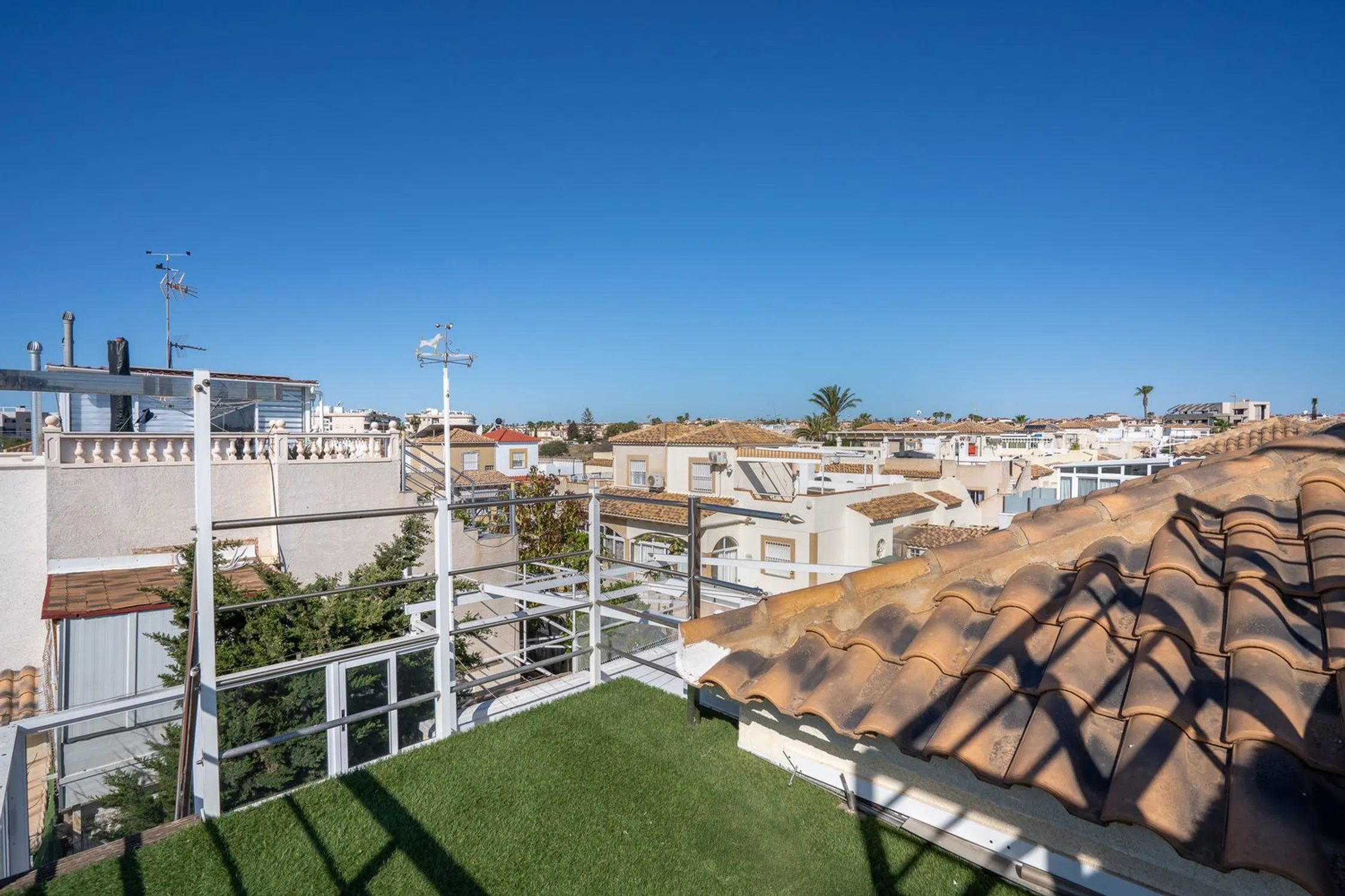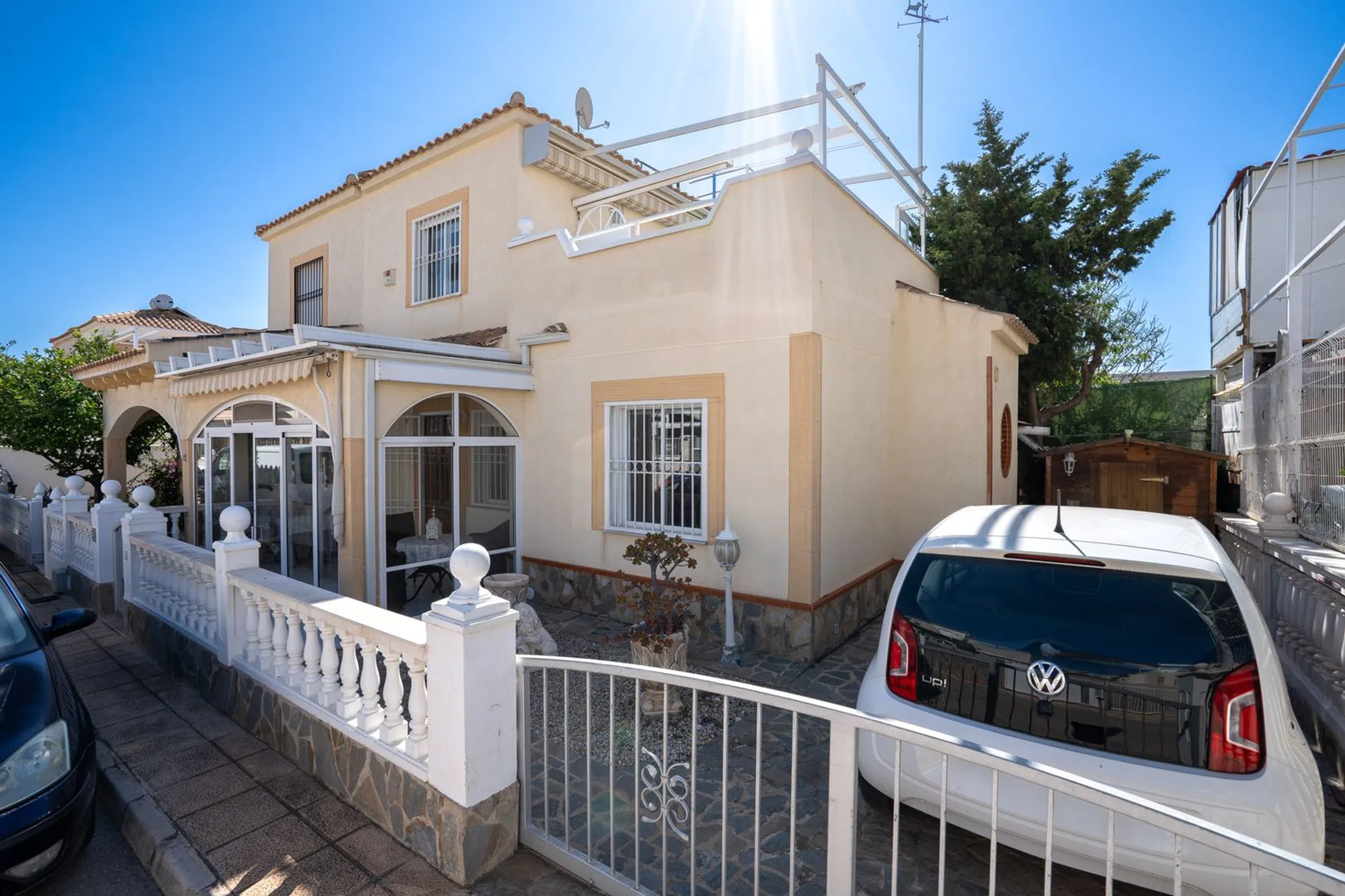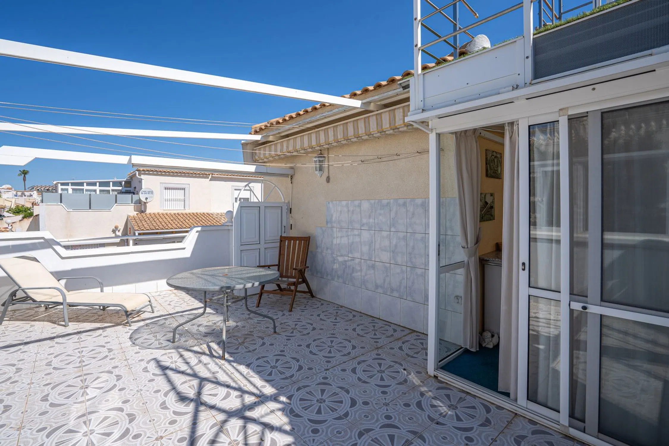 En SkandiaMäklarna en Torrevieja estamos encantados de poder mostrarle esta encantadora casa en una de las zonas más populares de Orihuela Costa, Playa Flamenca. La casa consta de dos plantas. En la planta baja hay un terreno y una terraza acristalada. También puedes aparcar tu coche en la propiedad. La terraza acristalada conduce a la sala de estar con la cocina abierta y el lavadero asociado. Esta planta dispone de dos dormitorios y un baño. En la planta superior hay un dormitorio, un invernadero acristalado y una amplia terraza. Desde esa terraza también se puede subir a una torre mirador con una bonita vista del mar Mediterráneo y sus alrededores. La casa está bien mantenida y pertenece a una bonita comunidad que tiene dos áreas de piscina compartidas. La casa está situada en una zona animada todo el año y hay una amplia oferta de restaurantes, bares, tiendas y todos los servicios necesarios para su estancia en la zona, ya sea permanente o vacacional. La playa más cercana se encuentra a unos 5-7 minutos en bicicleta y a poca distancia a pie o en bicicleta se encuentra el centro comercial más grande de la costa, Zenia Boulevard, así como el mercado de los sábados, que se celebra todas las semanas durante todo el año. Además de las tiendas de lujo, la zona también ofrece karts, bolos, un casino, parques acuáticos o puede jugar 18 hoyos en uno de los 4 campos de golf cercanos. Para aquellos que quieran estar cerca de todo y poder disfrutar del sol en preciosas terrazas. Bienvenido a casa.