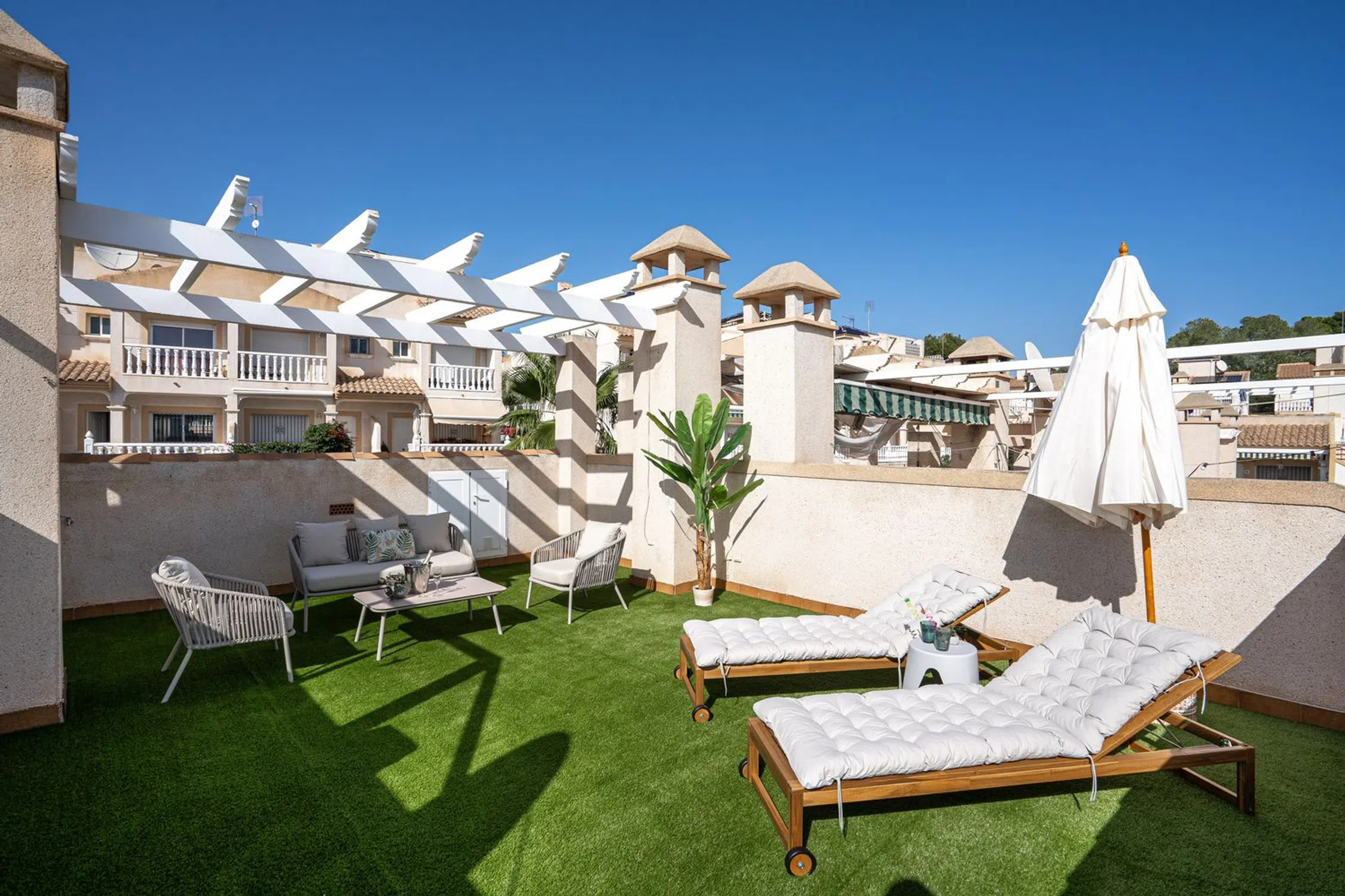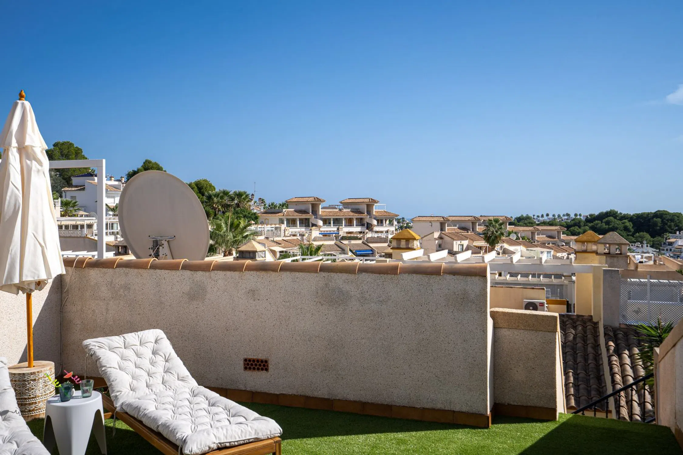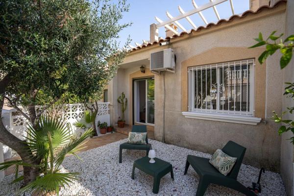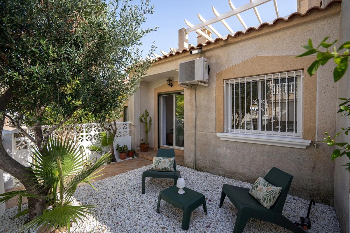 En SkandiaMäklarna, Torrevieja, nos complace dar la bienvenida a nuestros clientes a esta bonita y cuidada casa adosada en Villamartín. La casa es de una sola planta y consta de dos dormitorios, un baño, salón con cocina abierta y lavadero. Desde uno de los dormitorios se accede a un acogedor jardín y desde el salón se accede a una terraza que, a su vez, conduce a la fantástica azotea privada con preciosas vistas a los alrededores. Esta casa cuenta con amplios espacios exteriores. Bajo la casa hay un sótano sin amueblar, perfecto para trastero. La comunidad también incluye una zona de piscina compartida donde podrá refrescarse con el calor. La zona de la piscina cuenta con un gimnasio para mayores, un parque infantil y una biblioteca. Villamartín es un paraíso para los golfistas, con nada menos que cuatro campos de golf en la zona, de los cuales Las Colinas está considerado uno de los mejores de España. Aquí hay vida y actividad durante todo el año y la zona cuenta con una amplia gama de restaurantes, bares, tiendas y todos los servicios necesarios para su estancia, ya sea de vacaciones o de forma permanente. El centro comercial más grande de la costa está a pocos minutos en coche y en los alrededores también hay opciones de entretenimiento como cine, pádel, bolos, minigolf y karts. La playa más cercana está a unos 7 minutos en coche para quienes quieran disfrutar del sol y la piscina. Los constructores también están invirtiendo mucho aquí, se están construyendo muchos nuevos proyectos y toda la zona está en expansión. Desde la casa hay tiendas, restaurantes, bares y todos los servicios necesarios para su estancia en España a poca distancia. Si busca una casa realmente bonita con bonitas terrazas y vistas espectaculares en una zona tranquila y armoniosa, ha encontrado el lugar ideal. Bienvenido a casa.