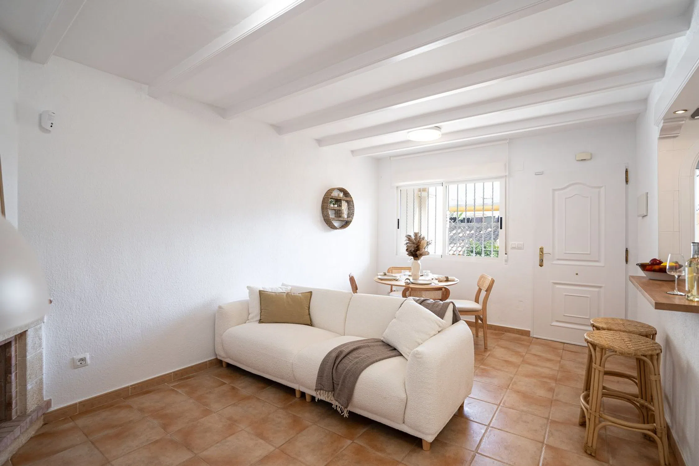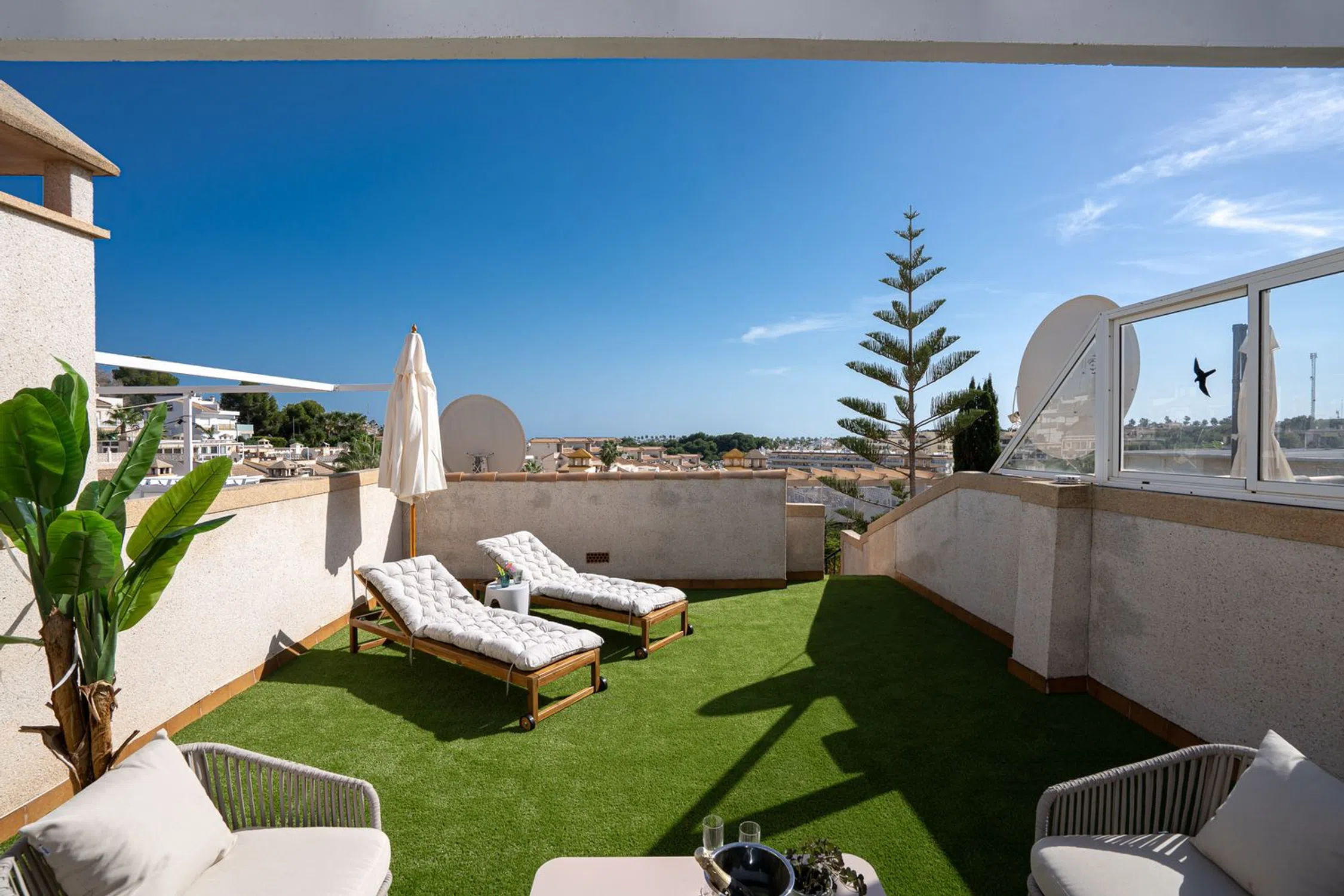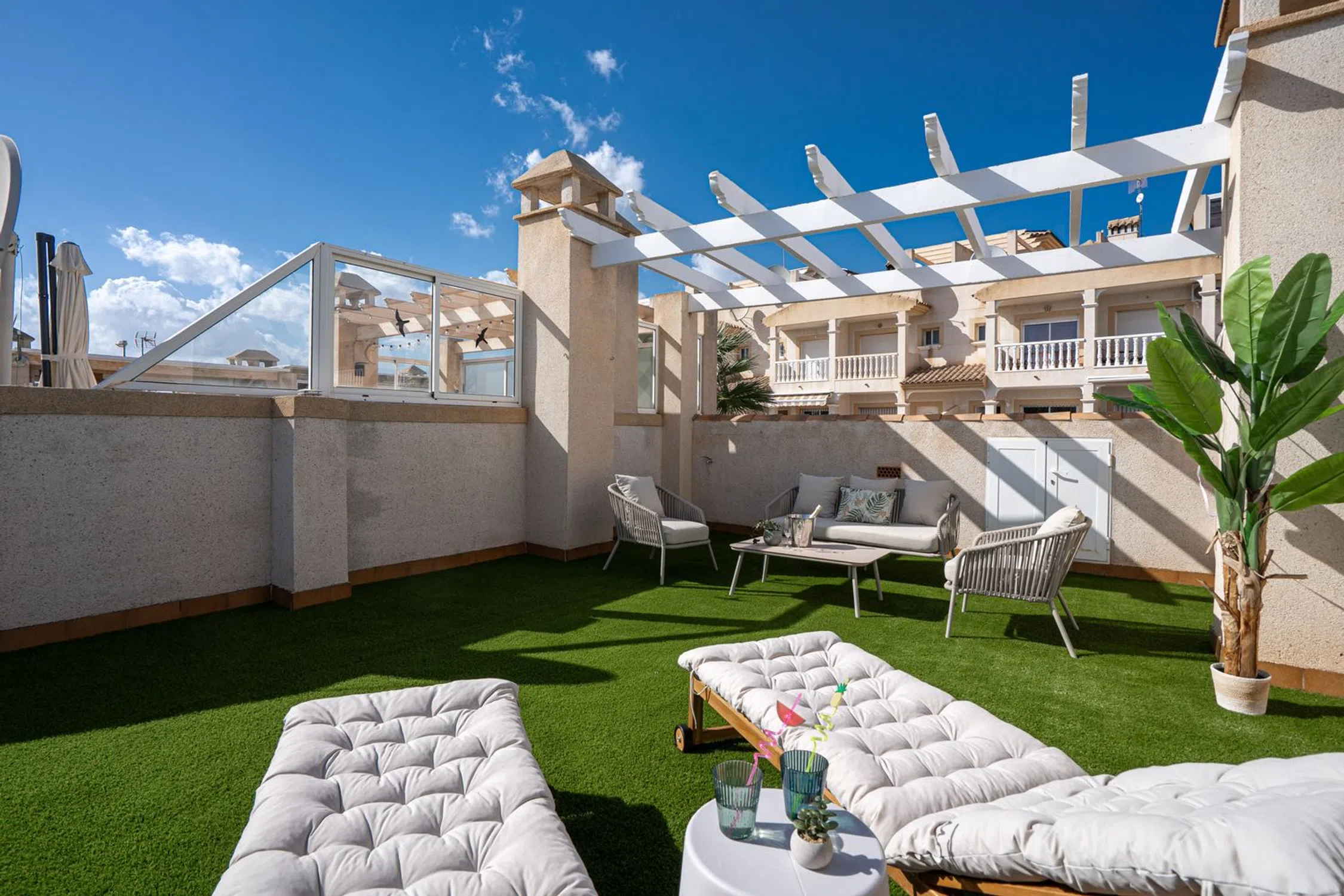 En SkandiaMäklarna, Torrevieja, nos complace dar la bienvenida a nuestros clientes a esta bonita y cuidada casa adosada en Villamartín. La casa es de una sola planta y consta de dos dormitorios, un baño, salón con cocina abierta y lavadero. Desde uno de los dormitorios se accede a un acogedor jardín y desde el salón se accede a una terraza que, a su vez, conduce a la fantástica azotea privada con preciosas vistas a los alrededores. Esta casa cuenta con amplios espacios exteriores. Bajo la casa hay un sótano sin amueblar, perfecto para trastero. La comunidad también incluye una zona de piscina compartida donde podrá refrescarse con el calor. La zona de la piscina cuenta con un gimnasio para mayores, un parque infantil y una biblioteca. Villamartín es un paraíso para los golfistas, con nada menos que cuatro campos de golf en la zona, de los cuales Las Colinas está considerado uno de los mejores de España. Aquí hay vida y actividad durante todo el año y la zona cuenta con una amplia gama de restaurantes, bares, tiendas y todos los servicios necesarios para su estancia, ya sea de vacaciones o de forma permanente. El centro comercial más grande de la costa está a pocos minutos en coche y en los alrededores también hay opciones de entretenimiento como cine, pádel, bolos, minigolf y karts. La playa más cercana está a unos 7 minutos en coche para quienes quieran disfrutar del sol y la piscina. Los constructores también están invirtiendo mucho aquí, se están construyendo muchos nuevos proyectos y toda la zona está en expansión. Desde la casa hay tiendas, restaurantes, bares y todos los servicios necesarios para su estancia en España a poca distancia. Si busca una casa realmente bonita con bonitas terrazas y vistas espectaculares en una zona tranquila y armoniosa, ha encontrado el lugar ideal. Bienvenido a casa.