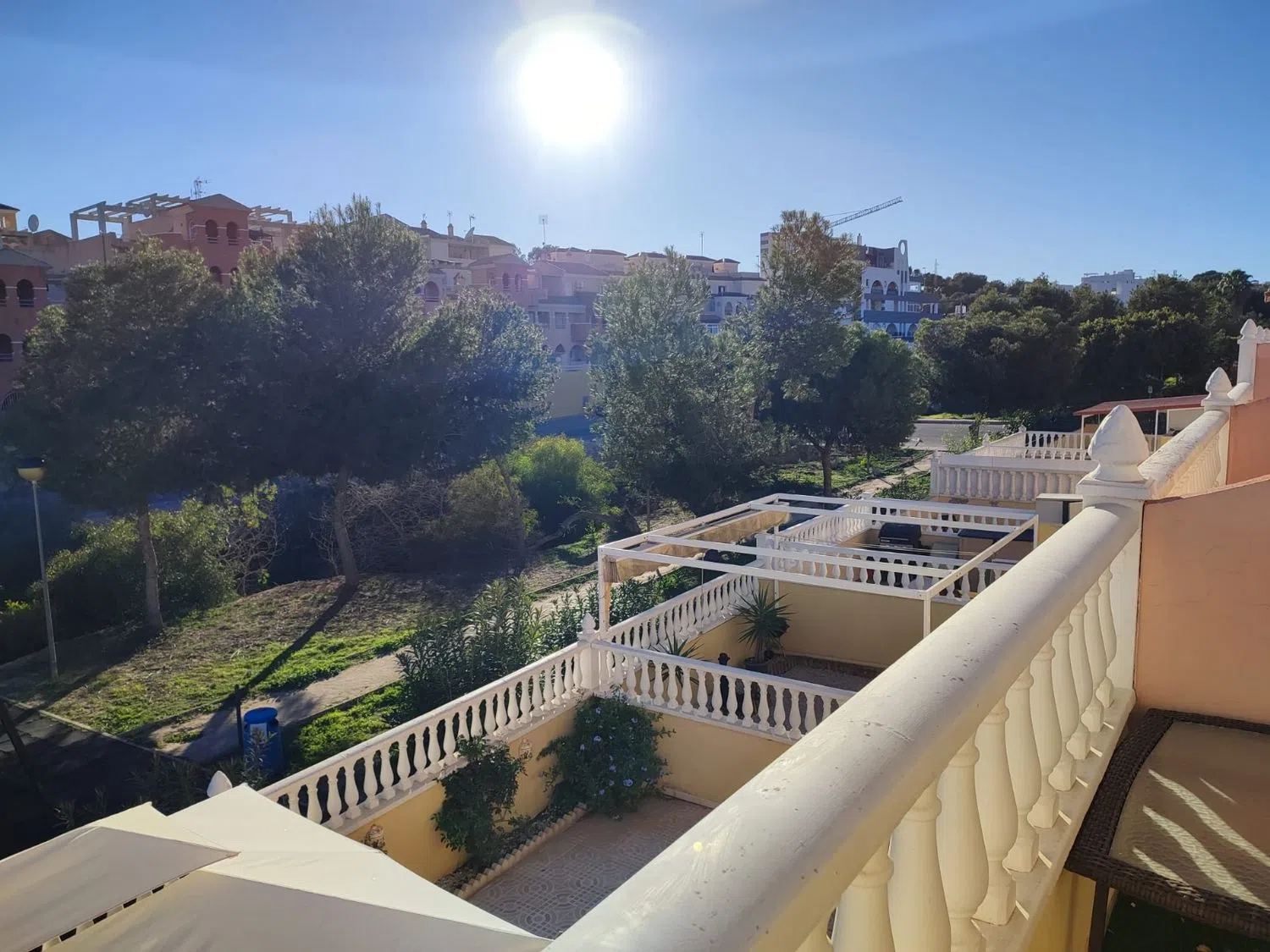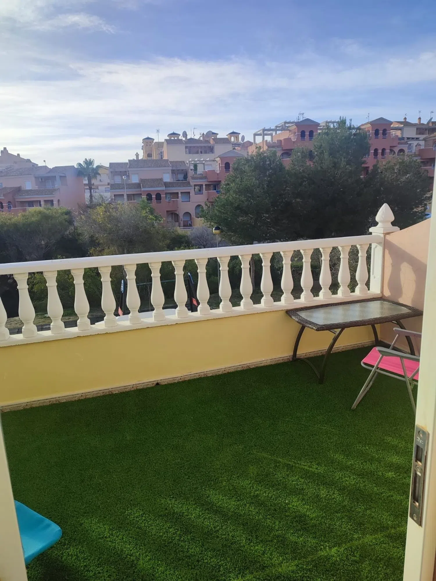 Chalet adosado de 3 dormitorios con jardín privado en Villamartín. Esta vivienda tiene 3 dormitorios, 2 baños, dos terrazas, cocina independiente, jardín frontal y otro trasero con un gran toldo, ventiladores de techo en las habitaciones y aire acondicionado en el salón-comedor. Se encuentra en un excelente estado de mantenimiento. Situado en una urbanización con zonas verdes y piscina comunitaria. A pocos minutos a pie de restaurantes, cafés, supermercados y otros comercios. A 5 minutos en coche de cuatro campos de golf, 10 minutos al centro comercial La Zenia Boulevard y a las calas y playas de la Dehesa de Campoamor, Cabo Roig y La Zenia.