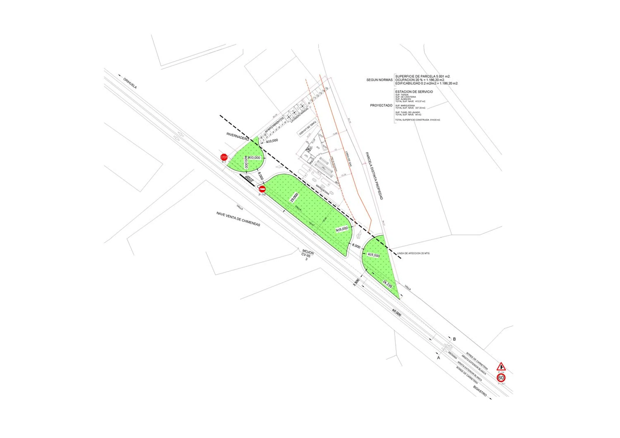 Terreno de 5.931 metros cuadrados, sito en la Carretera de Orihuela a Bigastro. Declaración de Interés Comunitario (DIC) aprobada para una Estación de Servicio, lavadero, tienda y Cafetería.