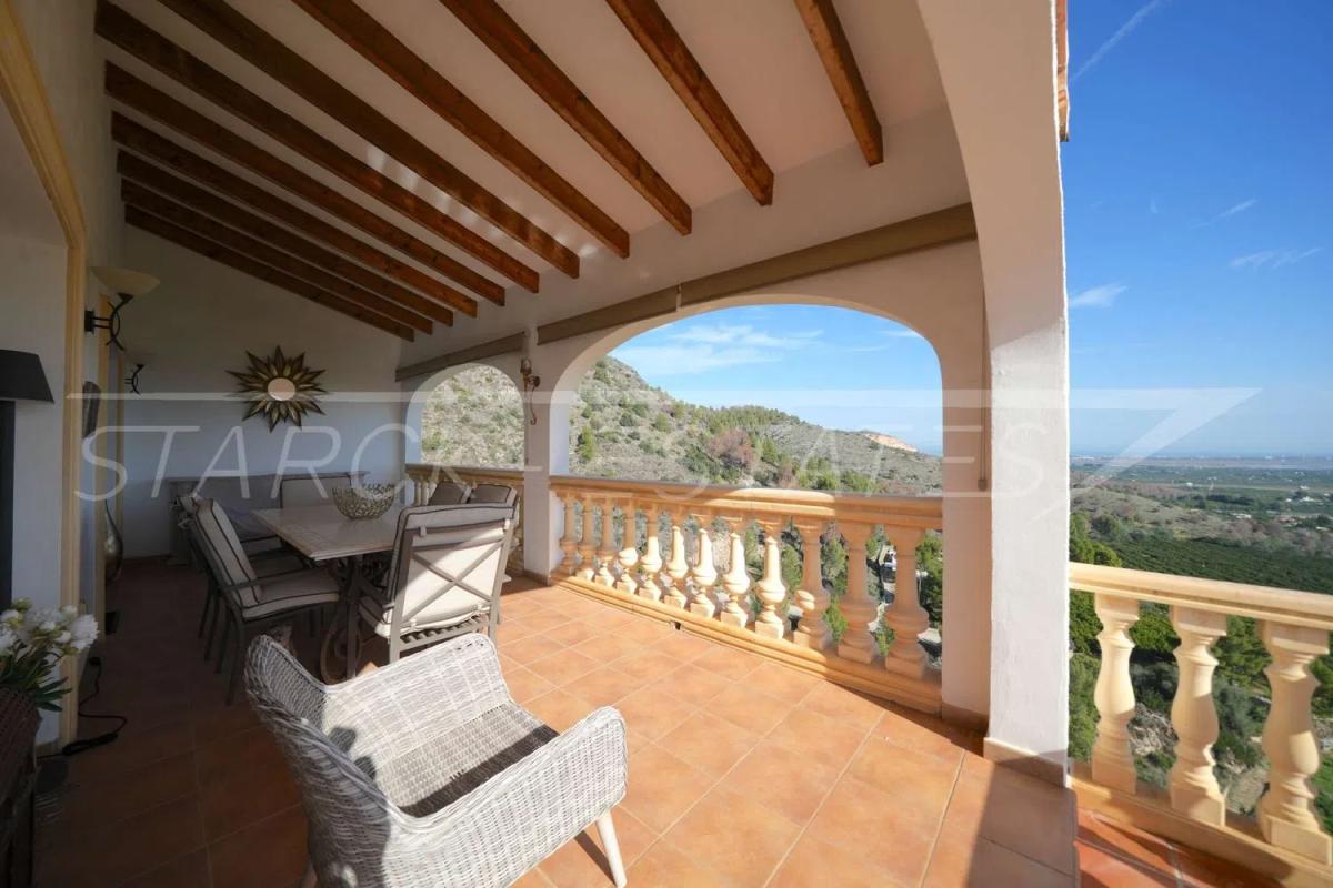The layout has been crafted for flexibility and versatility. The main house spans two levels and is complemented by an independent apartment with its own entrance. On the upper floor, you will find an open-plan living and dining area, two generously sized bedrooms, a modern bathroom with a shower, and a stylish fully equipped kitchen. The living room opens directly onto a covered terrace, where arches perfectly frame the stunning views—an ideal spot to relax and enjoy the beauty of the surroundings throughout the year.