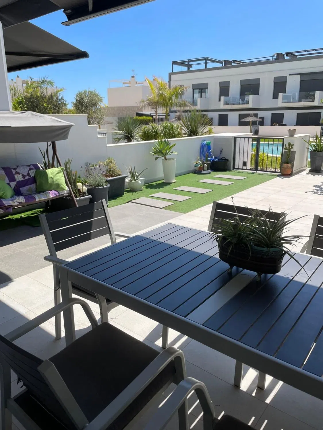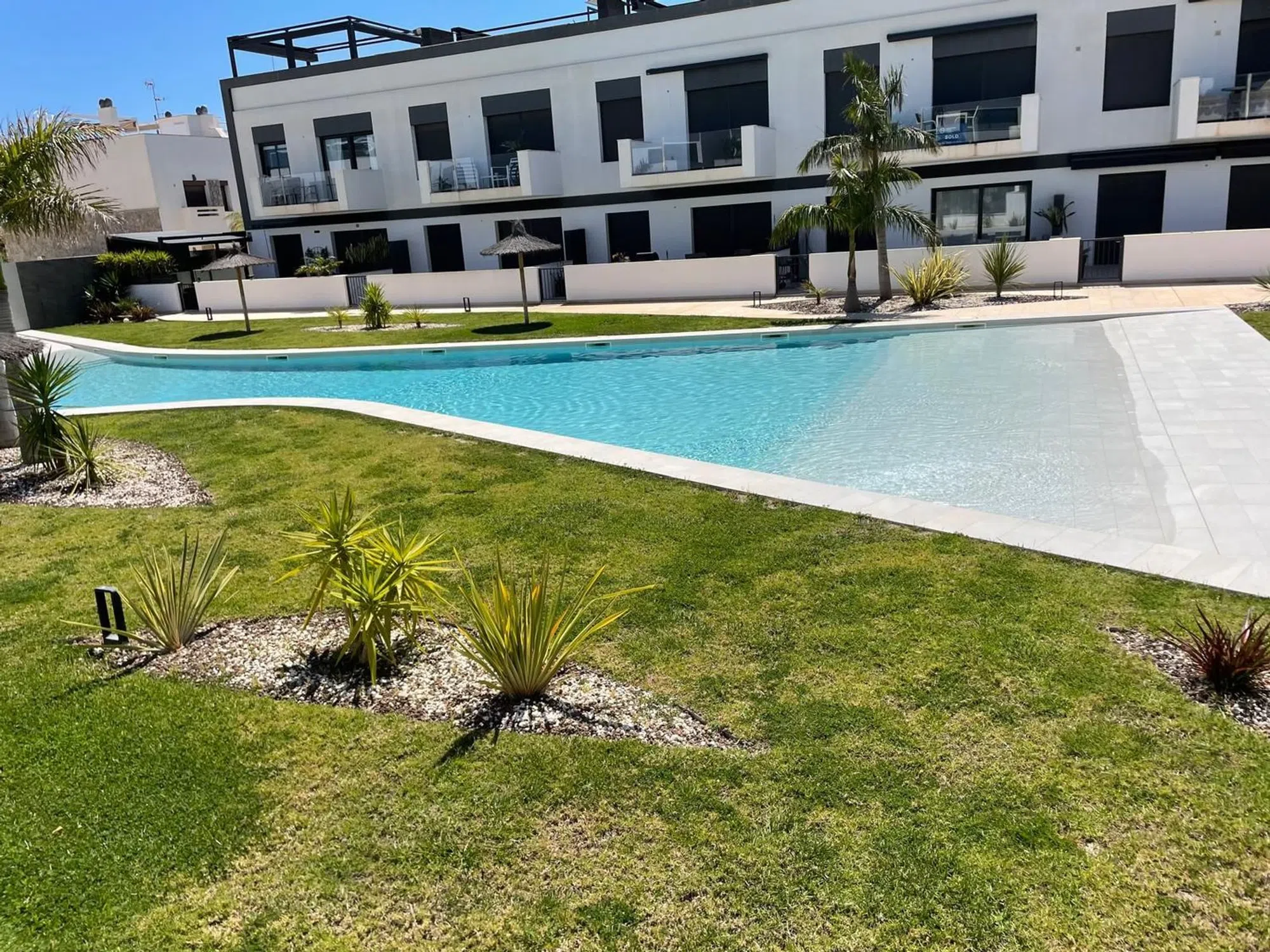 Welcome to this bright and charming apartment on the ground floor with 3 bedrooms and 2 bathrooms, located in Torre de la Horadada. The residence has a sunny terrace in south facing overlooking the beautiful pool area, as well as private parking right on the entrance. Here you live with an unbeatable location, only a few steps from restaurants, shops and the beach – just a 10-minute walk to the Mediterranean. A comfortable and inviting home to enjoy.