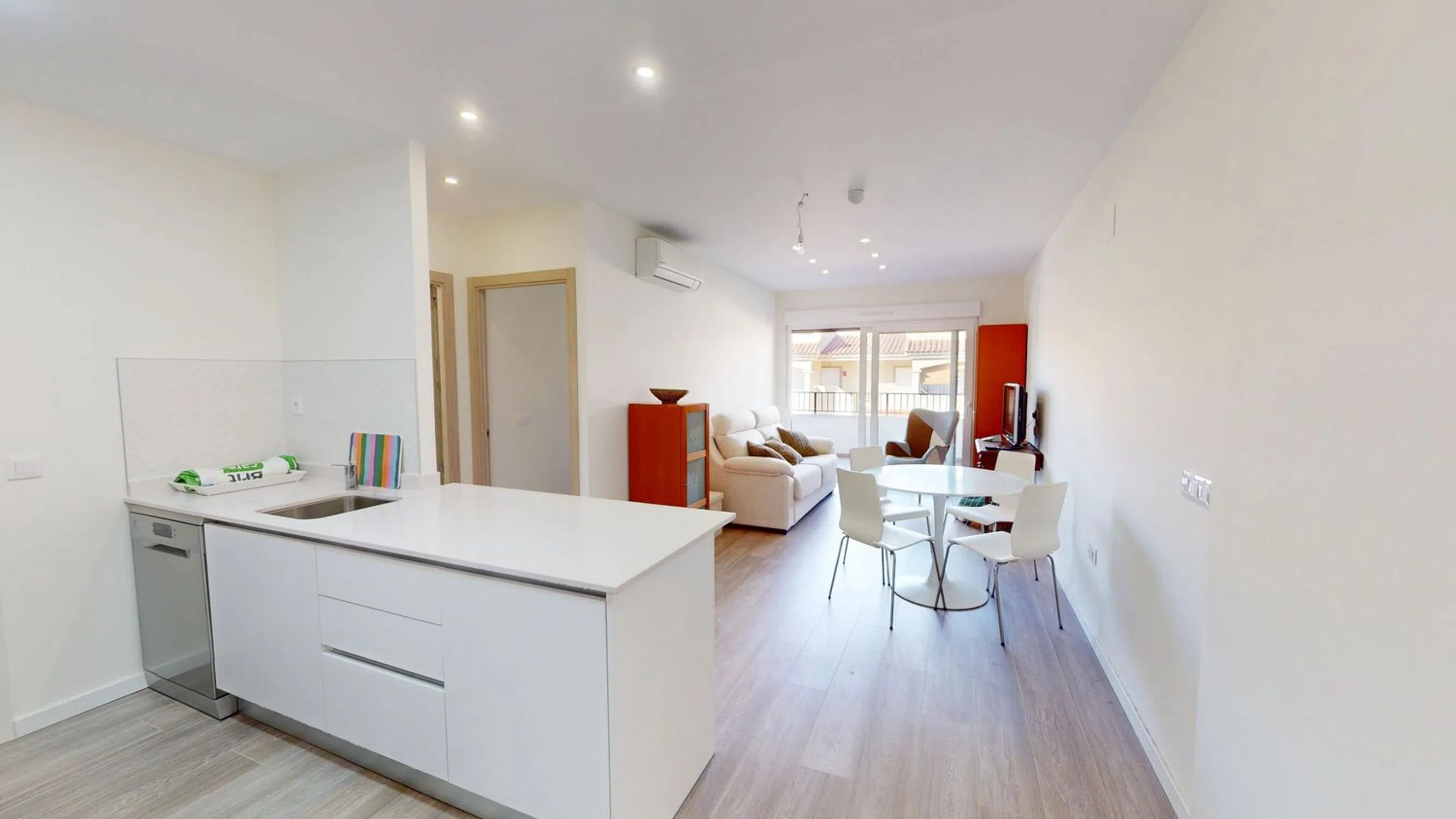 Apartamento moderno en la hermosa Mil Palmeras – A solo 2 km de la playa Descubre este apartamento de reciente construcción en la idílica zona de Mil Palmeras, finalizado en 2024 y ubicado a tan solo 2 kilómetros de una de las playas de arena más hermosas de la Costa Blanca. La propiedad cuenta con un dormitorio y un baño con una moderna ducha a ras de suelo. La espaciosa cocina americana se integra a la perfección con el comedor y el salón, creando un espacio luminoso y confortable. Desde el salón se accede a la terraza, orientada al noroeste, ideal para disfrutar del sol de la tarde. Junto a la cocina hay un lavadero equipado con caldera y lavadora. El apartamento se vende completamente amueblado, incluyendo electrodomésticos, por lo que puede entrar a vivir de inmediato. Entre las características adicionales se incluyen una plaza de aparcamiento subterráneo y aire acondicionado (frío/calor) en toda la propiedad para mayor comodidad durante todo el año. Dentro del complejo residencial, podrá disfrutar del acceso a la piscina comunitaria y al gimnasio, ideales para combinar la relajación con un estilo de vida activo en un entorno precioso.