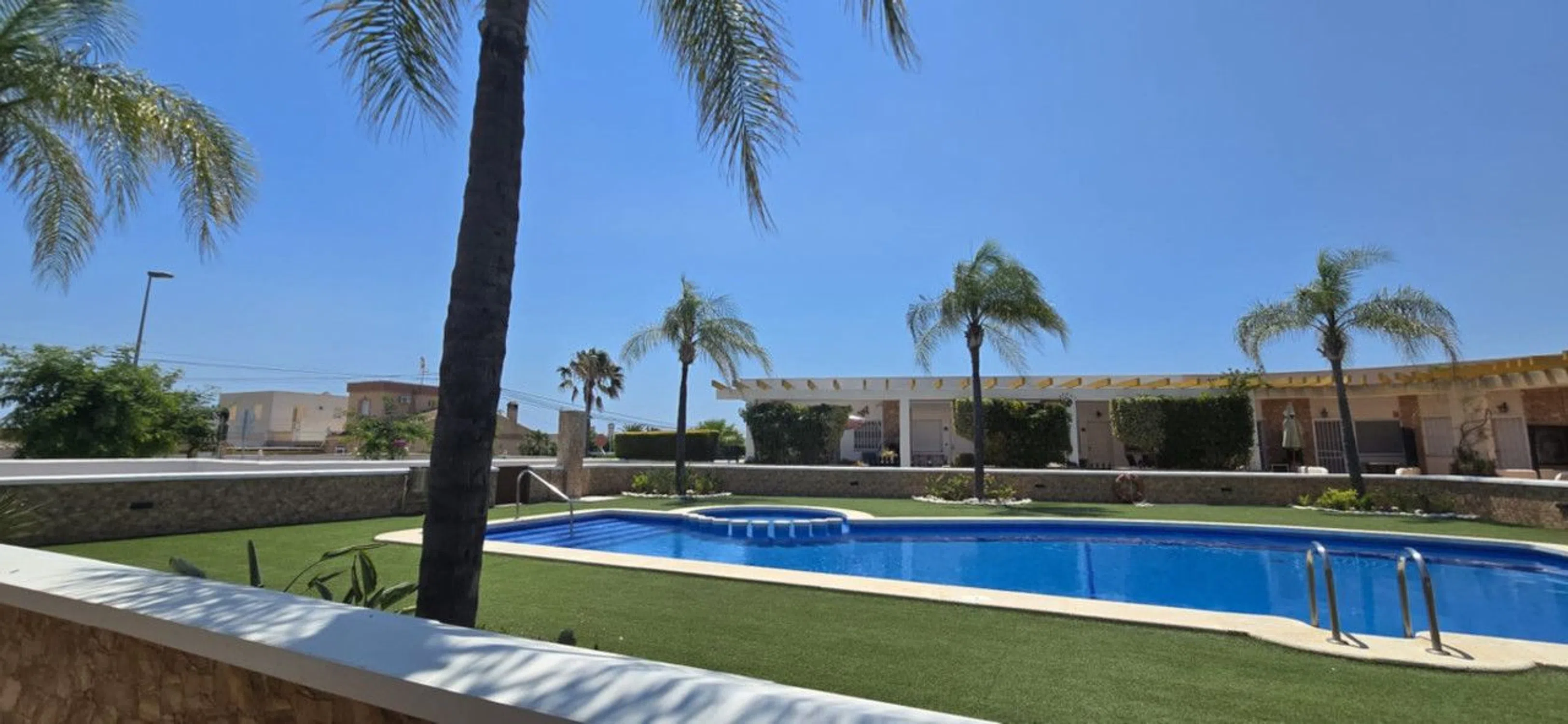¡Descubre tu nuevo hogar en Mil Palmeras! Esta encantadora bungalow adosado en esquina reúne comodidad, luminosidad y calidad de vida. Cuenta con dos acogedores dormitorios y una terraza soleada con vistas a la piscina, ideal para disfrutar del clima mediterráneo durante todo el año. La vivienda ofrece un amplio salón-comedor, perfecto para reuniones familiares, junto a una cocina abierta totalmente equipada, diseñada para aportar amplitud, funcionalidad y un estilo moderno al espacio. El baño renovado con plato de ducha añade un toque actual y práctico. Sus espacios exteriores son uno de sus mayores atractivos • Terraza delantera de 26 m², perfecta para tomar el sol o disfrutar de comidas al aire libre. • Terraza acristalada de 23 m² conectada a la cocina, creando un ambiente versátil para usar durante todo el año. La parcela suma 133 m² e incluye plaza de aparcamiento privada, un jardín muy bien cuidado y una zona de barbacoa exclusiva, ideal para disfrutar en familia o con amigos. Situada a solo 1 km de las hermosas playas, esta propiedad forma parte de un residencial privado con zonas verdes y piscina comunitaria, lo que la convierte en una opción perfecta tanto como vivienda vacacional como inversión de alta rentabilidad.