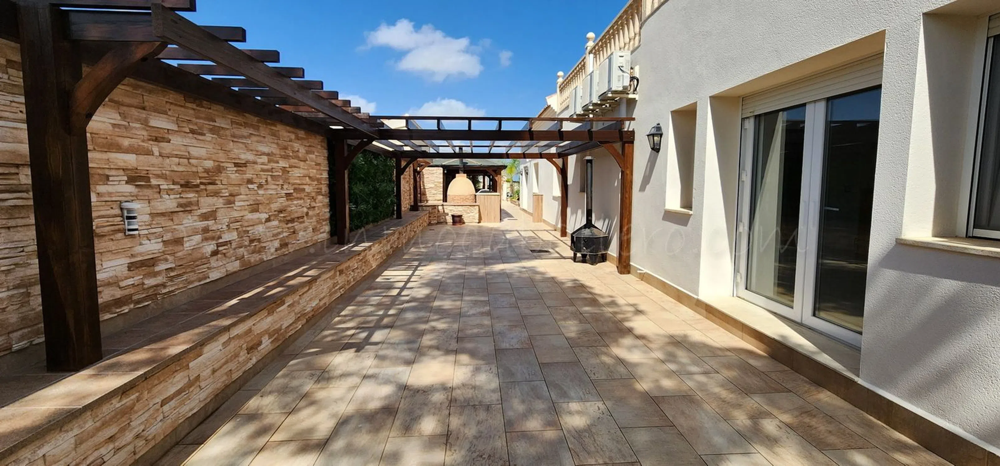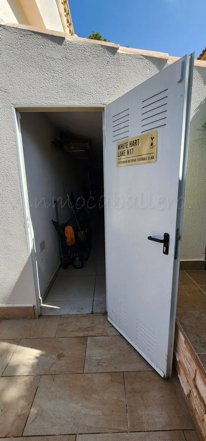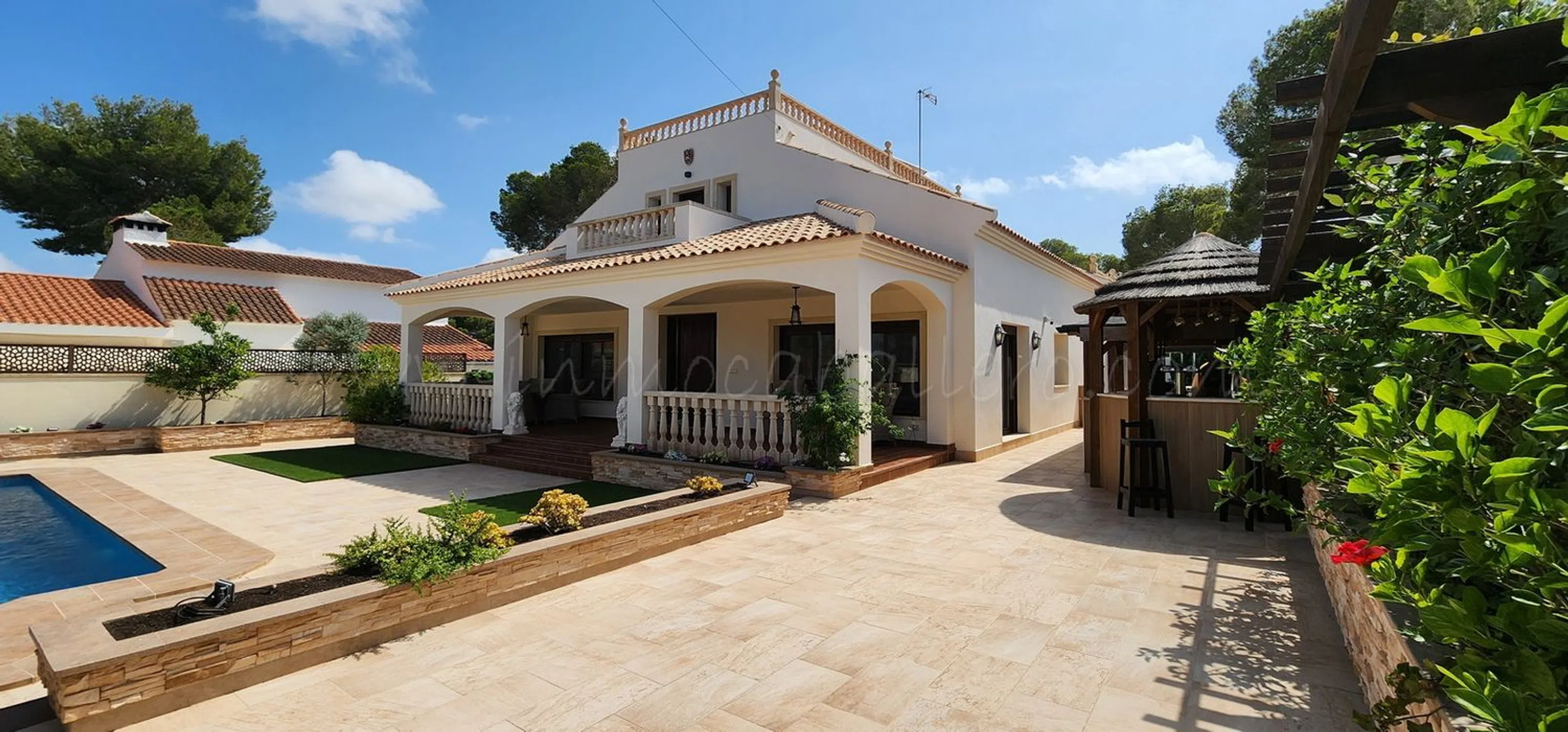 Ubicada en una calle tranquila y privada de Pinar de Campoverde a solo 3 minutos andando al centro, se encuentra esta hermosa villa renovada. Se accede a la casa principal a través de un encantador porche con arcos, que conduce a un amplio salón, a la derecha está la zona de comedor con acceso a la parcela y la cocina completamente equipada. Un pasillo da dos dormitorios con armarios empotrados, ambos con cuarto de baño en-suite, un aseo, una oficina (que se puede usar como dormitorio) con acceso a una terraza y con baño en-suite, el dormitorio principal con acceso a una terraza, baño en-suite y vestidor y un lavadero que da a una terraza. En primera planta, acceso por escalera exterior, se encuentra un apartamento con salón, cocina, cuarto de baño, trastero que se puede usar vestidor, dormitorio con un balcón y una enorme terraza con preciosas vistas. El exterior de la propiedad sigue impresionando con una cochera cubierta, un trastero, aseo, un jardín maduro que proporciona privacidad, una gran piscina privada, que disfruta de sol todo el día y ofrece amplio espacio para tumbonas y zonas de descanso, ducha exterior, cascada de agua, zona con bar, barbacoa y cocina exterior completamente equipada. Todo esto, a solo unos minutos de servicios, tiendas y restaurantes locales. Cuenta con una amplia gama de extras, como aire acondicionado, calefacción por suelo radiante, placas solares, armarios empotrados, ventiladores de techo, portón entrada de coche eléctrico, estufa de leña, trastero y muchas cosas más. Esta propiedad sería ideal como vivienda permanente o de vacaciones, con espacio para toda la familia. IBI casa: 1.000 €/anual IBI entrada vehiculo: 25 €/anual 3 km de un campo de golf 12 kilómetros de la playa 50 minutos del aeropuerto de Alicante.