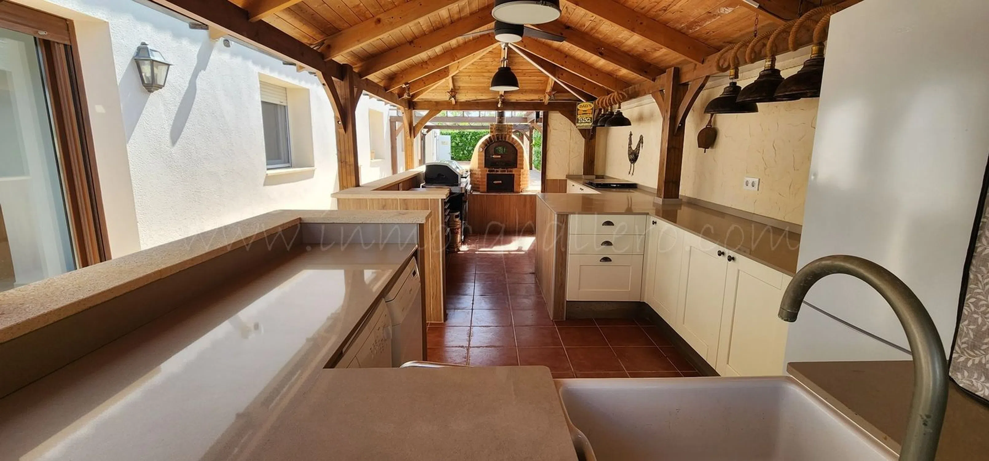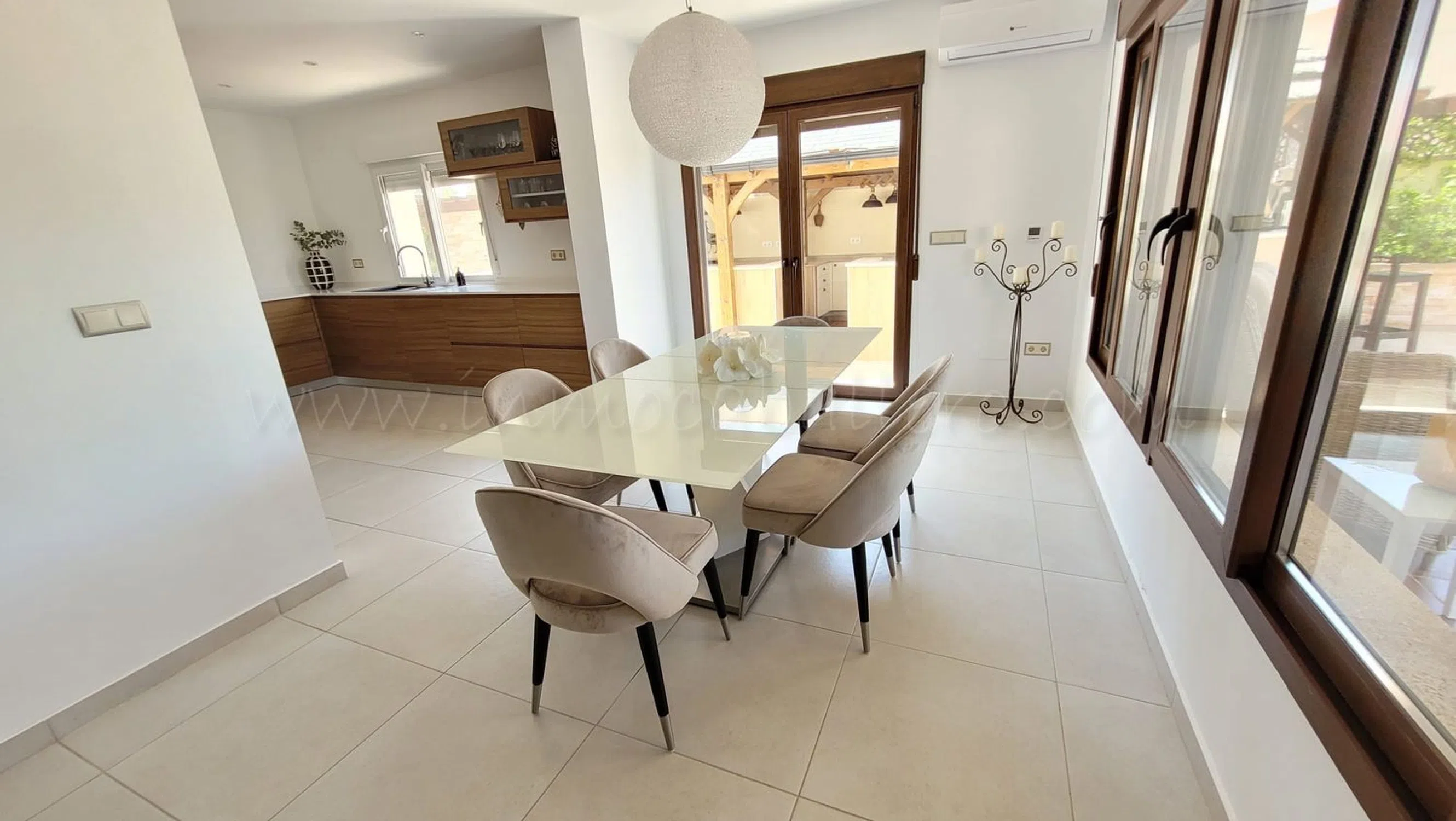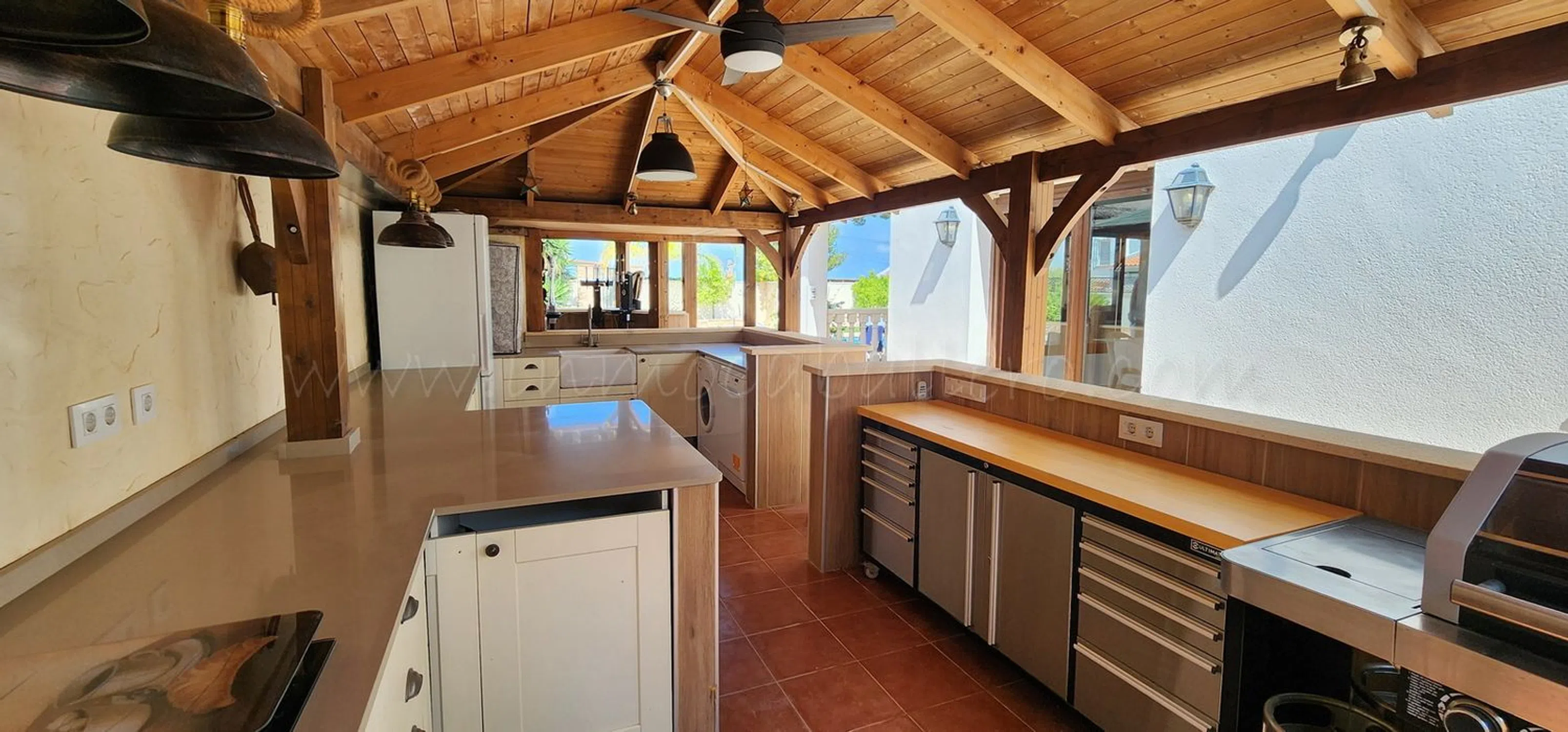 Ubicada en una calle tranquila y privada de Pinar de Campoverde a solo 3 minutos andando al centro, se encuentra esta hermosa villa renovada. Se accede a la casa principal a través de un encantador porche con arcos, que conduce a un amplio salón, a la derecha está la zona de comedor con acceso a la parcela y la cocina completamente equipada. Un pasillo da dos dormitorios con armarios empotrados, ambos con cuarto de baño en-suite, un aseo, una oficina (que se puede usar como dormitorio) con acceso a una terraza y con baño en-suite, el dormitorio principal con acceso a una terraza, baño en-suite y vestidor y un lavadero que da a una terraza. En primera planta, acceso por escalera exterior, se encuentra un apartamento con salón, cocina, cuarto de baño, trastero que se puede usar vestidor, dormitorio con un balcón y una enorme terraza con preciosas vistas. El exterior de la propiedad sigue impresionando con una cochera cubierta, un trastero, aseo, un jardín maduro que proporciona privacidad, una gran piscina privada, que disfruta de sol todo el día y ofrece amplio espacio para tumbonas y zonas de descanso, ducha exterior, cascada de agua, zona con bar, barbacoa y cocina exterior completamente equipada. Todo esto, a solo unos minutos de servicios, tiendas y restaurantes locales. Cuenta con una amplia gama de extras, como aire acondicionado, calefacción por suelo radiante, placas solares, armarios empotrados, ventiladores de techo, portón entrada de coche eléctrico, estufa de leña, trastero y muchas cosas más. Esta propiedad sería ideal como vivienda permanente o de vacaciones, con espacio para toda la familia. IBI casa: 1.000 €/anual IBI entrada vehiculo: 25 €/anual 3 km de un campo de golf 12 kilómetros de la playa 50 minutos del aeropuerto de Alicante.