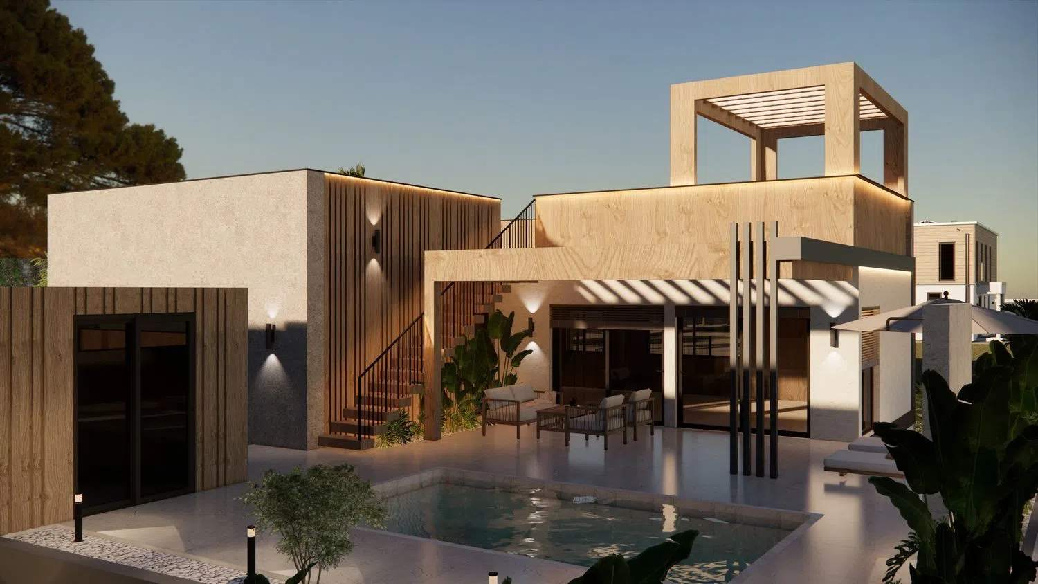 The villa is constructed using cross-laminated timber (CLT), an innovation introduced in the 1990s in Austria. This material offers superior acoustics, seismic resistance, thermal efficiency, and fire safety compared to traditional materials, making it a remarkable alternative for various types of constructions. Its aesthetic appeal and environmental benefits further underscore its uniqueness.