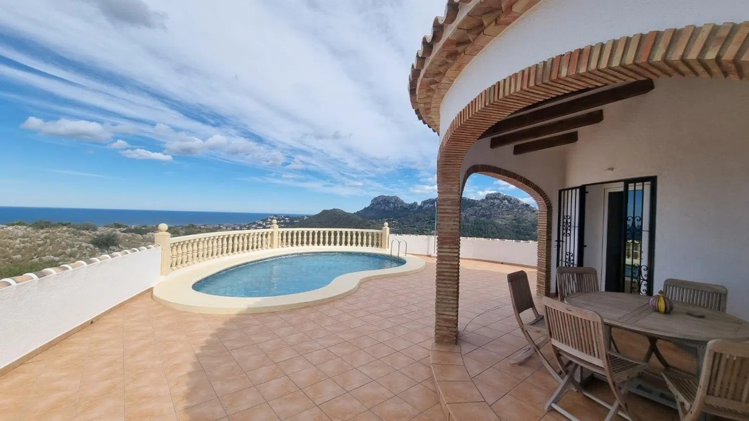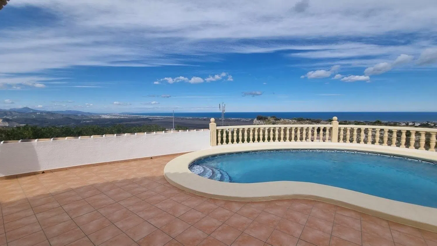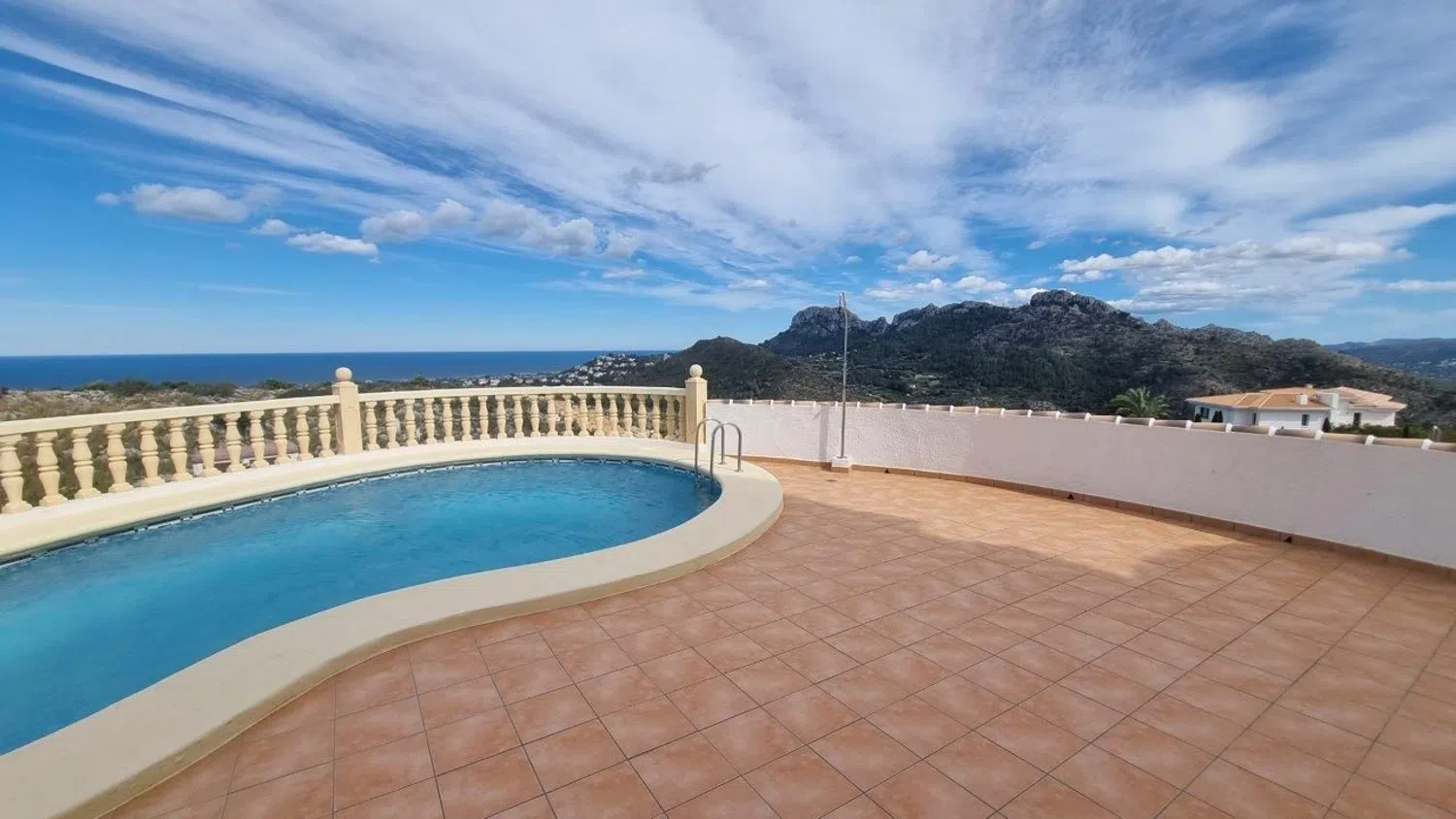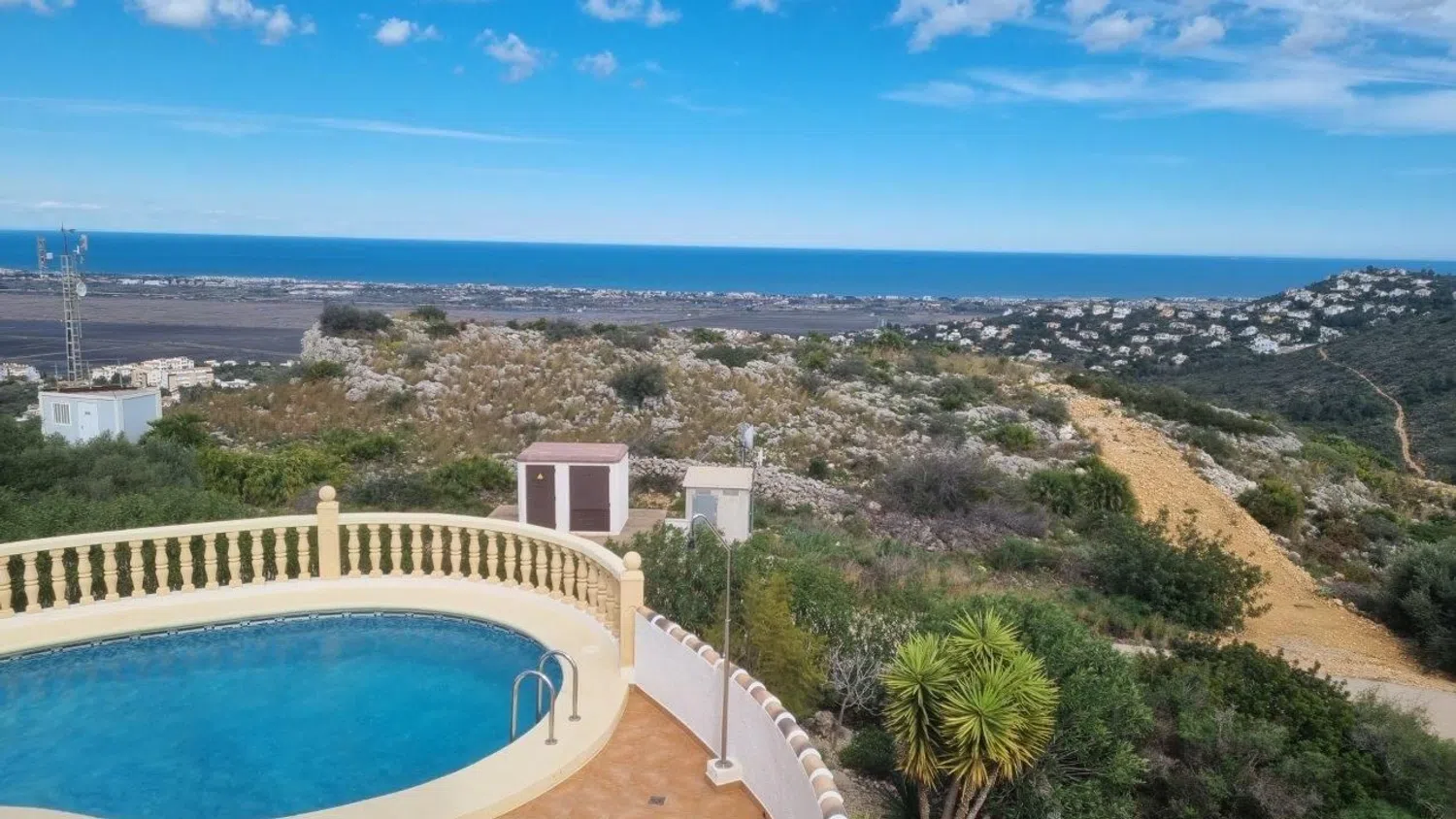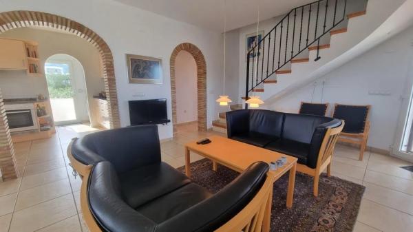 Villa con piscina para comprar en Ráfol de Almunia. Localización: Ráfol de Almunia es una población de unos 800 habitantes, situada en el Valle de Orba y protegida por la Sierra de Segaria. Es una localidad residencial con una economía agrícola y de servicios, tiene piscina y polideportivo municipal. Está bien conectado por carretera con Dénia, las playas, el golf y el hospital (15 kilómetros). El centro comercial está a pocos minutos en coche. La propiedad está en una urbanización consolidada en lo alto de la colina y con residentes permanentes. Descripción: Villa de 3 habitaciones y 2 baños con vistas panorámicas. Distribuida (124 m²) en dos plantas. En la planta principal: recibidor, salón-comedor con chimenea y salida a la terraza, cocina con lavadero, dos habitaciones y un baño. En la planta de arriba una habitación con salida a una terraza y un baño. En el exterior hay una amplia terraza frontal, piscina, naya y otras terrazas además del terreno y la zona de parking (parcela 840 m²). Destacado: Es una propiedad luminosa, cómoda y bien mantenida. Ideal para quienes huyen de espacios masificados sin renunciar a la proximidad de todo tipo de comodidades y servicios.