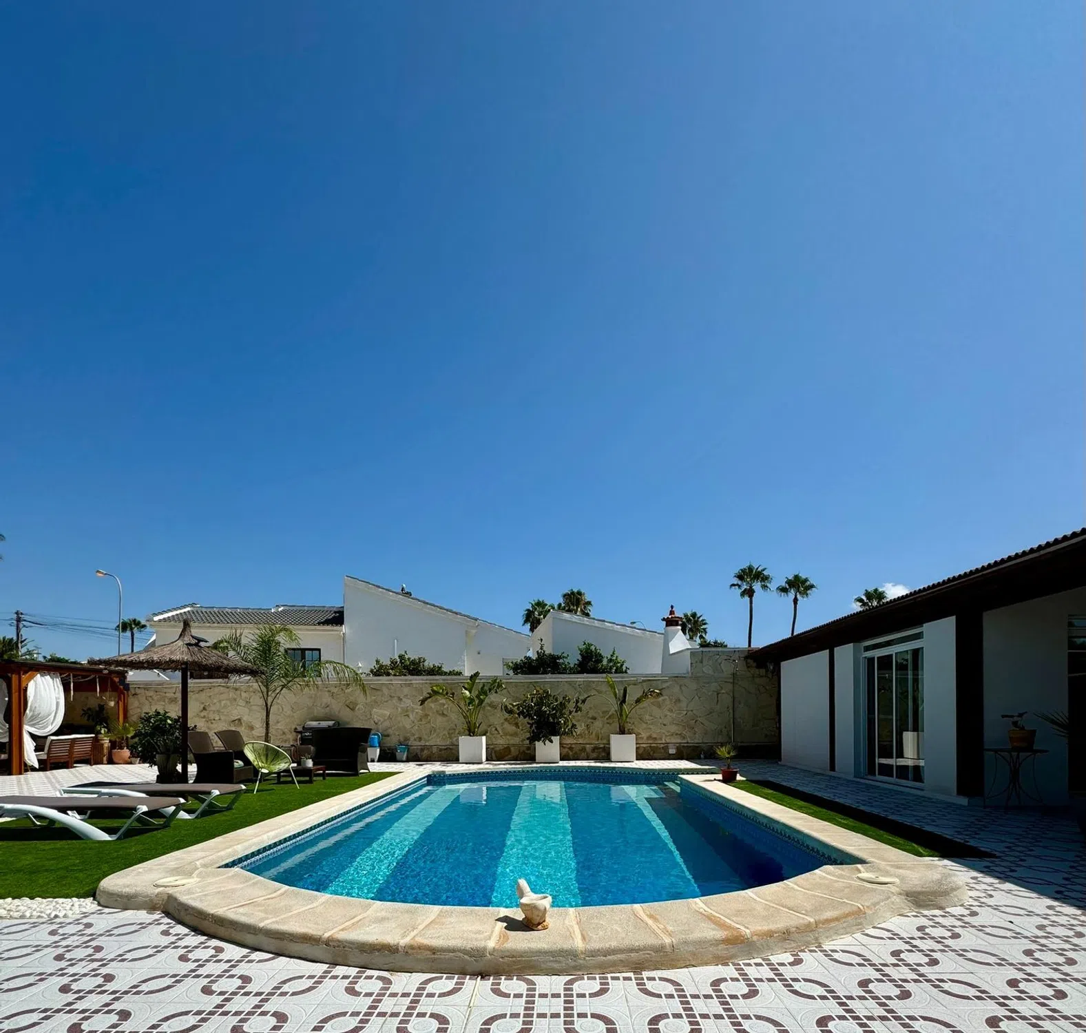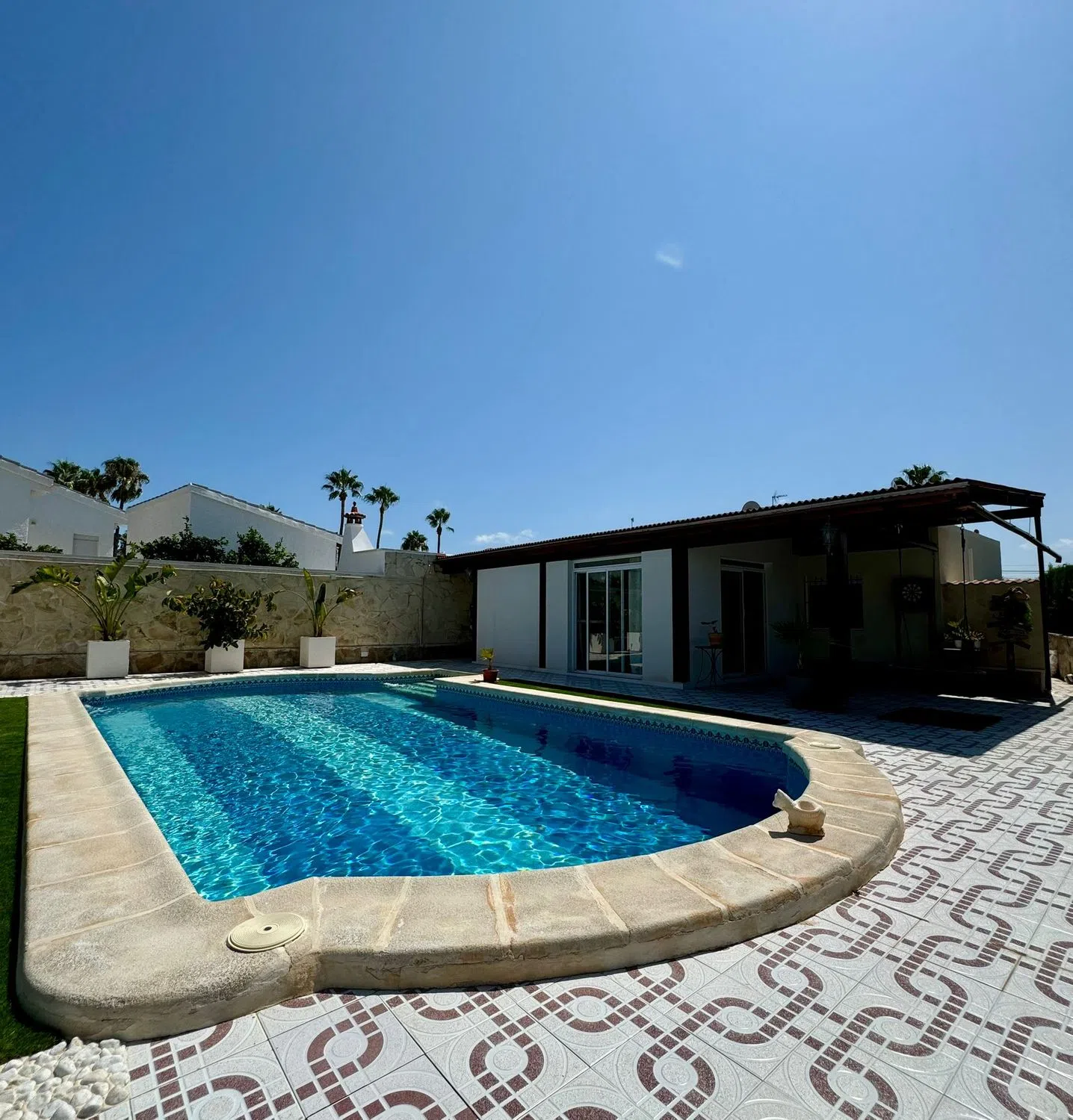 ¡Descubre tu nuevo hogar en Ciudad Quesada, Alicante! Este magnífico chalet independiente de una sola altura te ofrece todo lo que necesitas para vivir con comodidad y estilo. Con 301 m² construidos y 295 m² útiles, esta propiedad cuenta con un gran y luminoso salón comedor, una cocina americana amueblada y equipada, y tres habitaciones amplias, incluyendo una principal con armario de gran capacidad y con baño completo en suite. Además, dispone de otro baño completo con bañera. La casa también incluye una terraza acristalada actualmente utilizada como oficina, ideal para quienes trabajan desde casa. En la planta superior, encontrarás un amplio solárium con preciosas vistas, perfecto para relajarte y disfrutar del clima mediterráneo. La parcela de 834 m² alberga una gran piscina, una zona de chill out techada y equipada, y una casa de invitados con porche, salón comedor, cocina americana, habitación con armario empotrado, baño completo y pequeño trastero. Para mayor comodidad, la propiedad cuenta con dos garajes cerrados con puerta automática, uno de ellos con capacidad para guardar una caravana. Construida en 1987 y en buen estado, esta casa ofrece calefacción por bomba de frío/calor y tiene una calificación energética E. A 2 minutos del Aquapark de Rojales, cerca de bares y restaurantes, farmacia, colegios y todos los servicios que pueda necesitar. A 10 minutos de las playas de Guardamar del segura y a 35 minutos del aeropuerto de Alicante. No pierdas la oportunidad de vivir en este oasis de tranquilidad y lujo. ¡Ven a visitarlo y enamórate de tu nuevo hogar!