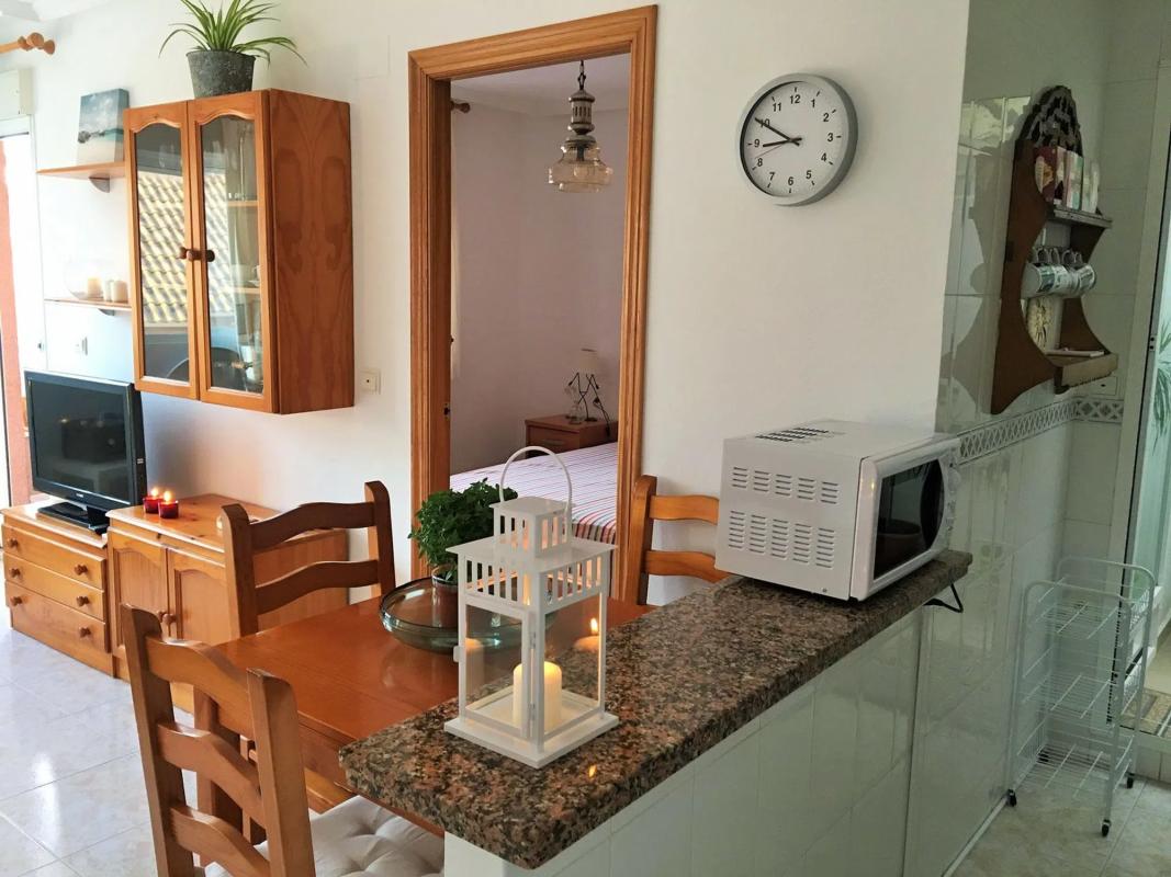 Bonito apartamento de 45 m2 útiles en una urbanización con piscina. Se encuentra amueblado y en muy buenas condiciones de conservación. Es muy luminoso, con balcón y patio interior. Está equipado con electrodomésticos como horno, lavadora, nevera, calentador, microondas. El salón cuenta con una lámpara ventilador. La imagen del aseo es anterior, actualmente se ha instalado mampara en el plato de ducha. El precio incluye una amplia plaza de garaje de 5,40m x 2,70 m y un trastero de 4 m2 situado en la azotea. La piscina está equipada con mobiliario tipo bancos, sombrillas, tobogán, jardinería y duchas. El piso cumple con la normativa de accesibilidad y no existen obstáculos para las personas con movilidad reducida ni en los accesos a la vivienda ni a la piscina. Excelente ubicación a 3 min (300 m) del paseo marítimo y la playa; y a 6 min (500 m) de la zona comercial (supermercado, gimnasio, cines, bares.. . ). Está bien comunicado con Alicante, el aeropuerto y Elche, a tan solo 20 min en coche. También a 6 min en coche del puerto para visitar la preciosa isla de Tabarca. Nice apartment with 45 m2 of usable space in a residential complex with a swimming pool. It is furnished and in very good condition. It is very bright, with a balcony and inside patio. It is equipped with appliances such as an oven, washing machine, refrigerator, water heater, and microwave. The living room has a ceiling fan. The price includes a large parking space measuring 5.40 m x 2.70 m and a 4 m² storage room located on the roof. The swimming pool is equipped with benches, parasols, a slide, landscaping, and showers. The apartment complies with accessibility regulations and there are no obstacles for people with reduced mobility, either in the accesses to the apartment or to the swimming pool. Excellent location 3 minutes (300 m) from the seafront promenade and the beach, and 6 minutes (500 m) from the shopping area (supermarket, gym, cinemas, bars, etc. ). It is well connected to Alicante, the airport, and Elche, just 20 minutes away by car.