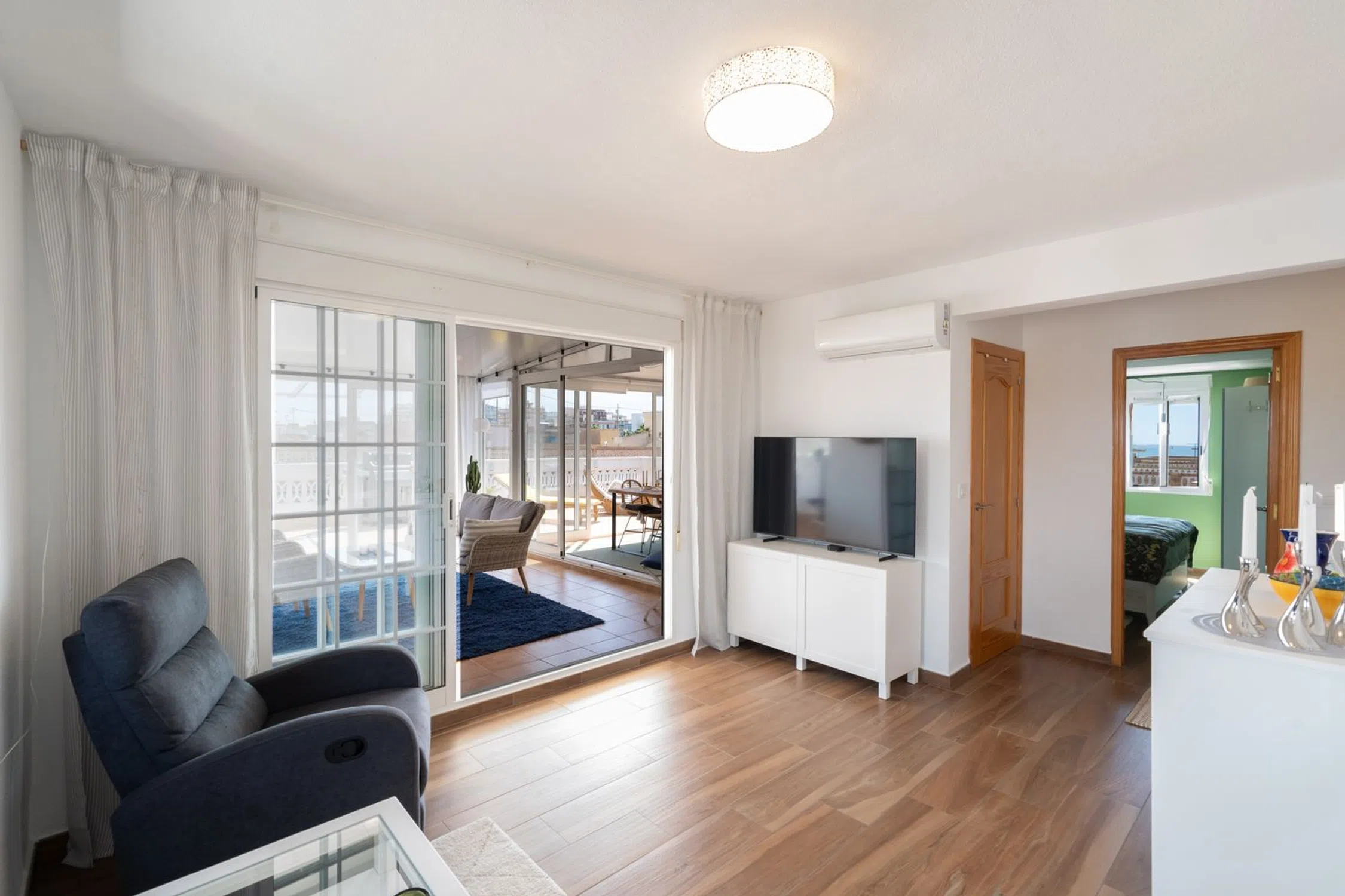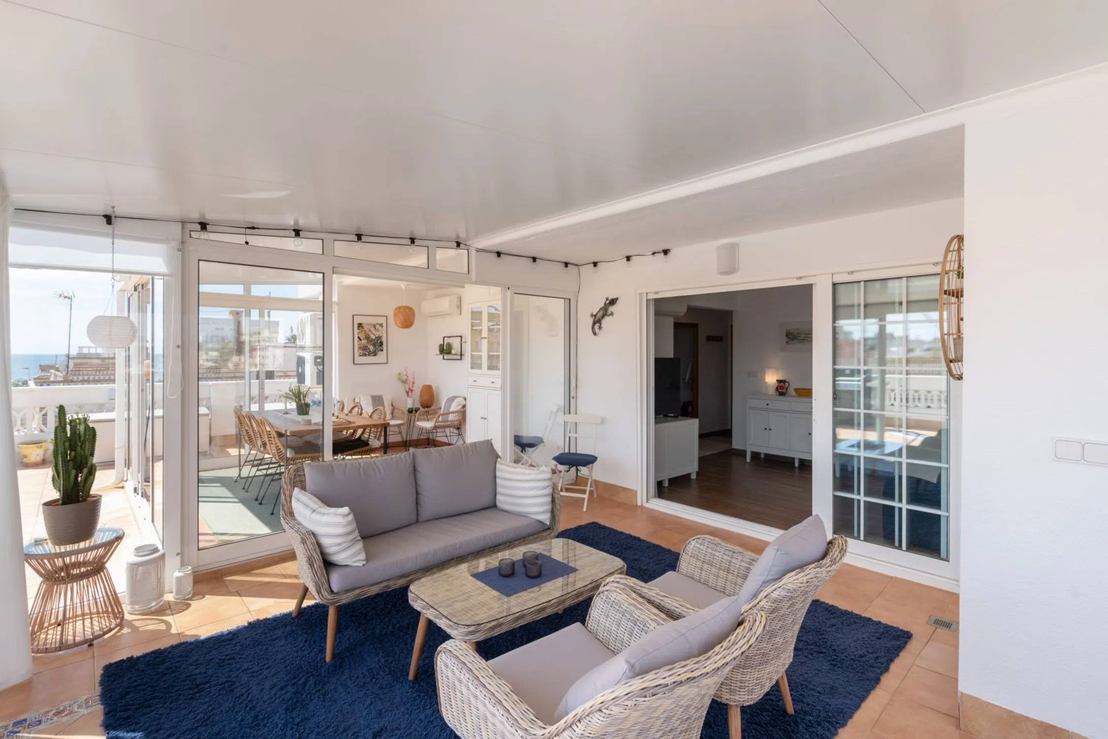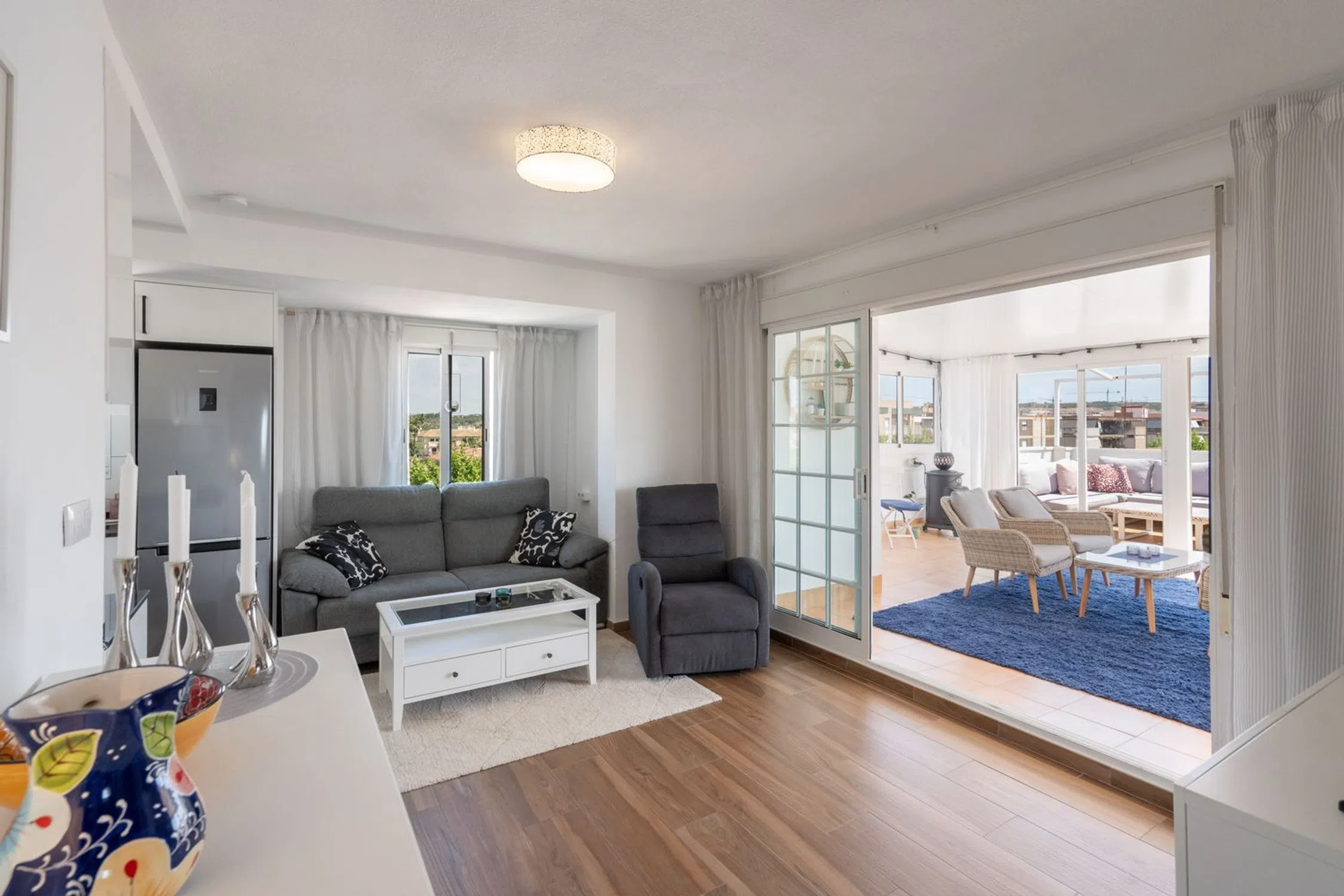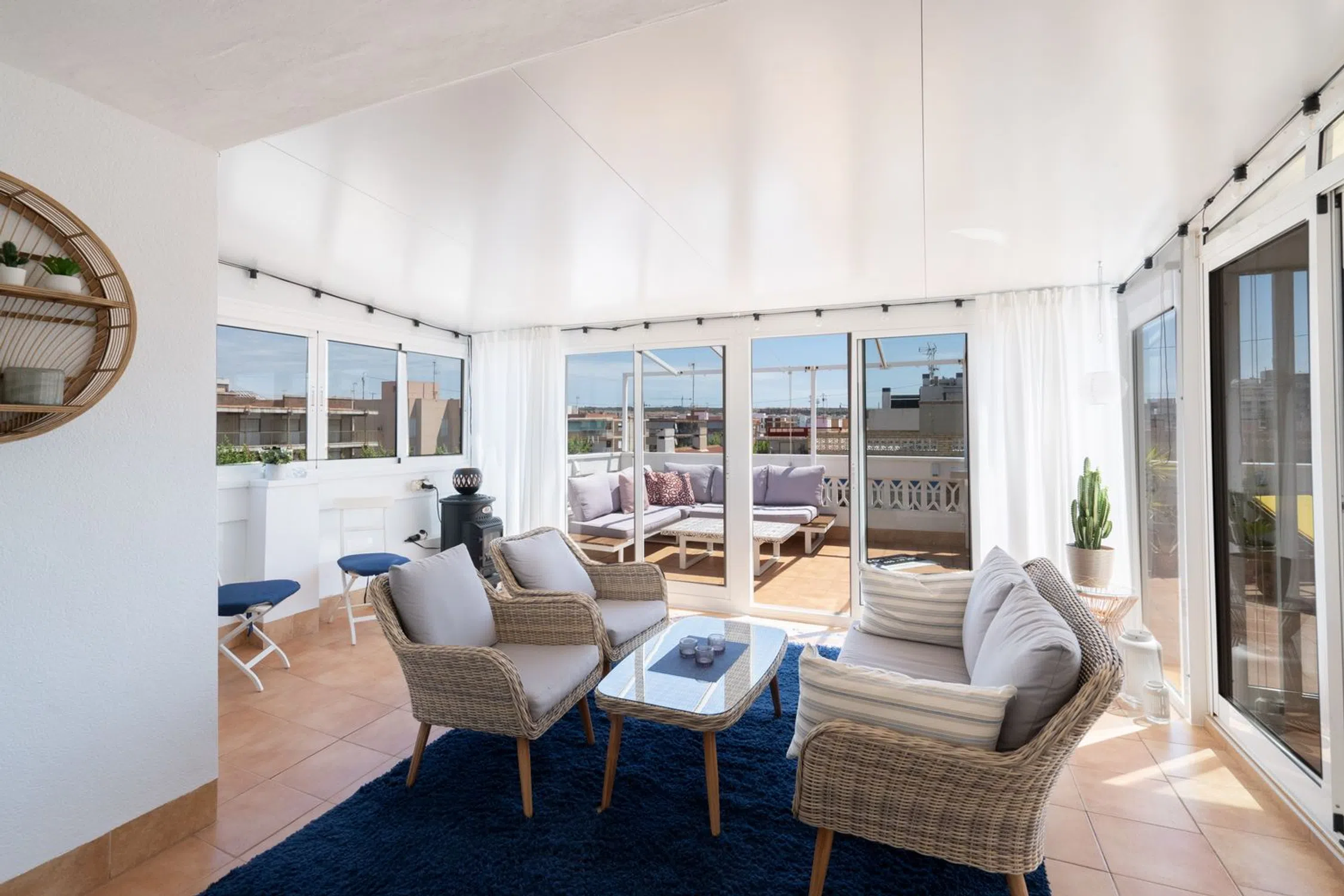 Bienvenido a este ático único y cuidadosamente reformado que ofrece un estilo de vida moderno fresco y cómodo con ese toque especial. La vivienda cuenta con dos dormitorios un baño elegante y una cocina y salón en concepto abierto con acceso directo a la amplia terraza. La mitad de la terraza está acristalada y convertida en un salón adicional y un generoso comedor perfecto para cenas durante todo el año. La parte abierta de la terraza ofrece mucho espacio para una zona de estar barbacoa solárium y además incluye un patio con lavandería trastero y ducha exterior. Se incluyen dos plazas de aparcamiento privadas dentro de la comunidad lo que hace la vida diaria aún más cómoda. La propiedad está situada en la popular zona de Gran Playa en Santa Pola a solo unos minutos a pie de la hermosa y amplia playa de arena con sus aguas tranquilas y familiares. Cerca encontrarás acogedores cafés restaurantes supermercados y todos los servicios necesarios. El animado paseo marítimo ofrece mercadillos heladerías y actividades para toda la familia. Al mismo tiempo vivirás en una zona tranquila con auténtico encanto español ideal tanto como residencia permanente como para vacaciones. Esta es una oportunidad única de adquirir un ático que combina confort moderno con una fantástica vida al aire libre bajo el sol a solo unos pasos del Mediterráneo. Bienvenido a casa.
