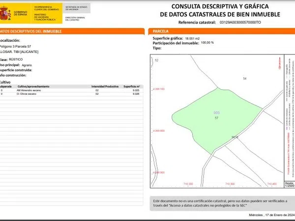¡Parcela con vistas de ensueño en Tibi! ¿Buscas un lugar único para construir la casa de tus sueños? ¡Esta parcela es para ti! Ubicación privilegiada: A solo 5 minutos en coche de Tibi, un encantador pueblo con todo lo que necesitas. A 20 km de Alicante, donde podrás disfrutar de su amplia oferta cultural, gastronómica y de ocio. A 25 km del aeropuerto, ideal para viajes nacionales e internacionales. A 25 km de la playa, para que puedas disfrutar del sol y el mar siempre que quieras. Un entorno natural incomparable: Imagínate vivir rodeado de la impresionante belleza de la Sierra de Maigmó y las Montañas de la Peña Roja. Desde tu casa podrás disfrutar de vistas panorámicas de bosques frondosos y pura naturaleza, un entorno ideal para relajarse y desconectar del ritmo frenético de la ciudad. Características de la parcela: Superficie: 18.052 m² Edificabilidad: Permite la construcción de una vivienda unifamiliar de hasta 361 m² Acceso: Camino de tierra para facilitar la entrada y salida de vehículos. Luz: Posibilidad de instalación de placas solares para un suministro de energía sostenible. Vistas: Impresionantes vistas a la Sierra de Maigmó y las Montañas de la Peña Roja. Un proyecto a tu medida: Esta parcela te ofrece la oportunidad de construir la casa de tus sueños, con espacio suficiente para toda tu familia y amigos. Imagina una vivienda con amplias estancias, mucha luz natural y unas vistas de ensueño. ¿Por qué elegirnos? En Victory house, somos expertos en la gestión de proyectos inmobiliarios y te acompañaremos en cada paso del proceso, desde la búsqueda de la parcela hasta la construcción de tu vivienda. Contamos con un equipo de profesionales altamente cualificados y con una amplia experiencia en el sector, que te garantizarán un proyecto de calidad y adaptado a tus necesidades. No dejes escapar esta oportunidad única de crear tu propio refugio en un entorno natural incomparable. ¿Listo para vivir en el lujo y la naturaleza? ¡Contáctanos hoy mismo para conocer más detalles sobre esta increíble villa! Visita nuestra página web Victoryhouse. es y descubre todo lo que podemos ofrecerte.